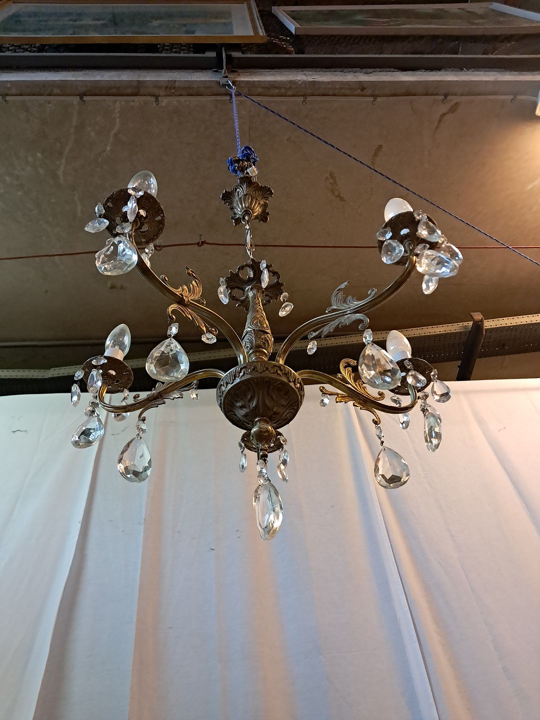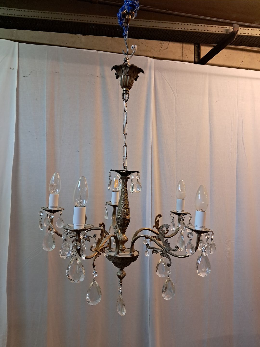 Lysekrone i metal med glasprismer, fra 1950erne.