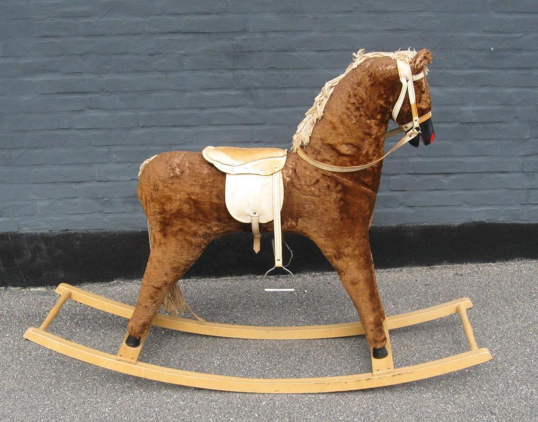 Gyngehest i træ, stor med gænger. Plyspels og læder saddel og remme. Garnmanke og hale. 20. årh. L.: 150 cm. B.: 38 cm. H.: 105 cm.