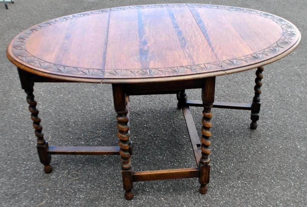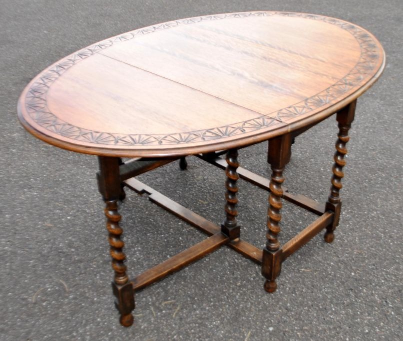 Engelsk gateleg bord i egetræ, 19. årh. Med drejede ben. Med dekoration på plade. H.: 73 cm. B.: 105 cm. D.: 48 cm. Udslået: 148 cm.