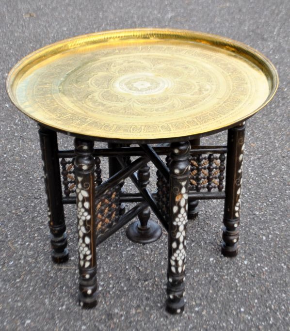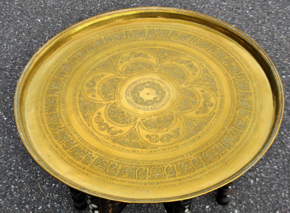 Arabisk rygebord med messingplade, 19./20. årh. Messsingplade dekoreret med mønstre. Understel i træ med indlagt perlemor. H.: 49 cm. Dia.: 59 cm.