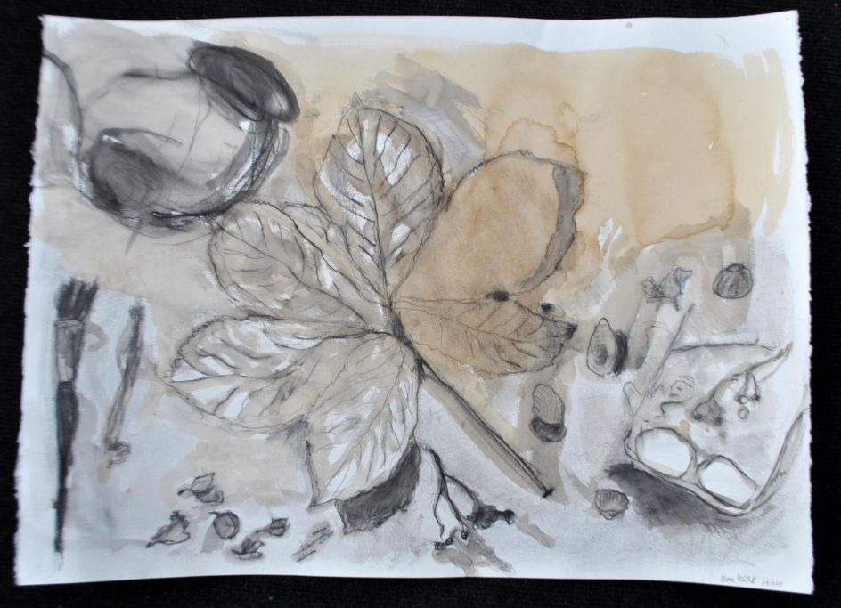 Kühl, Lena (1950 -) Danmark: Kastanjeblad, 2024. Akvarel og blyant på papir. Signeret: Lena Kühl 29.10.24. H: 56 cm. B: 76 cm.