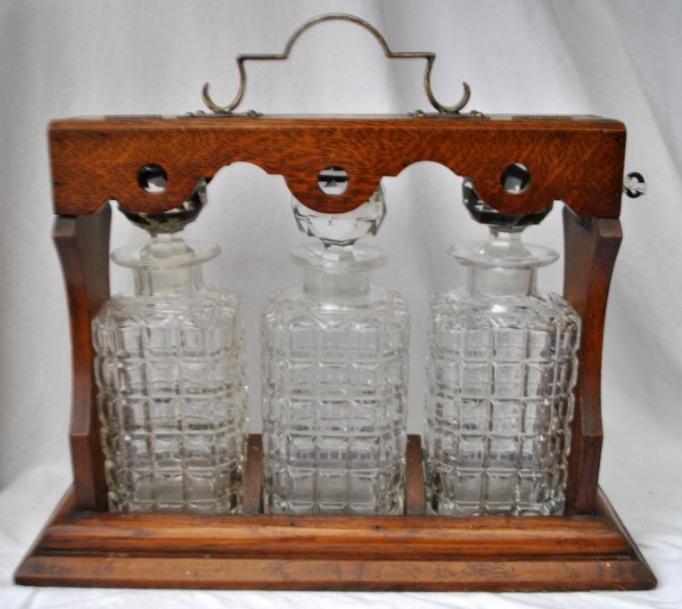 Engelsk tantalus med tre krystal karafler, 19. årh. Egetræ. Med messingbeslag og lås med nøgle. H: 33 cm. L: 37 cm.
