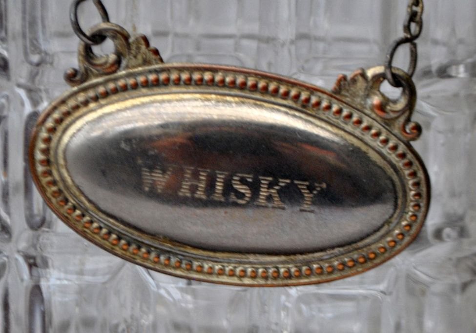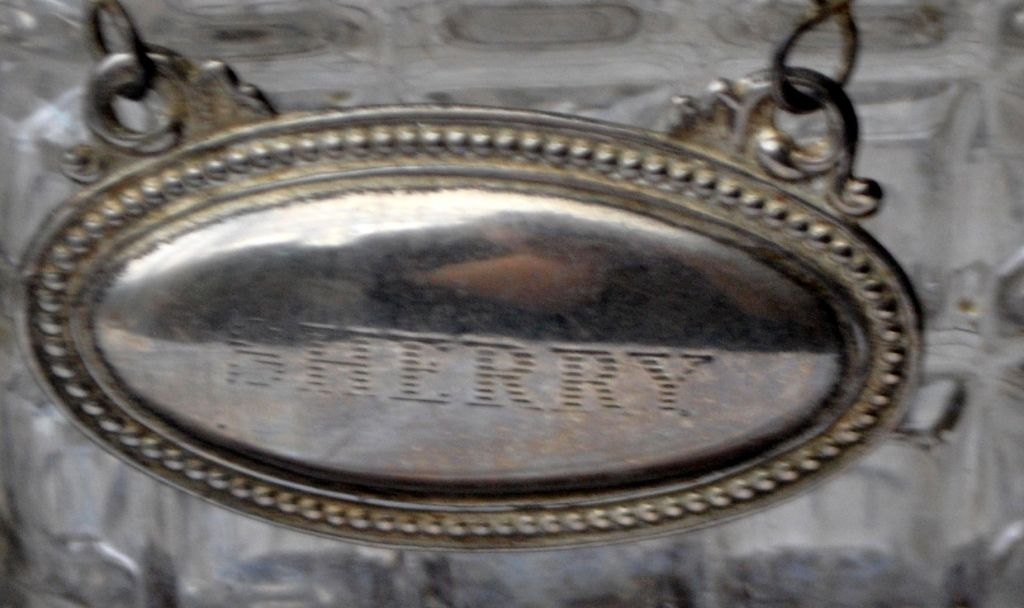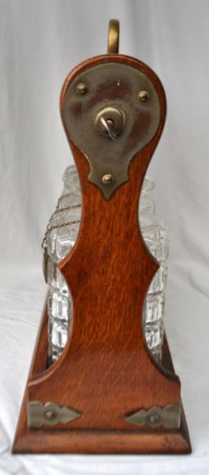 Engelsk tantalus med tre krystal karafler, 19. årh. Poleret egetræ. Med messingbeslag og lås med nøgle. Karafler forsynede med forsølvede skilte for brandy, sherry og whisky. H: 31 cm. L: 35 cm.