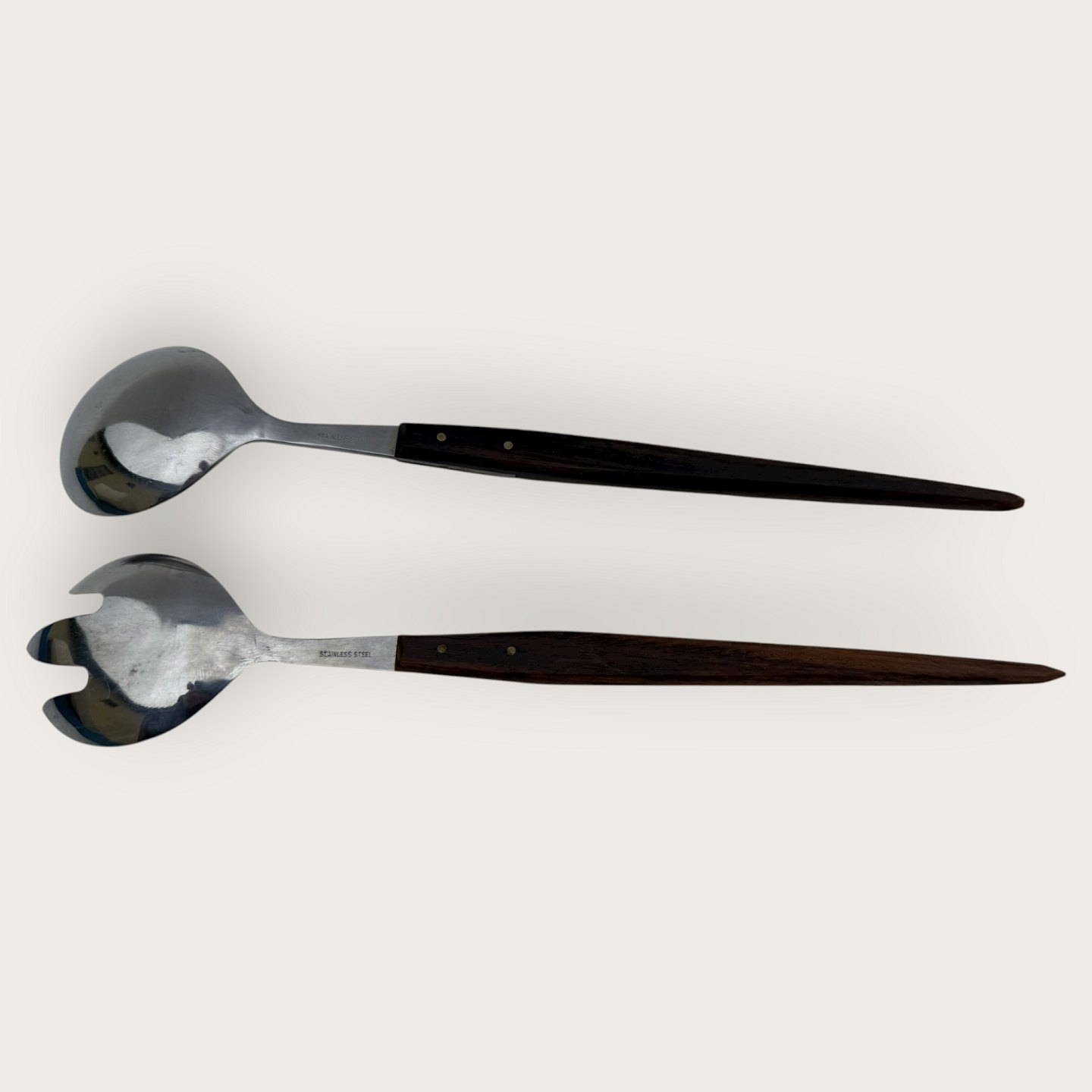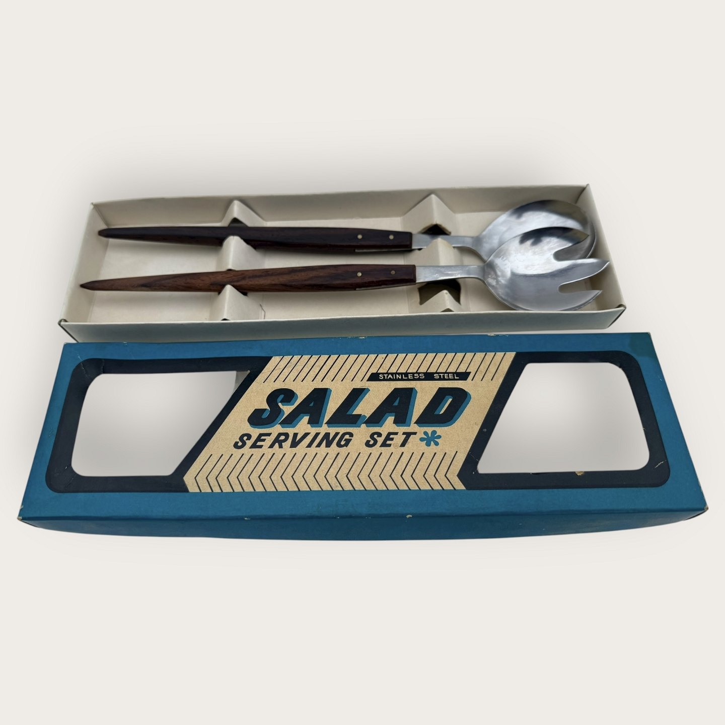 Salatsæt i teaktræ og stål fra 1960'erne, i originalæske, 25cm langt *Æske noget slidt ellers fin stand*