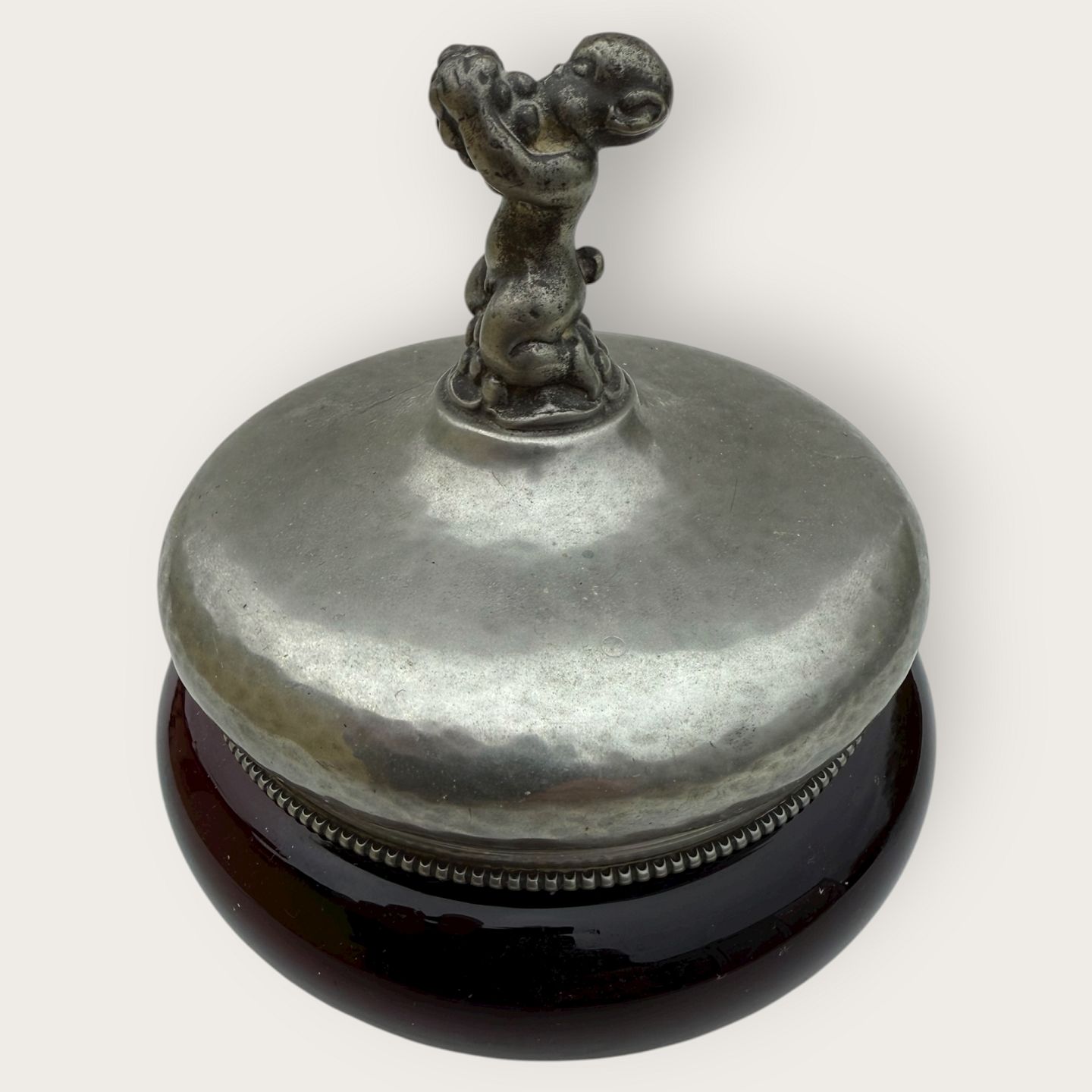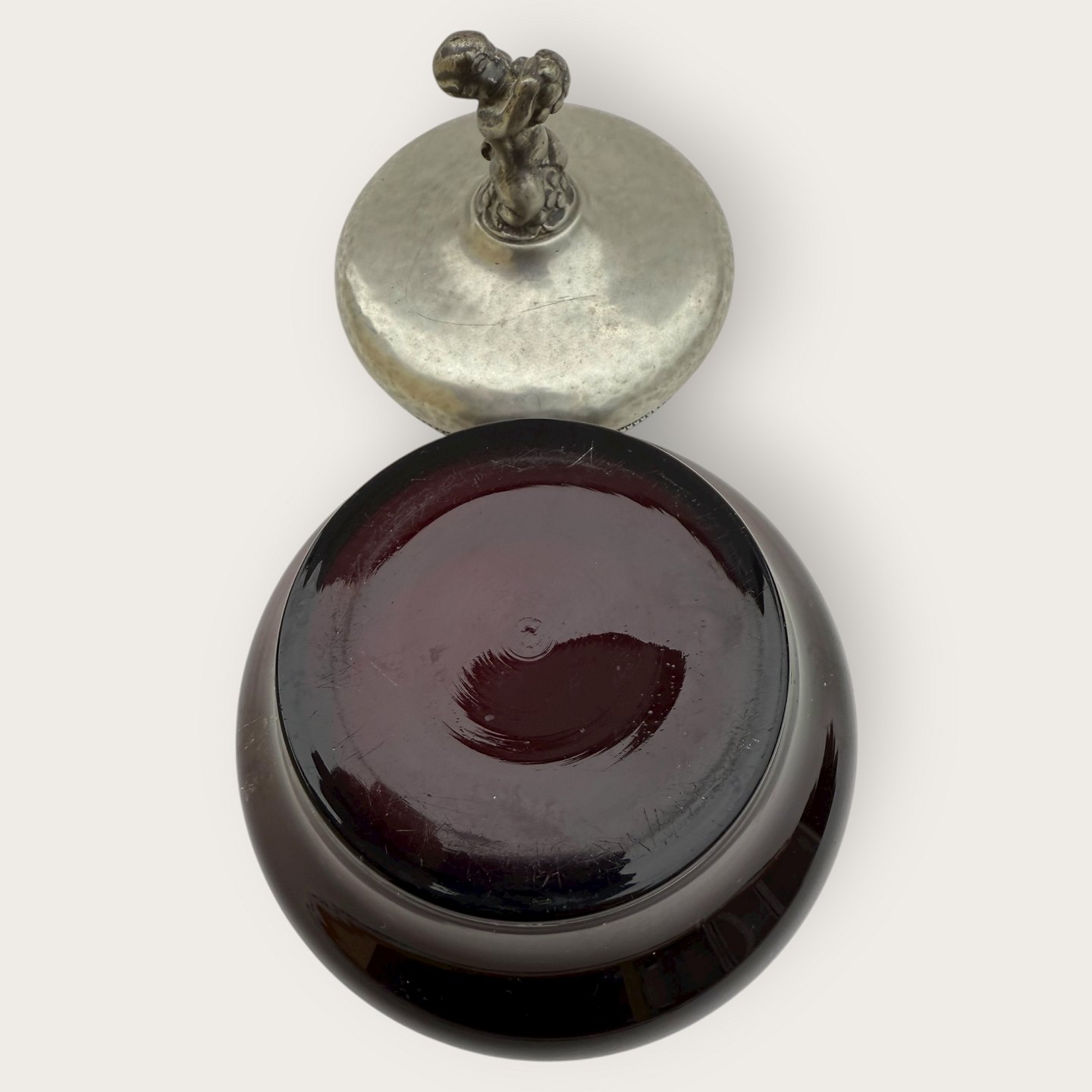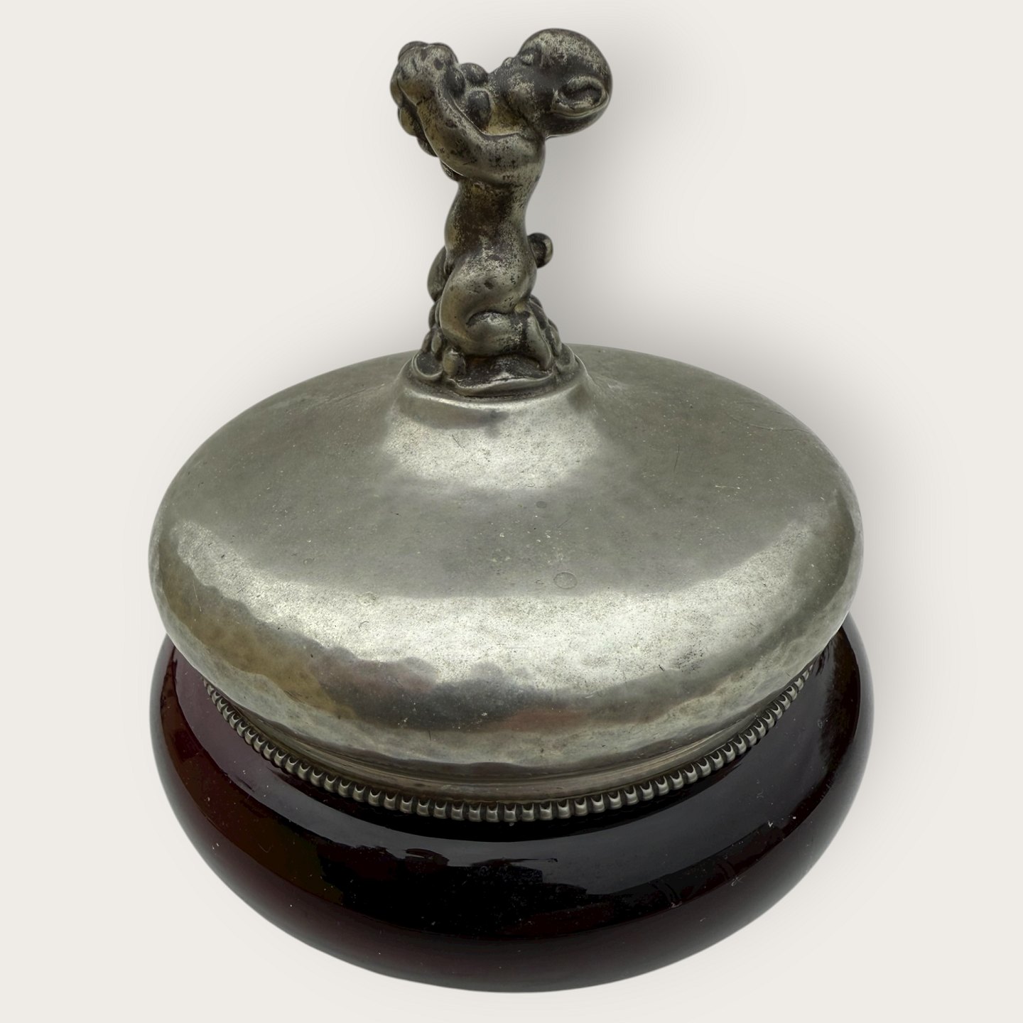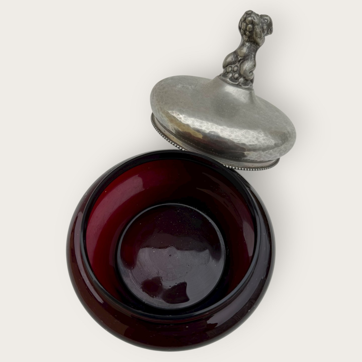 Einar Dragsted, Rød glasskål med låg af tin og figuren Bacchus / Dionysos på midten af låget, låget stemplet indvendigt med grif og ED for Einar Dragsted, Højde 15cm, diameter 13cm *pæn patineret stand*