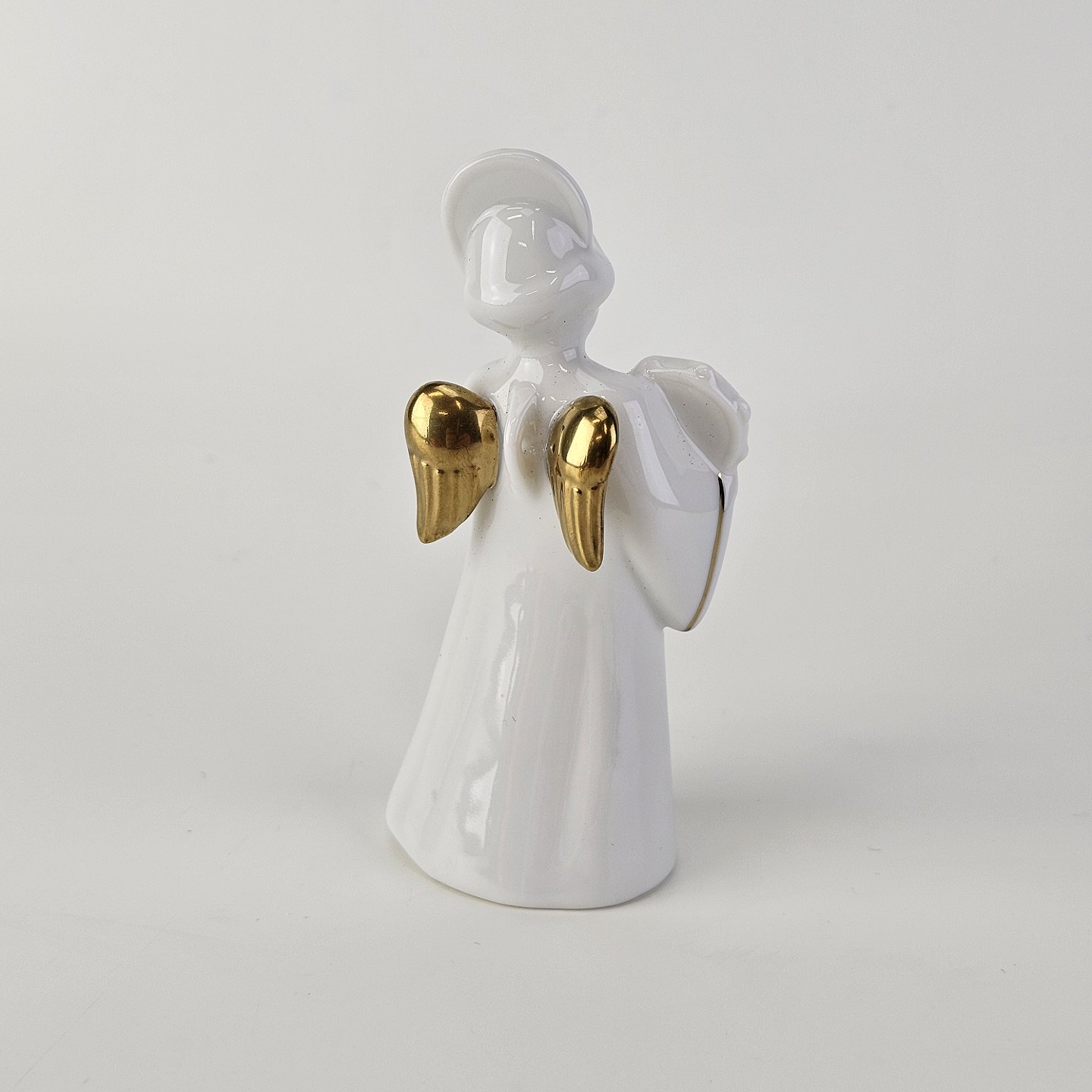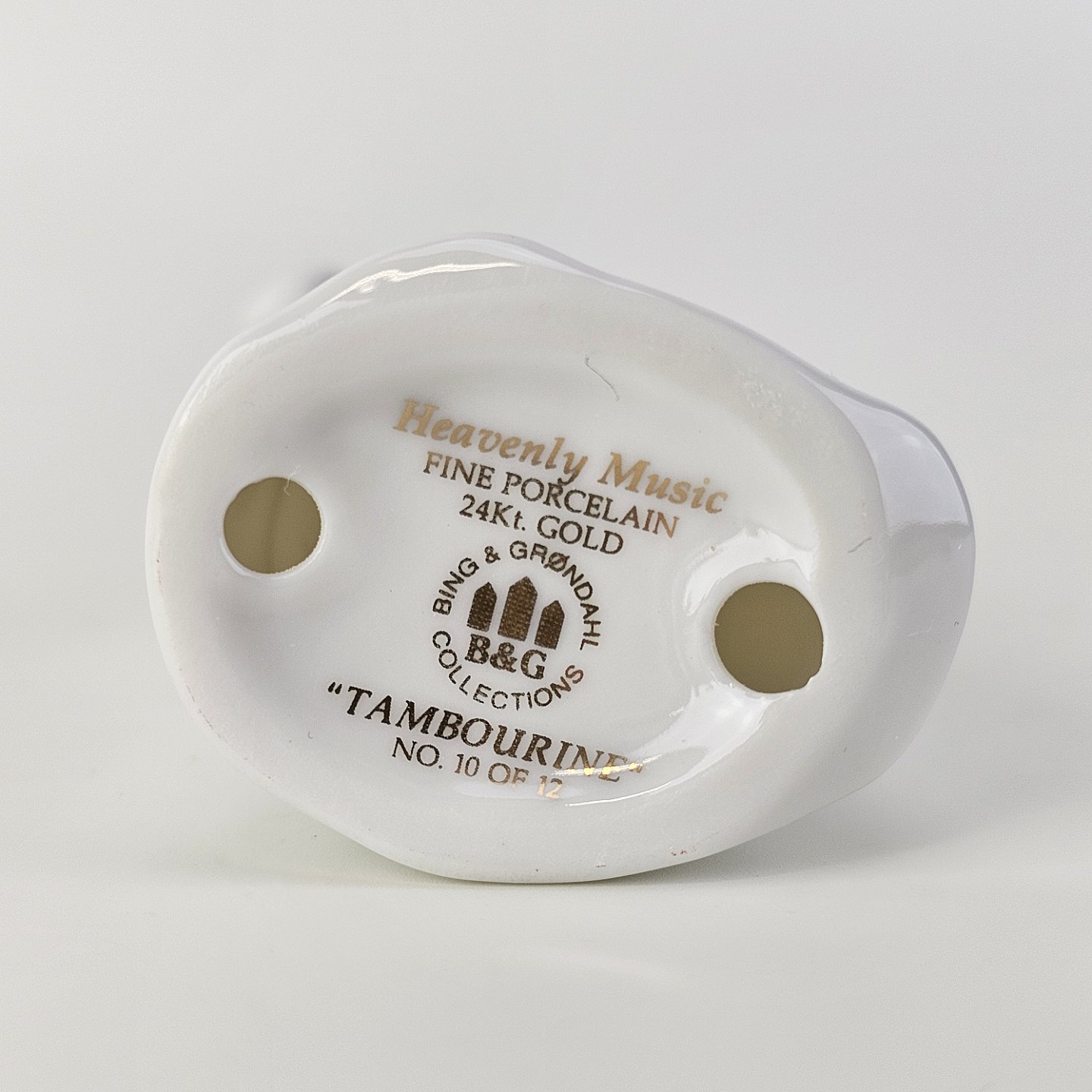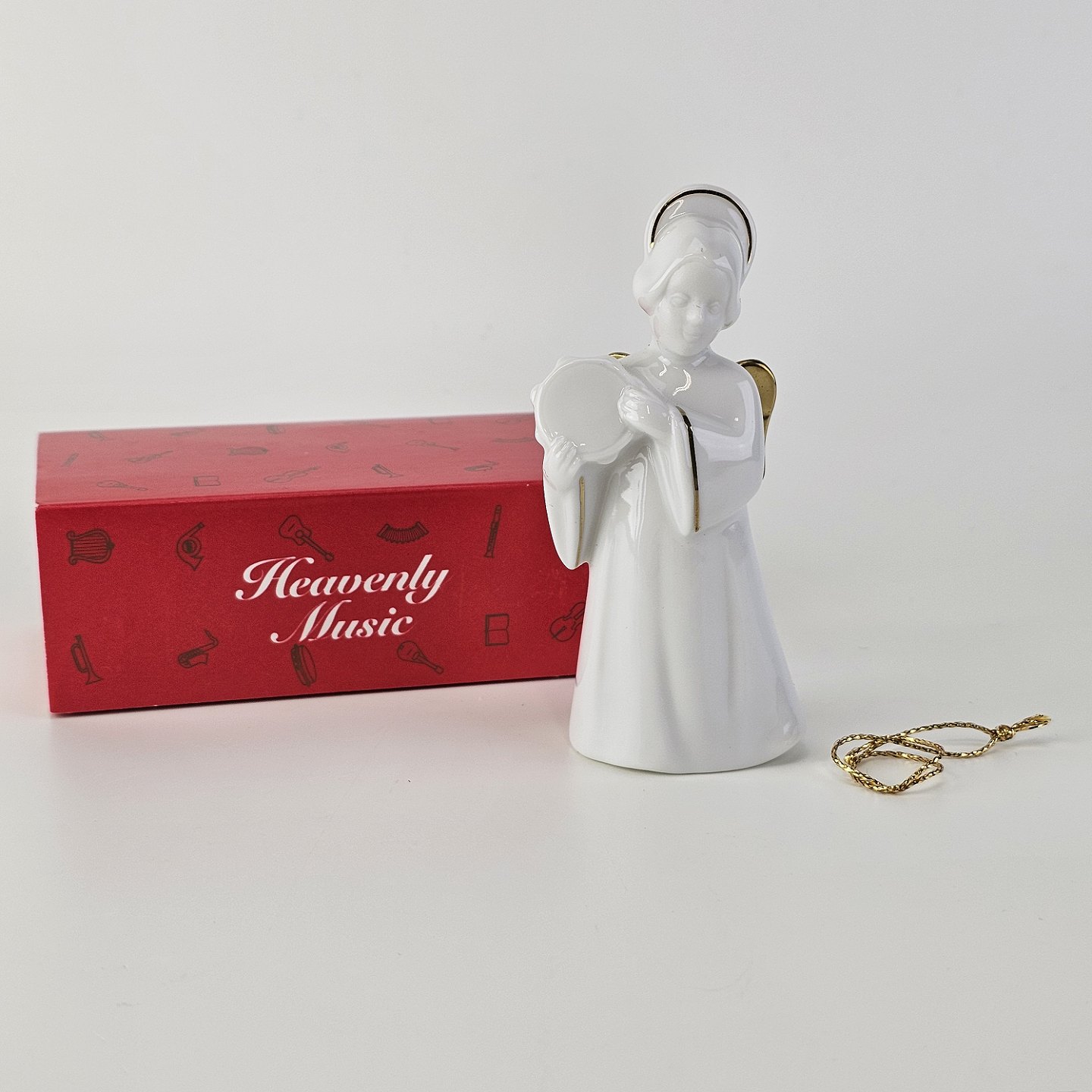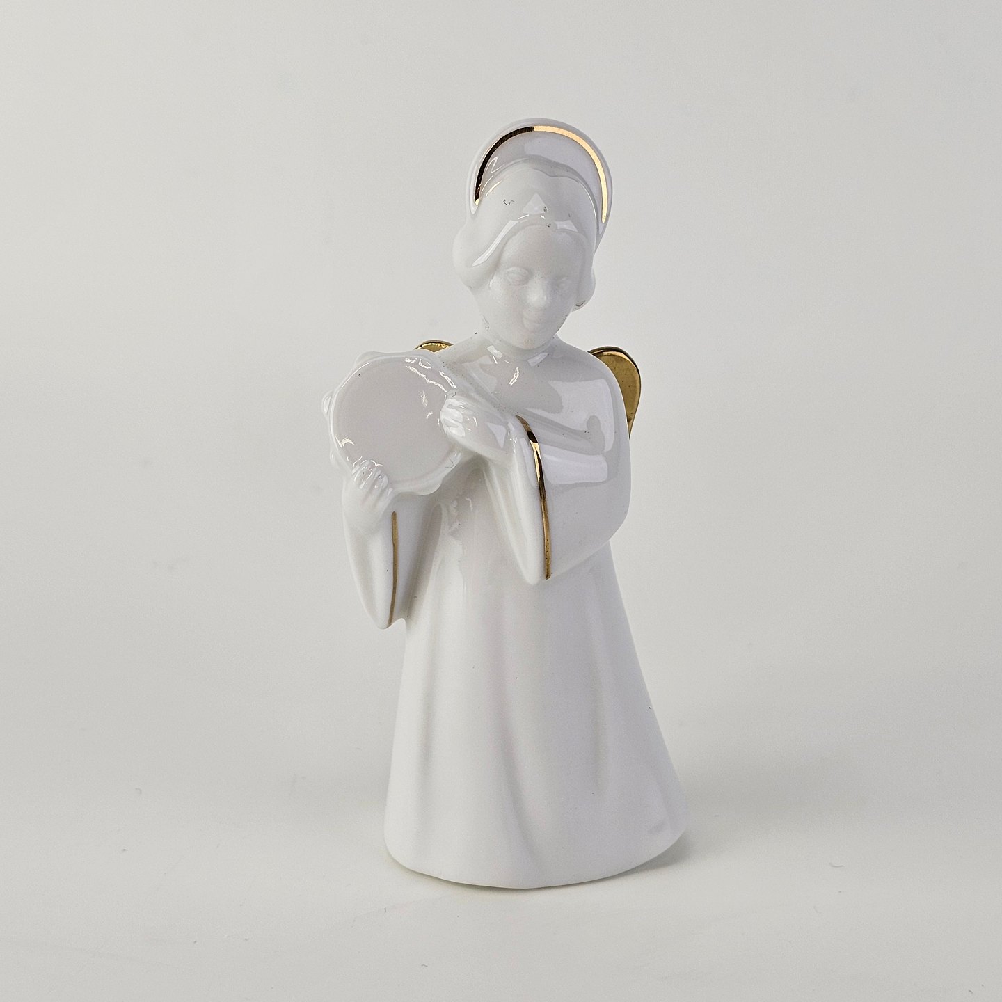 Figur med motiv af en engel med en tamburin. Figuren er i hvidt porcelæn med forgyldte vinger og detaljer i 24 karat guld.