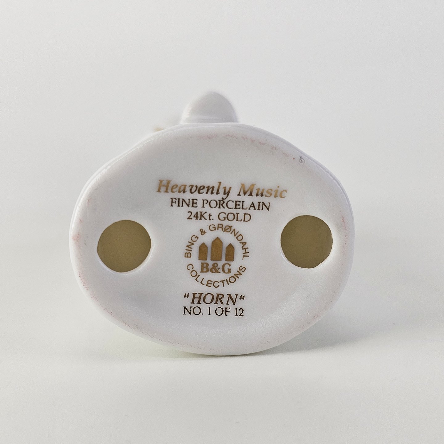 Figur med motiv af en engel som spiller på horn. Figuren er i hvidt porcelæn med forgyldte vinger og detaljer i 24 karat guld.