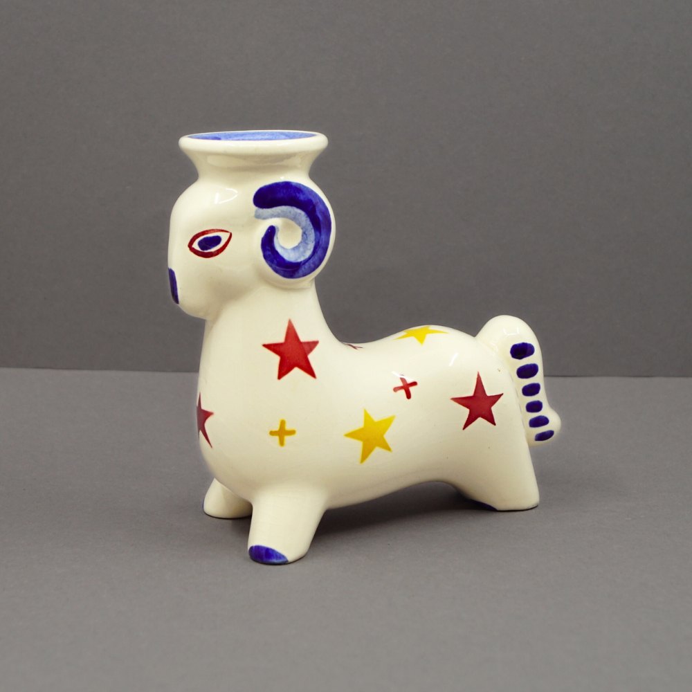Aluminia; Julebuk i fajance. I blå, rød og gul. Med plads til et lys. H. 10 cm. L. 11 cm.