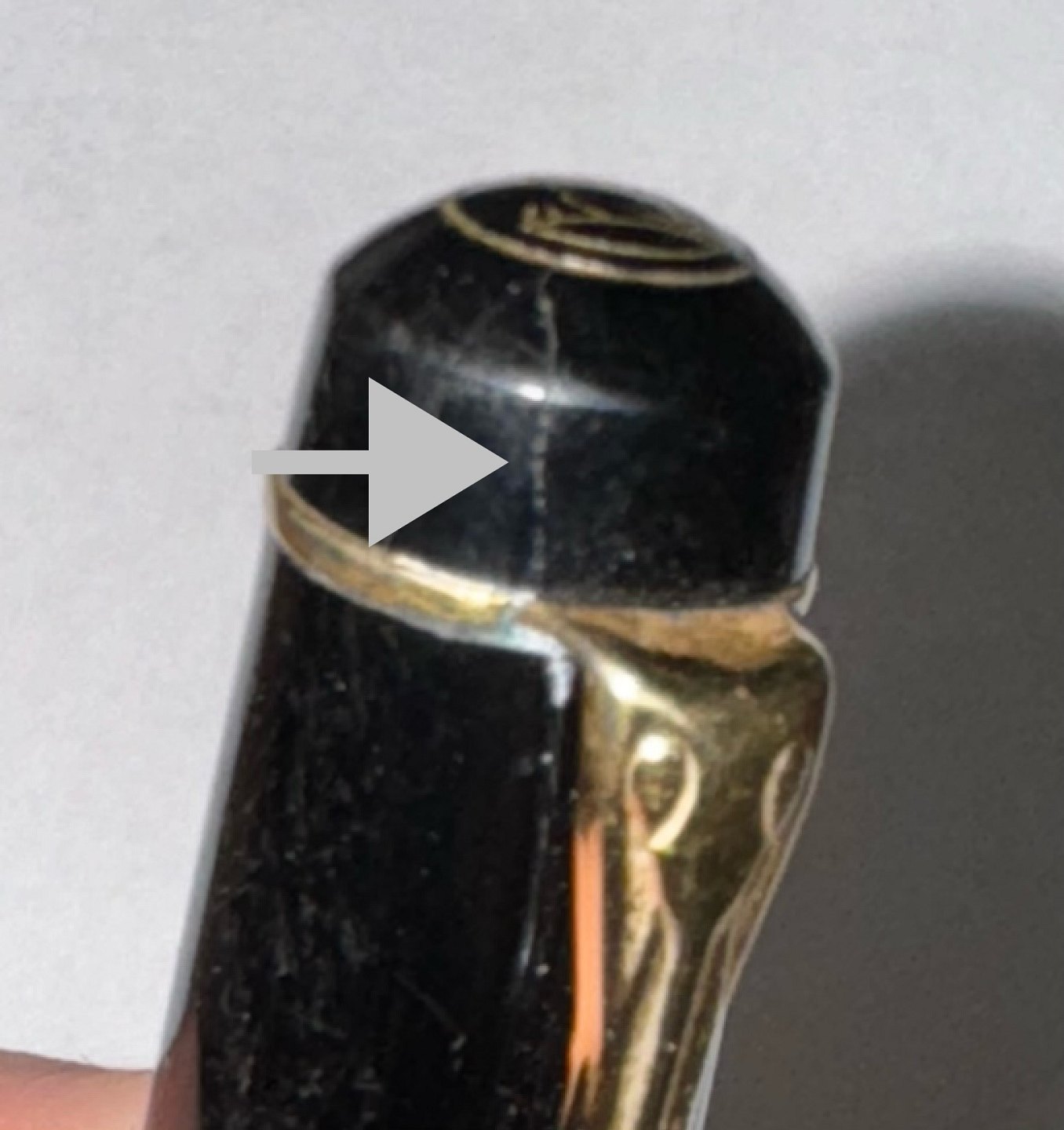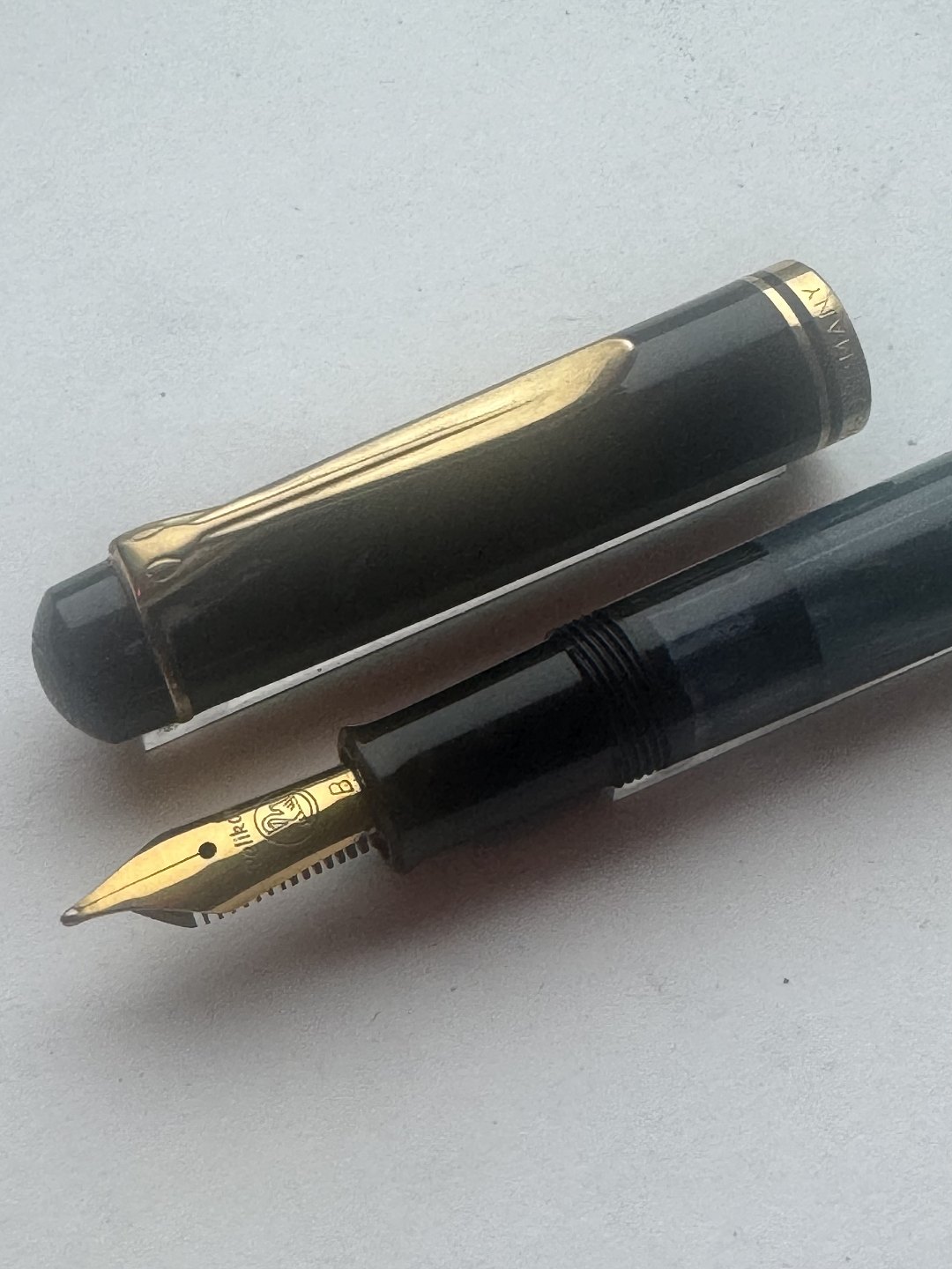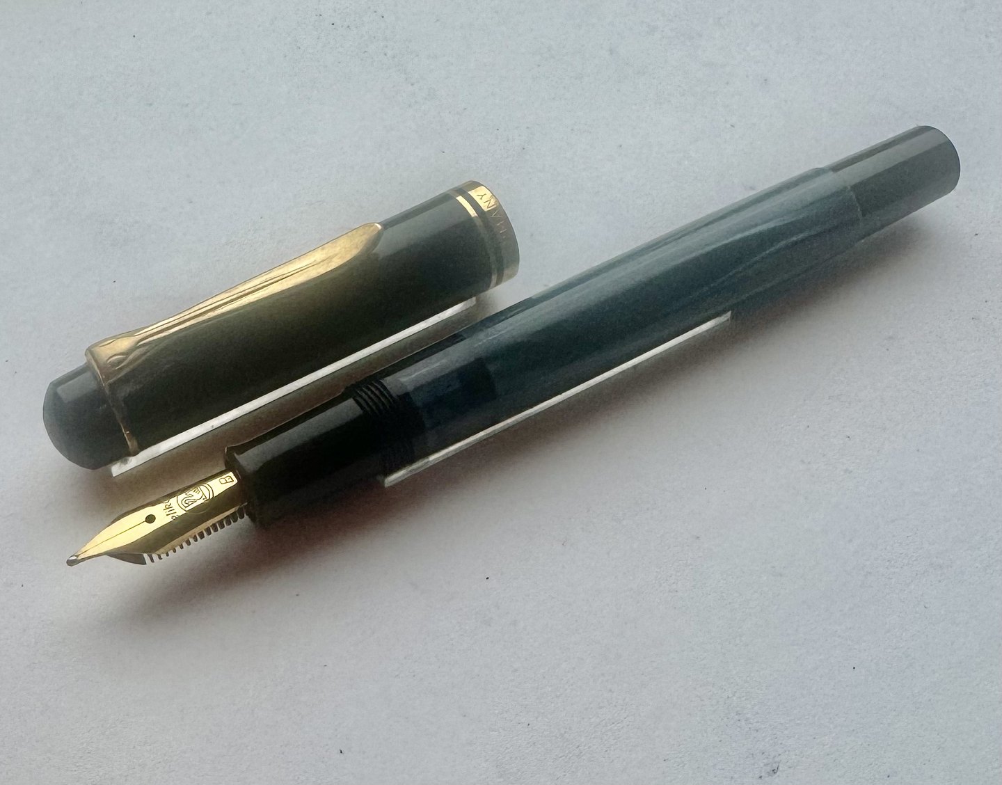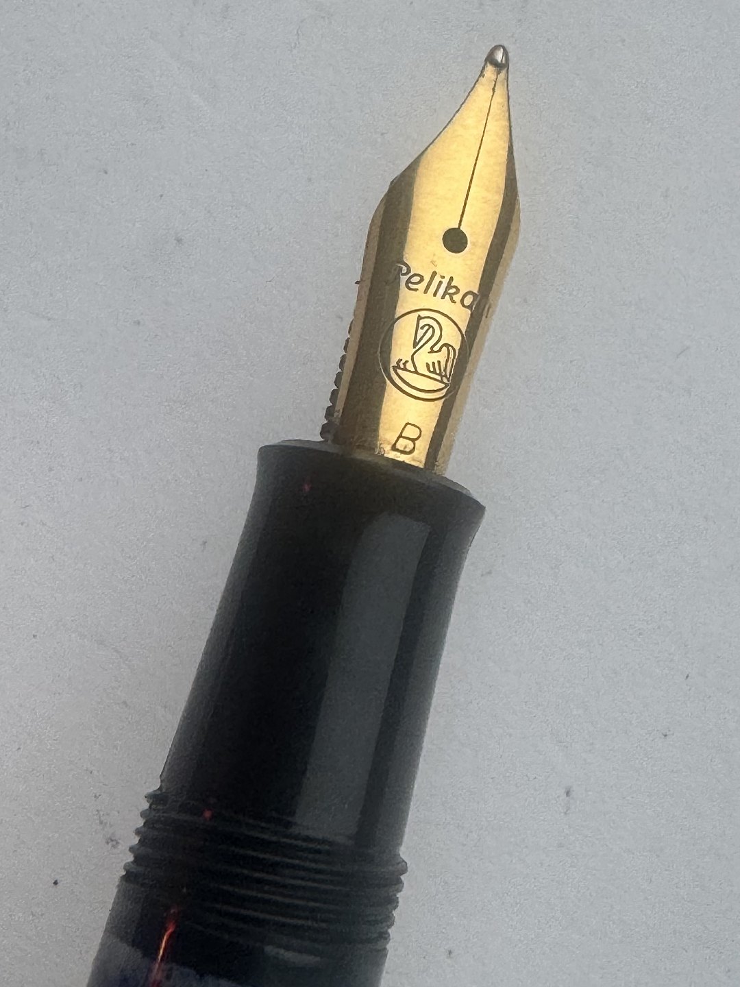 Pelikan M200 fyldepen. Fremstillet i Vest-Tyskland i 1970’erne. Den lille kapsel med logo på toppen af hætten har en revne (se foto). Eller i god funktionsduelig stand.