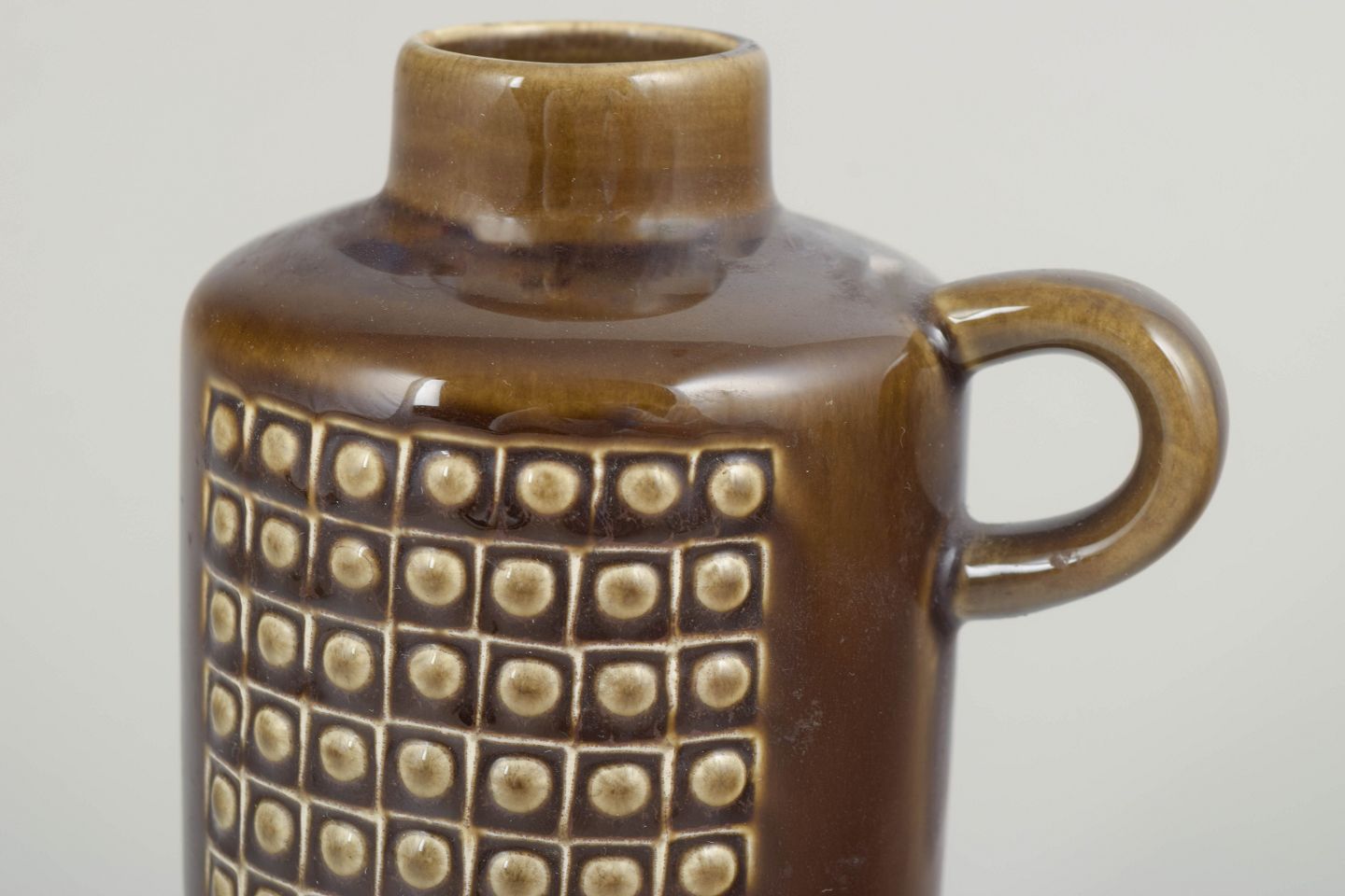 Elegant keramisk kande i brun glasur med geometrisk reliefmønster i kubisk design. Serien Kub repræsenterer Nylunds modernistiske formsprog med fokus på funktion, struktur og tidløs æstetik.