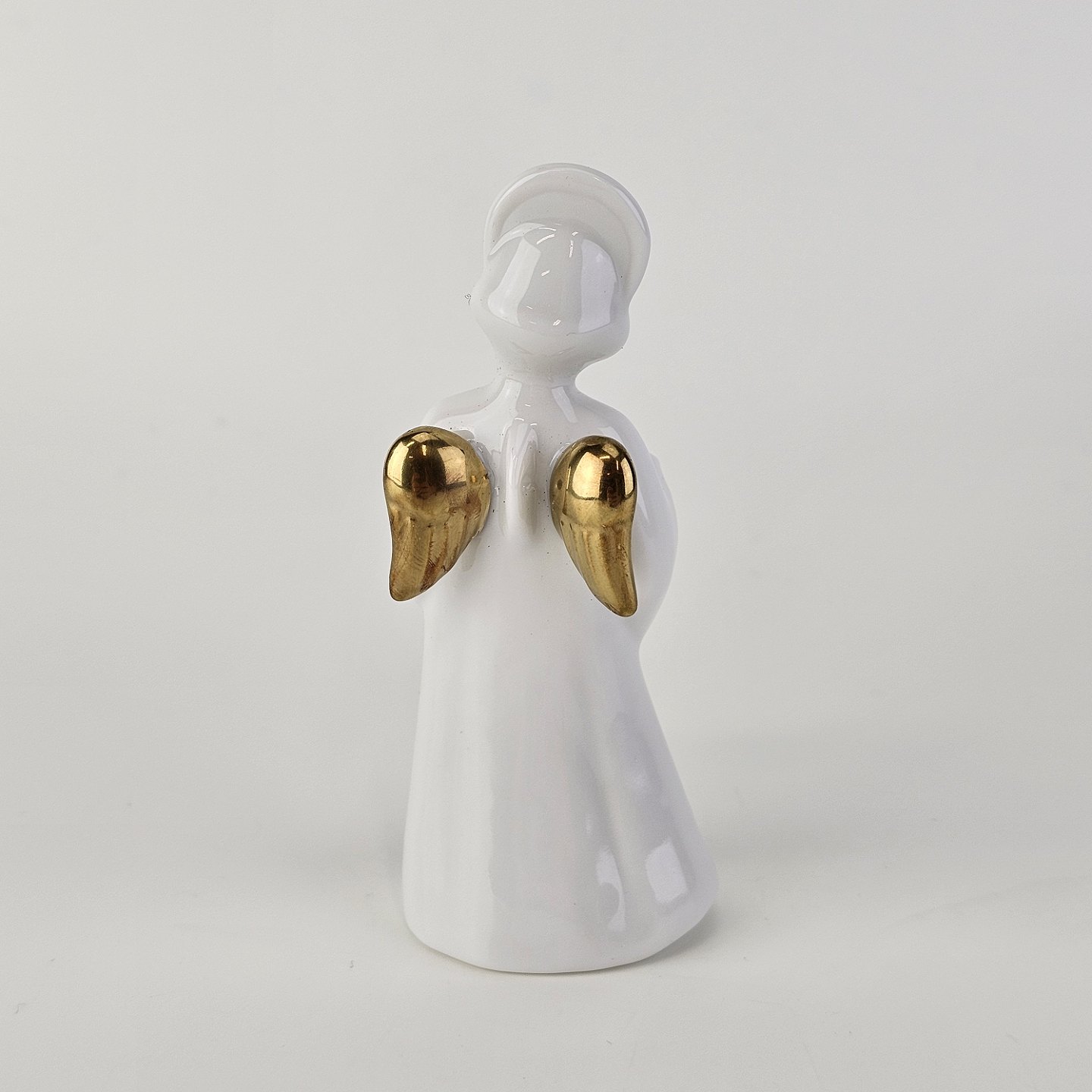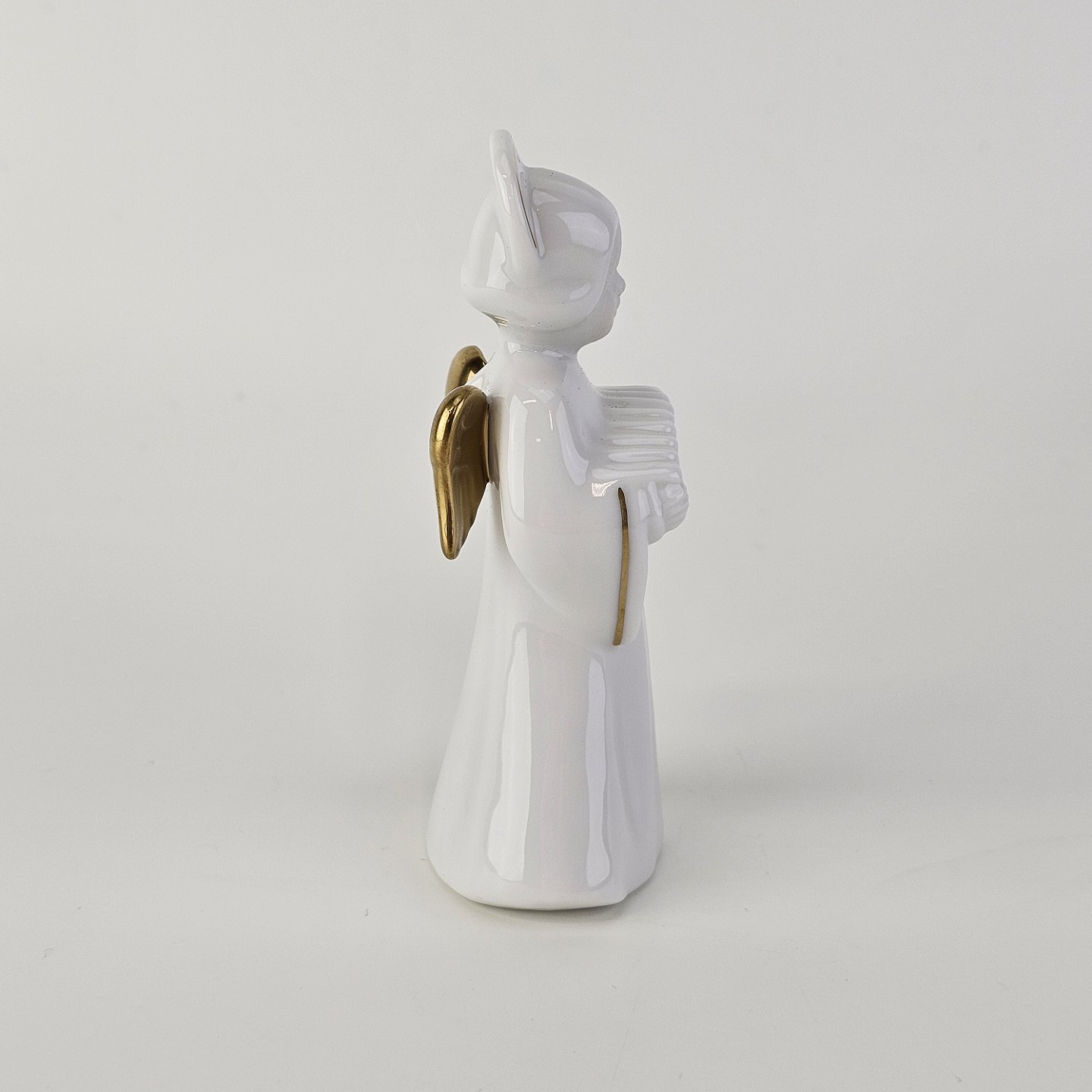 Figur med motiv af en engel som spiller på harmonika. Figuren er i hvidt porcelæn med forgyldte vinger og detaljer i 24 karat guld.