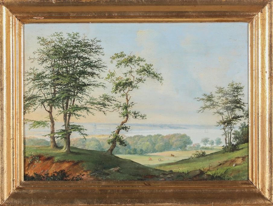 Holm, Peter (1798 - 1875) Danmark: Sommerlandskab med udsigt til Århus Bugten og byen. Set fra Frederikshøk, Højbjerg. Olie på metalpladse. Sign.: PH 1846. 18 x 25 cm.