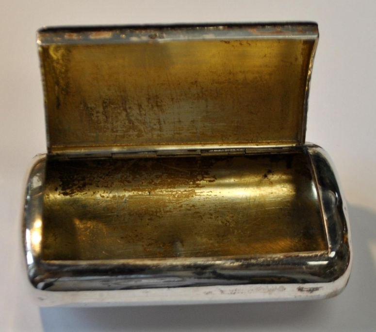 Svensk snus tobaks æske i sølv, 19. årh. Med dekoration på låg. Indvendig forgyldt. Stemplet. 8 cm. B: 5 cm.