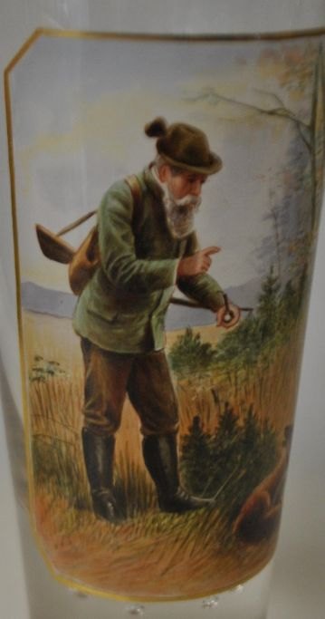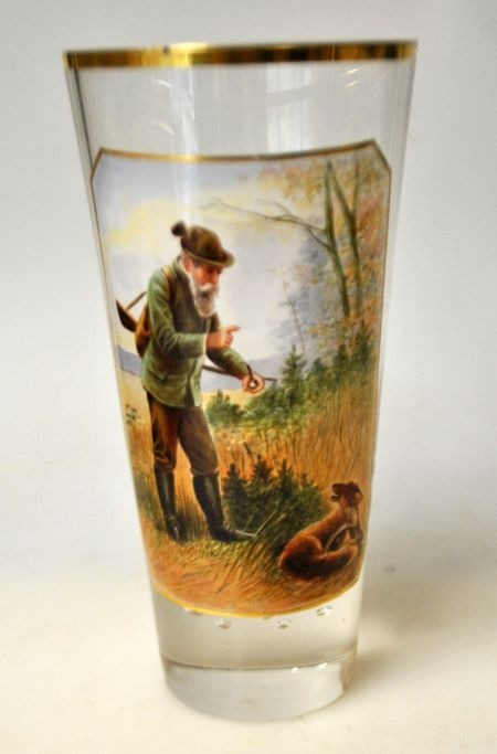 Tysk drikkeglas, 19. årh. Med jægermotiv i overteknik med emalje. Med forgyldninger. H.: 17,5 cm. Indvendig i fod med luftbobler.