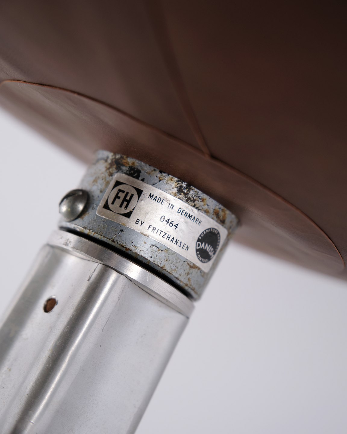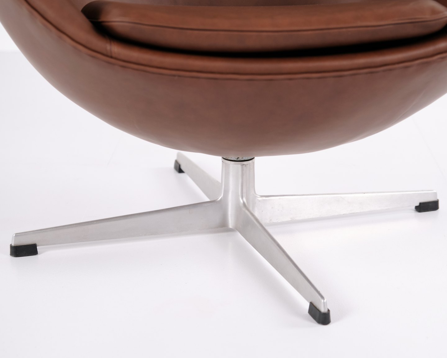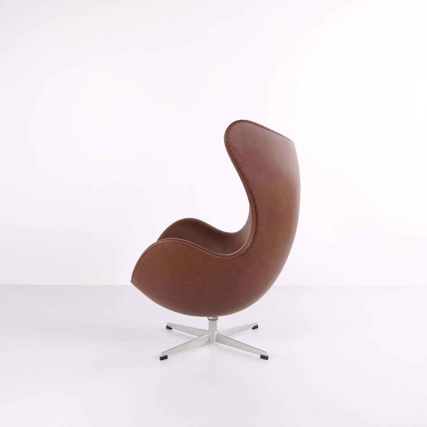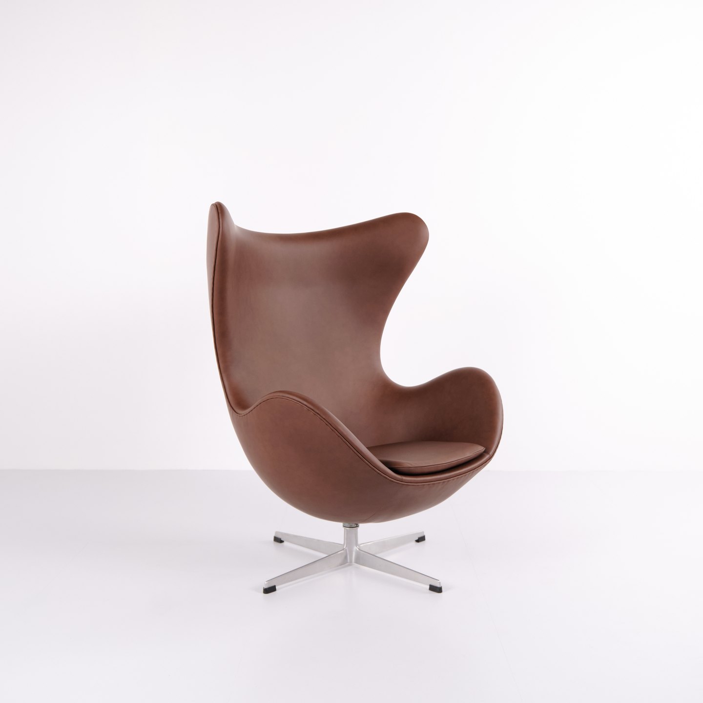 Arne Jacobsen Ægget, model 3316 fra Fritz Hansen. Ny­polstret i brunt læder. Et dansk designikon fra 1958.
