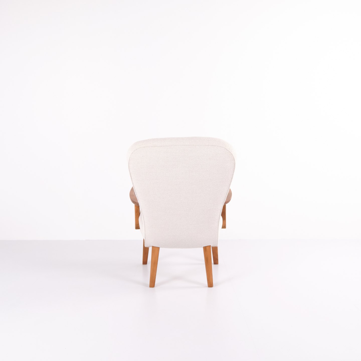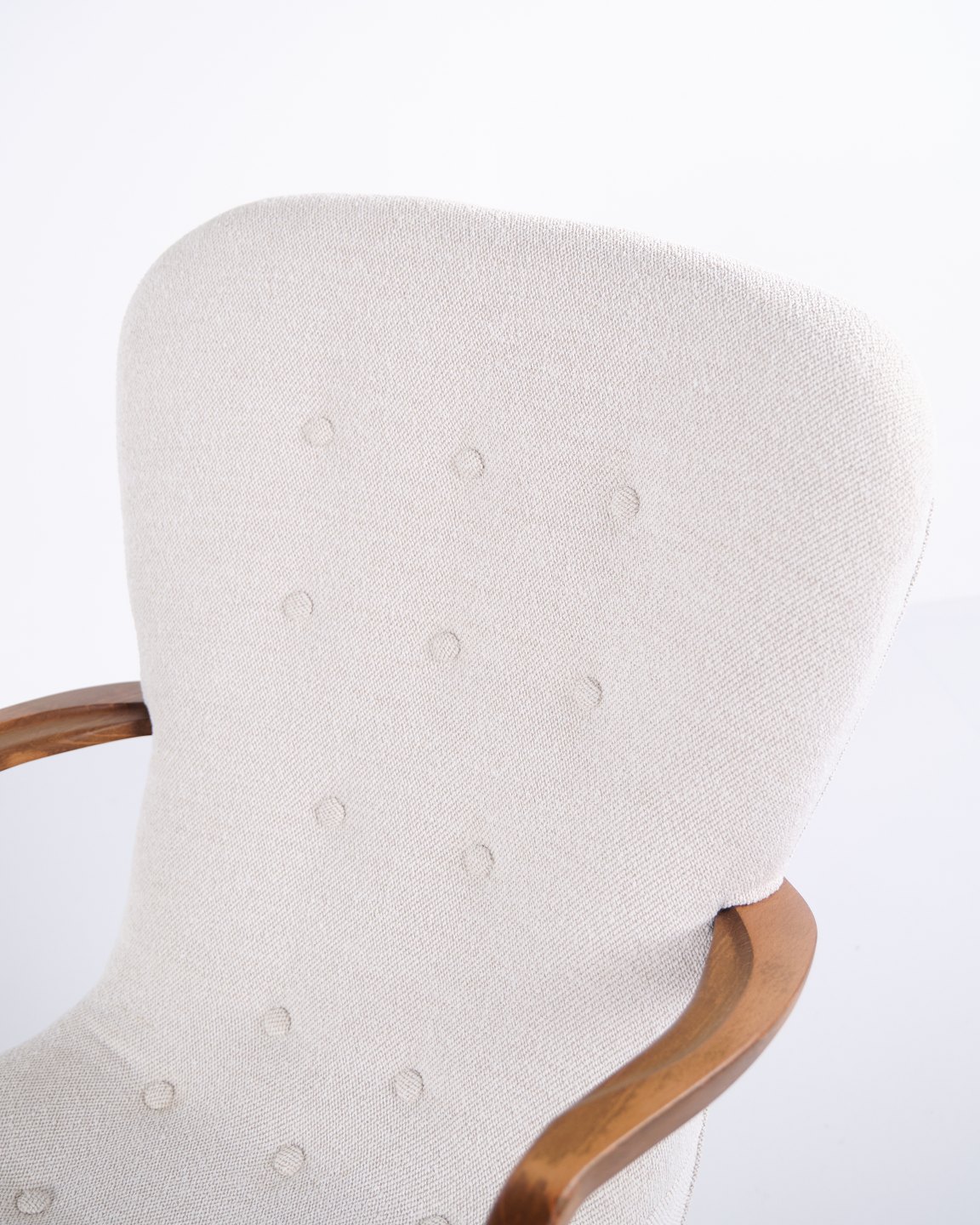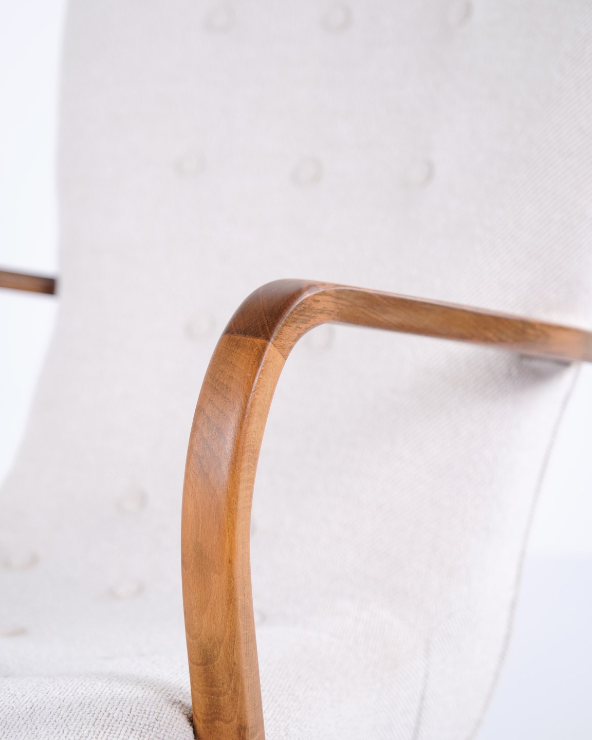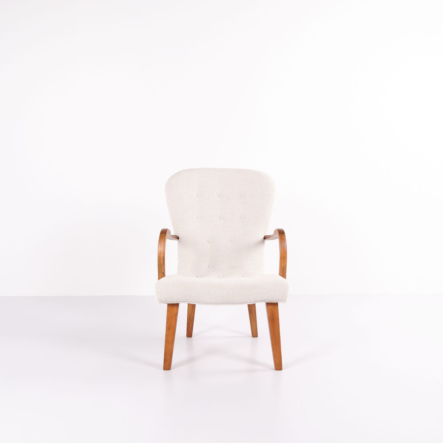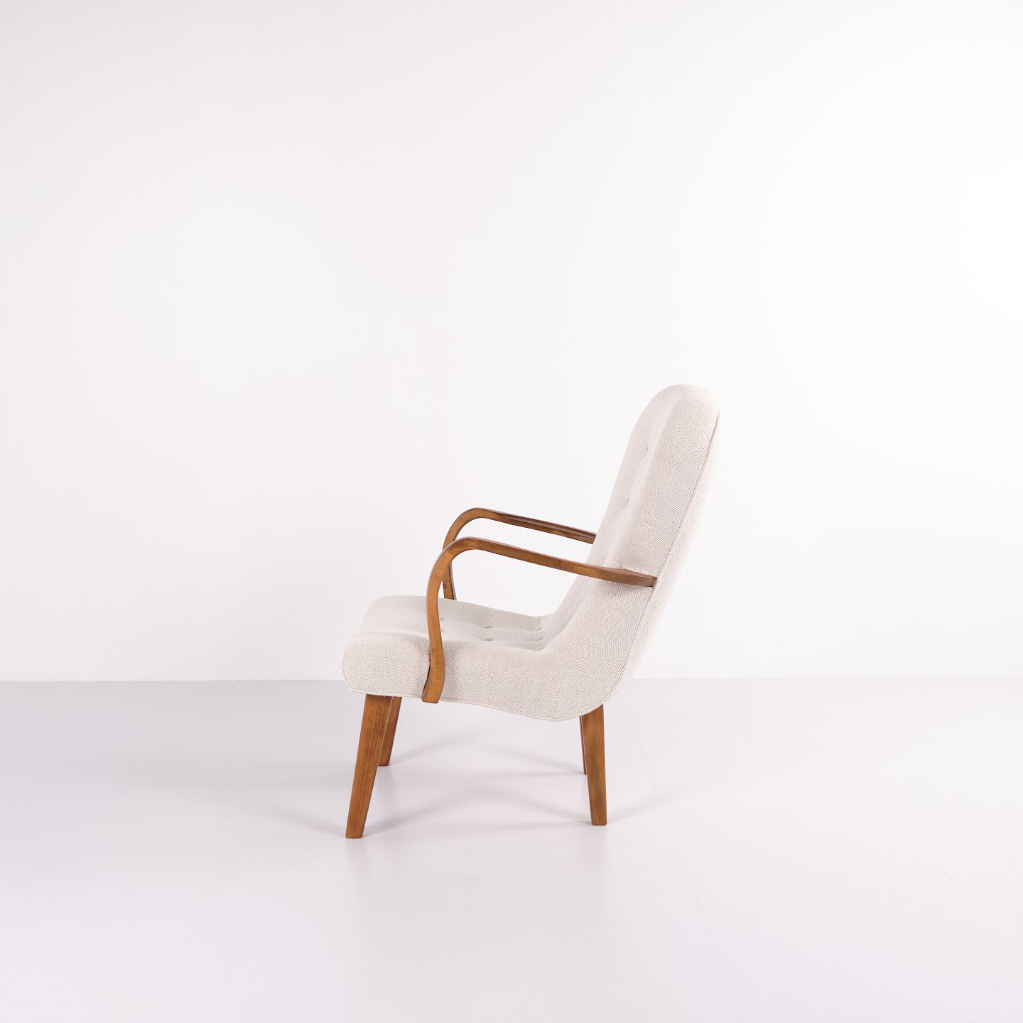 Klassisk lænestol fra 1940’erne, betrukket med lyst stof og udført i et tidstypisk, afrundet formsprog. Stolen har en elegant, opret ryg og let buede armlæn. Designet af Alfred Christiansen