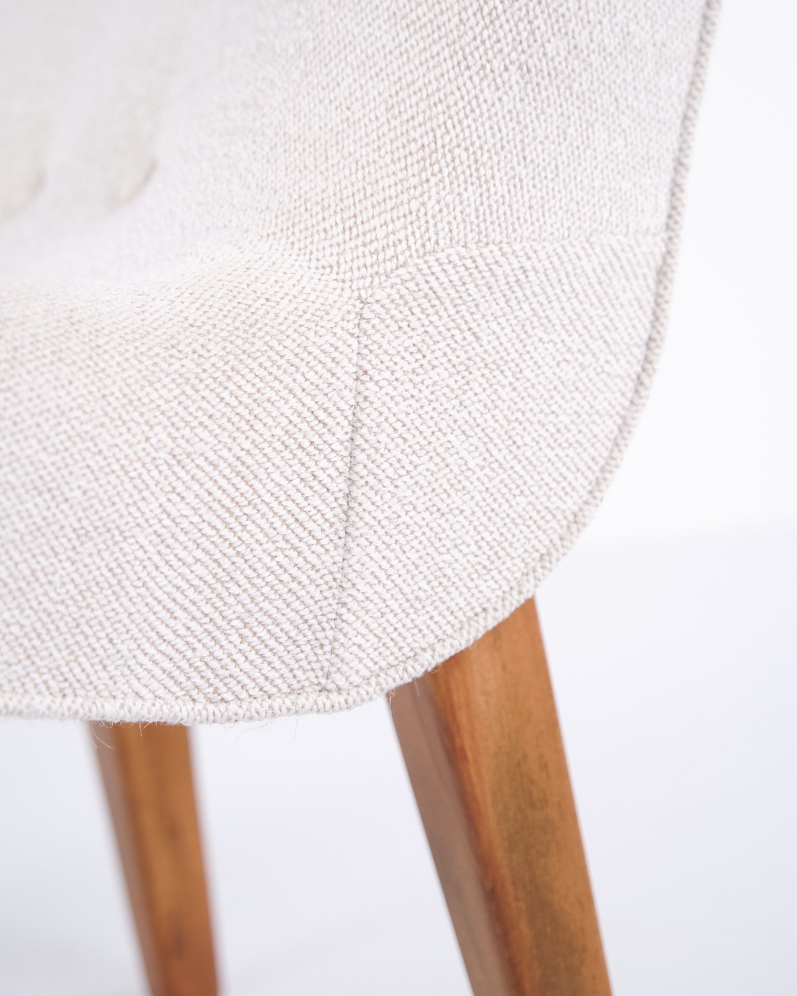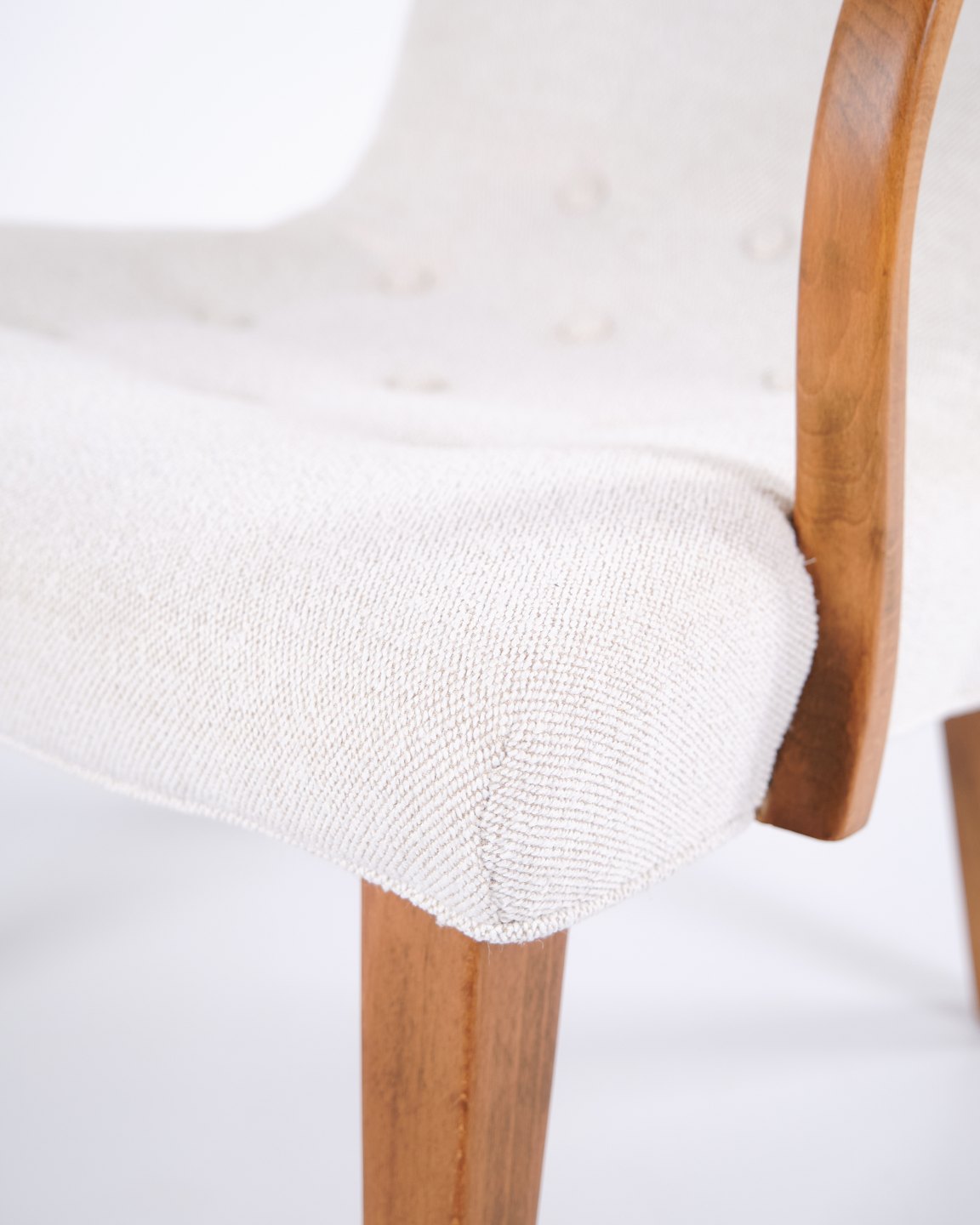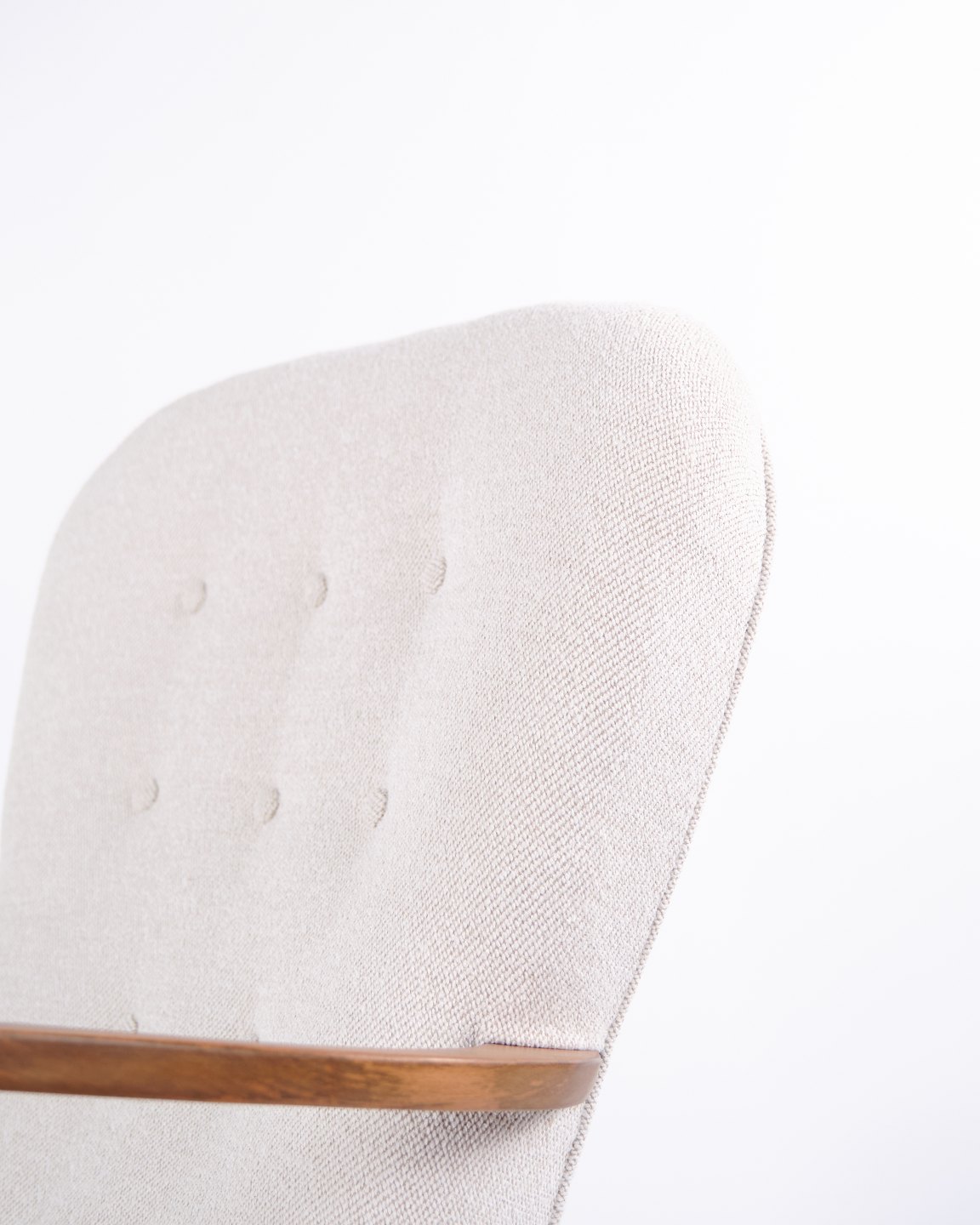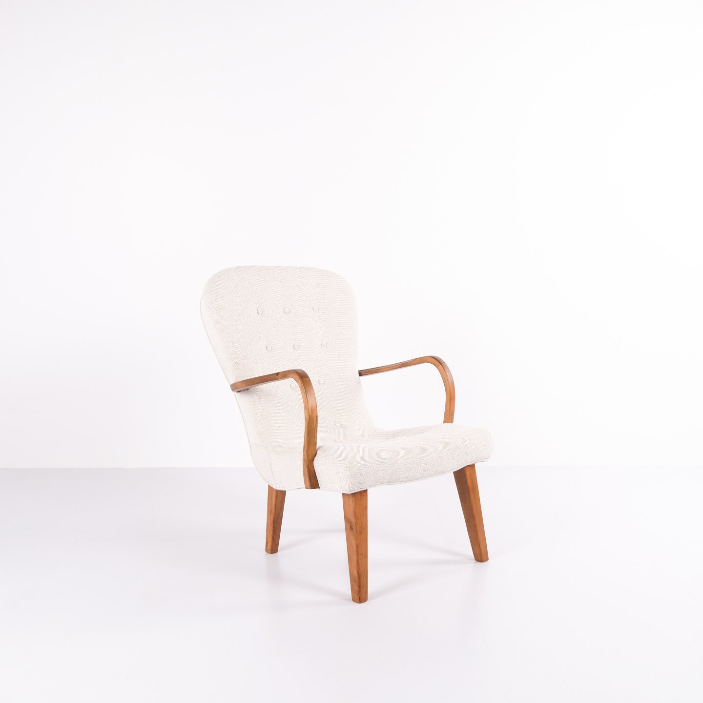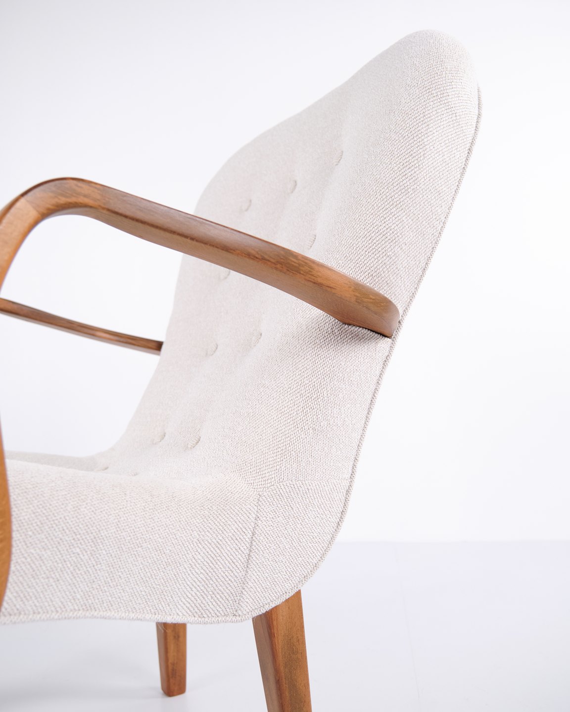 Klassisk lænestol fra 1940’erne, betrukket med lyst stof og udført i et tidstypisk, afrundet formsprog. Stolen har en elegant, opret ryg og let buede armlæn. Designet af Alfred Christiansen