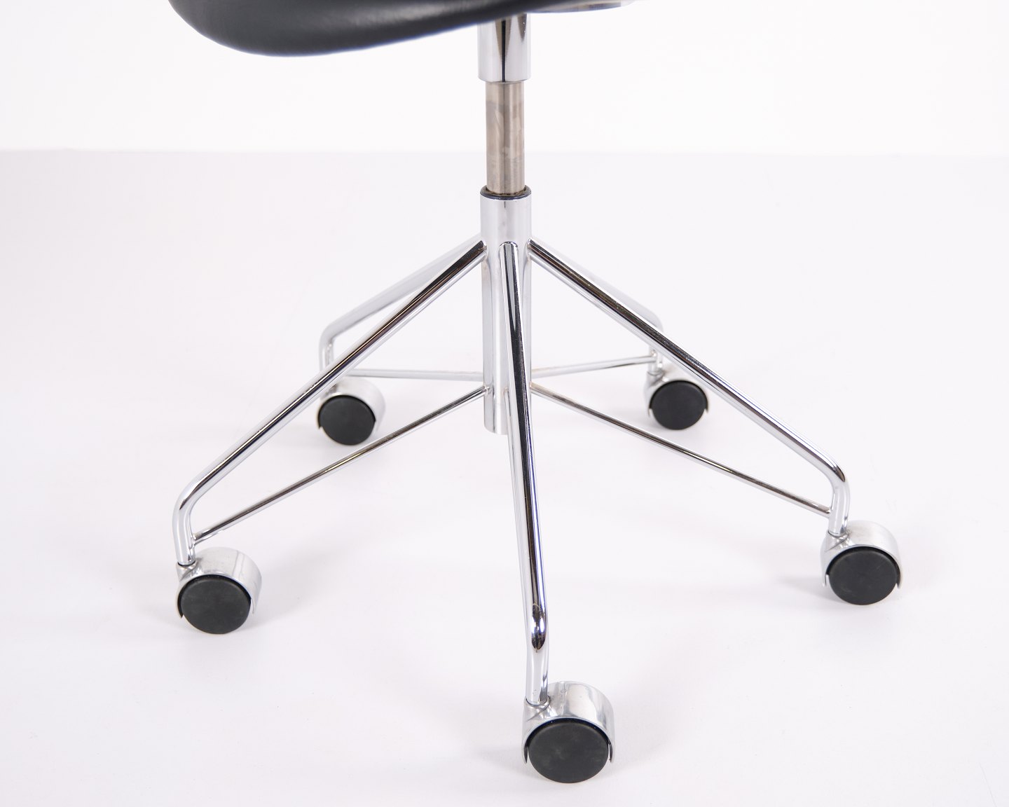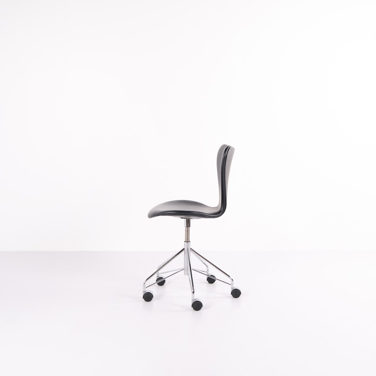 Arne Jacobsen Syver kontorstol, model 3117, for Fritz Hansen. I sortlæder og kromstel med hjul. Klassisk dansk design.