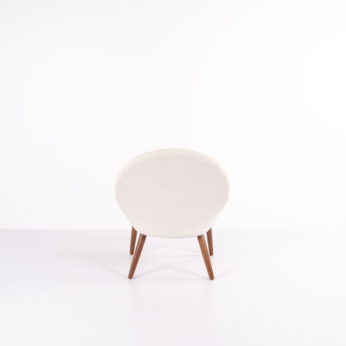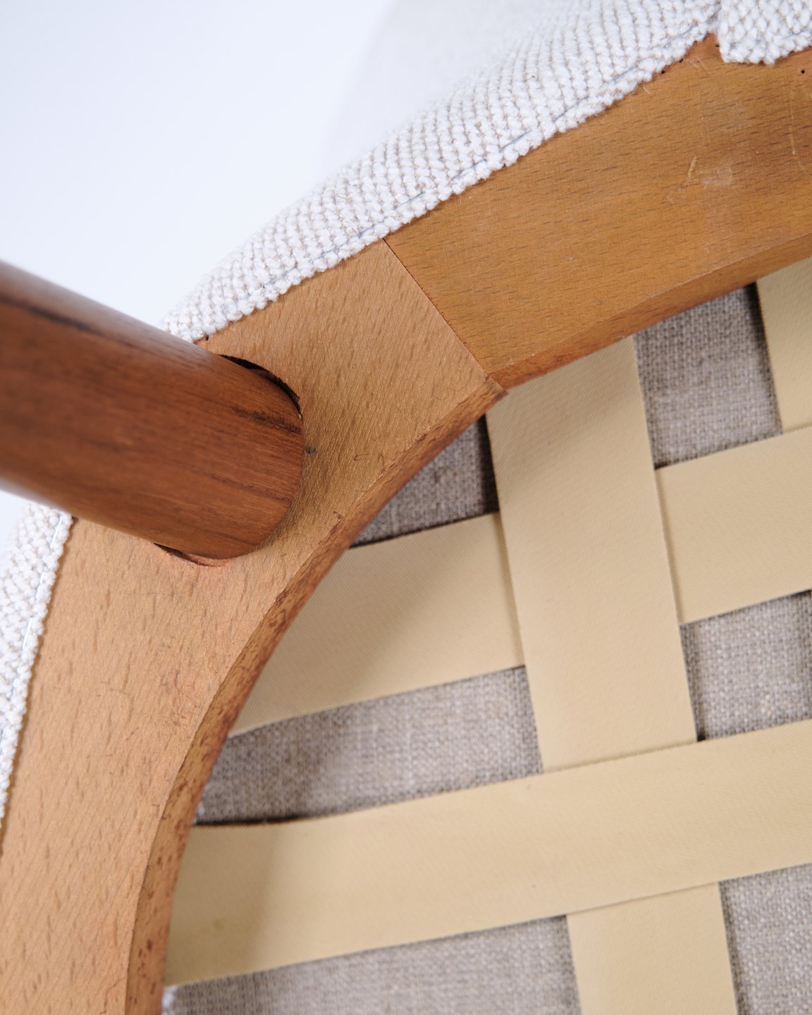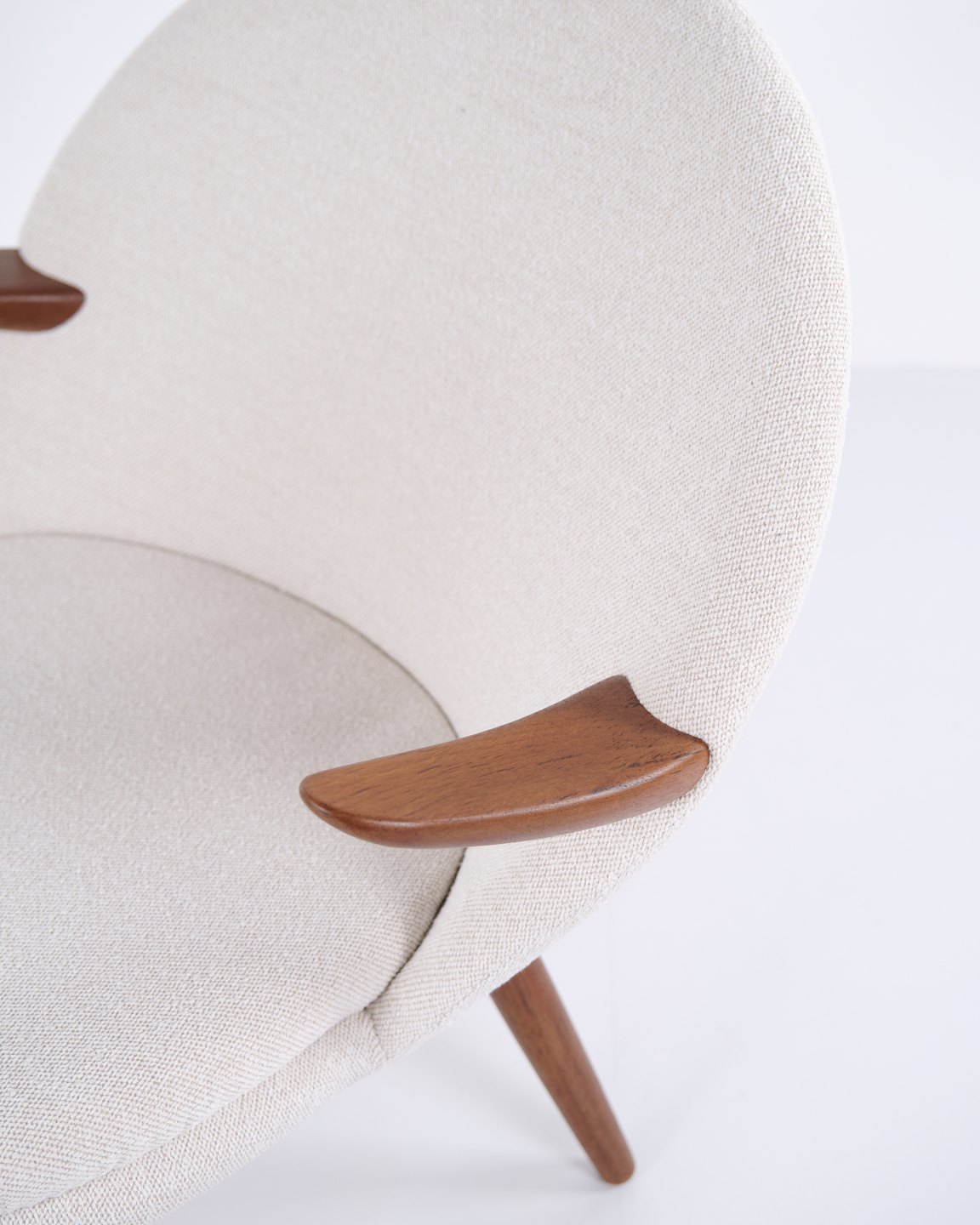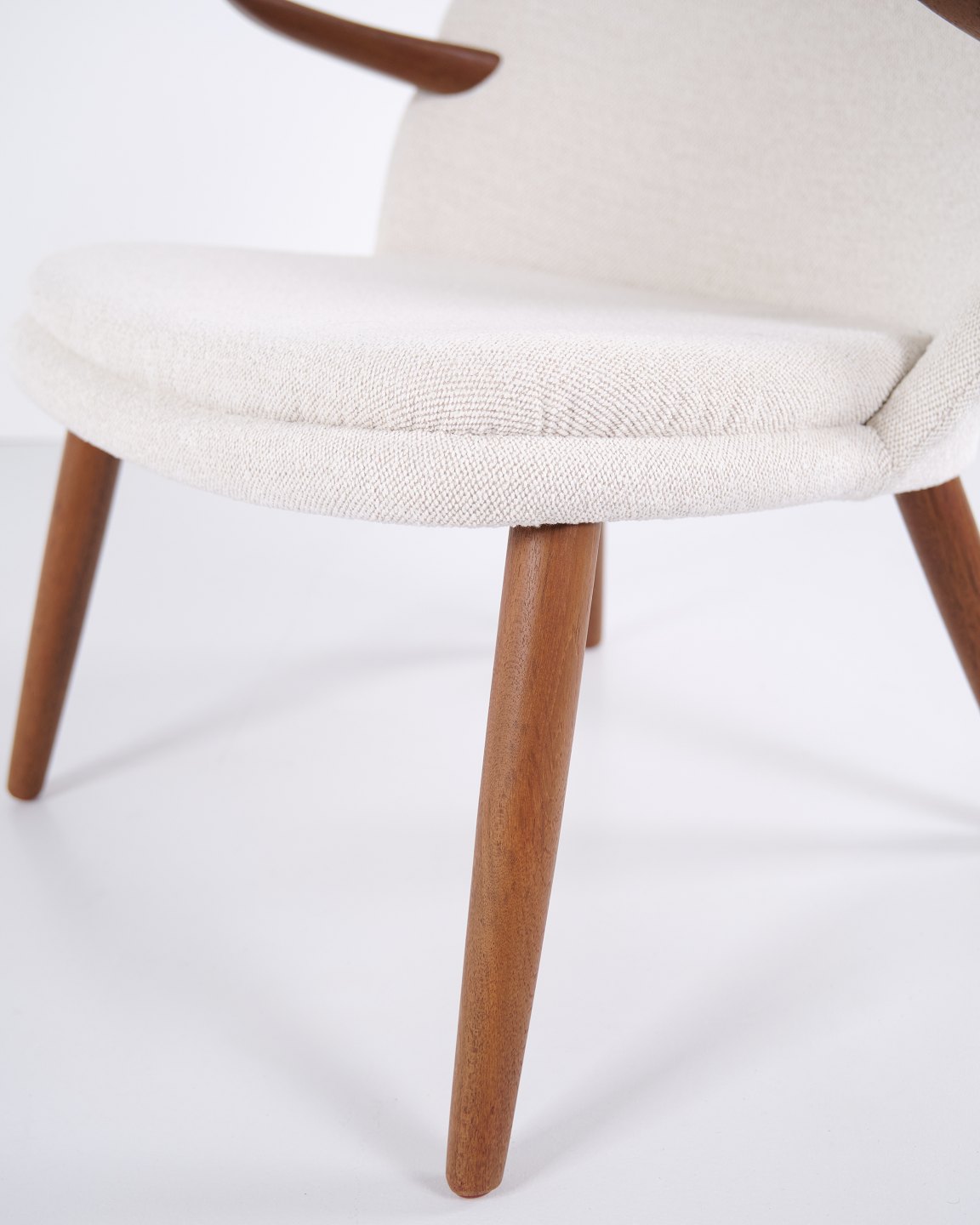 Kurt Olsen lænestol fra Glostrup Møbelfabrik. Teaktræ med lyst stof, 1960’erne.