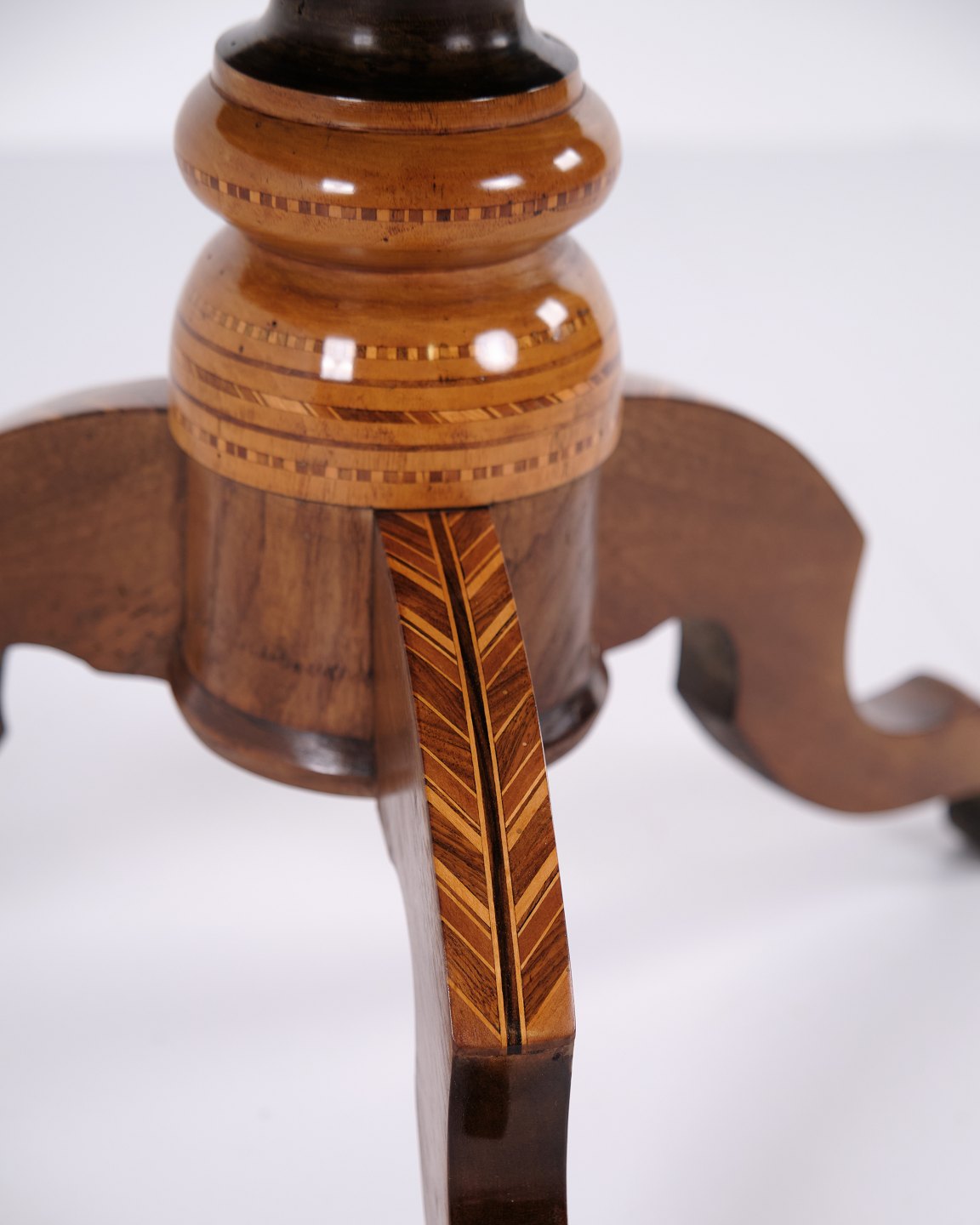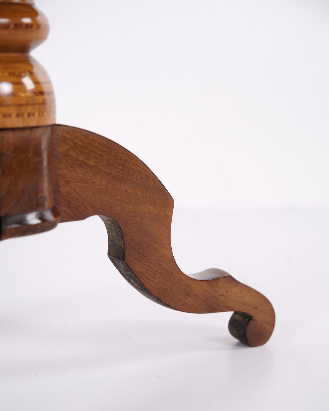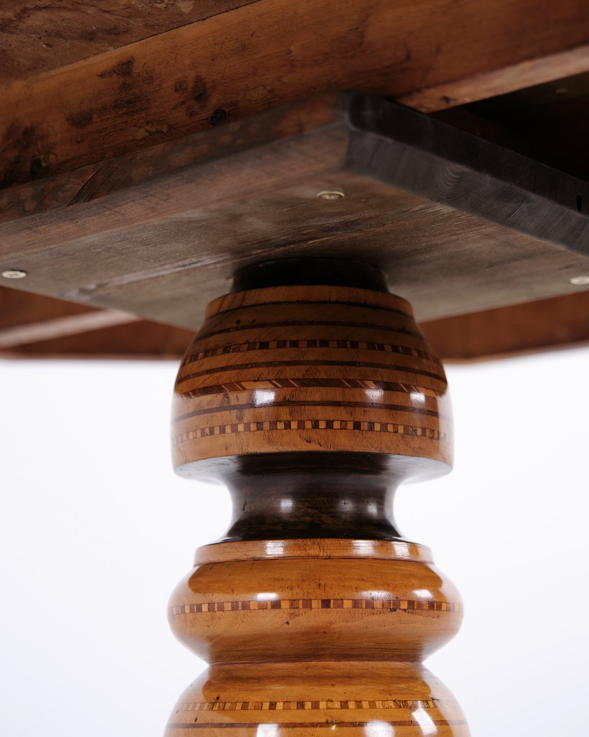Ottekantet søjlebord fra Italien, dateret til 1850’erne. Bordet er rigt udsmykket med håndlagt intarsia, der fremhæver de geometriske former og det dekorative helhedsudtryk.