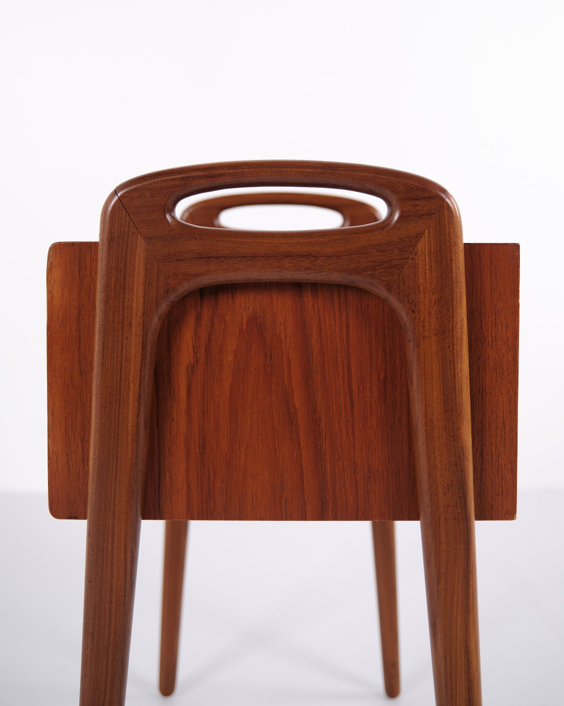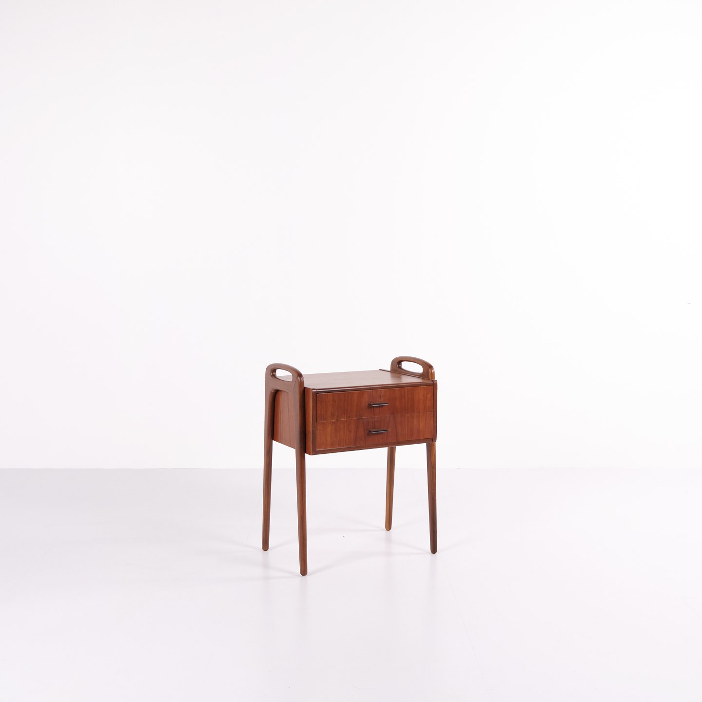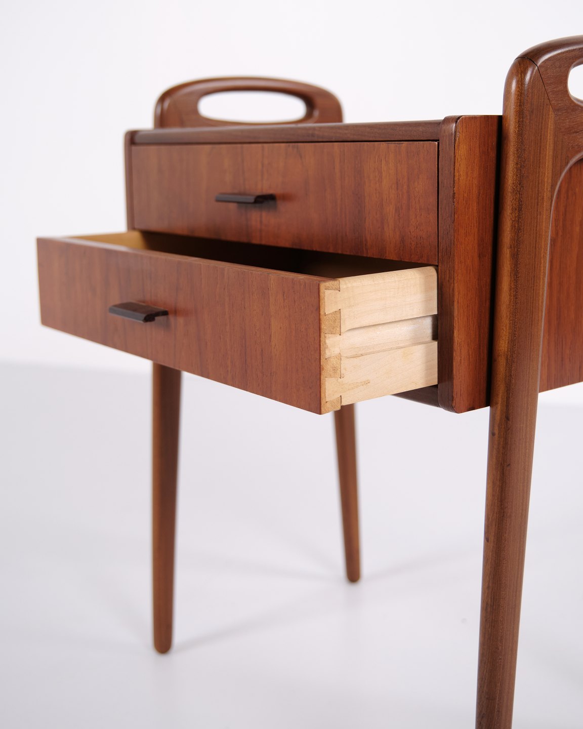 Klassisk side- eller natbord fra 1960’erne, udført i teaktræ med et enkelt og funktionelt formsprog.