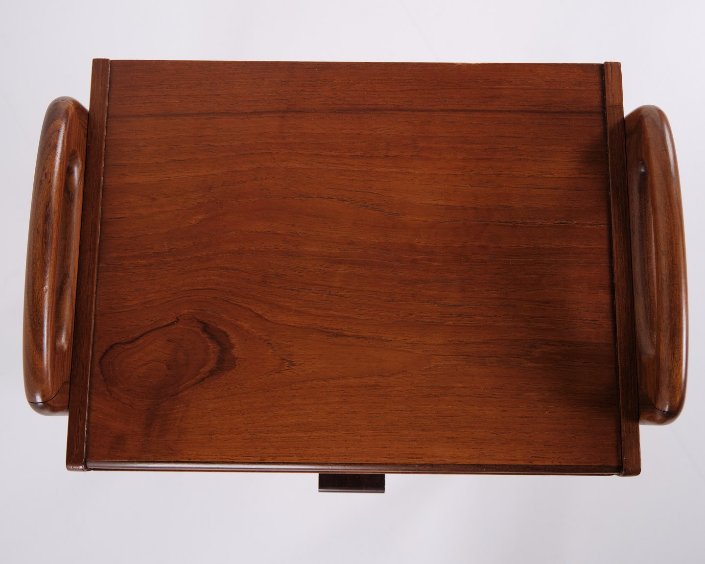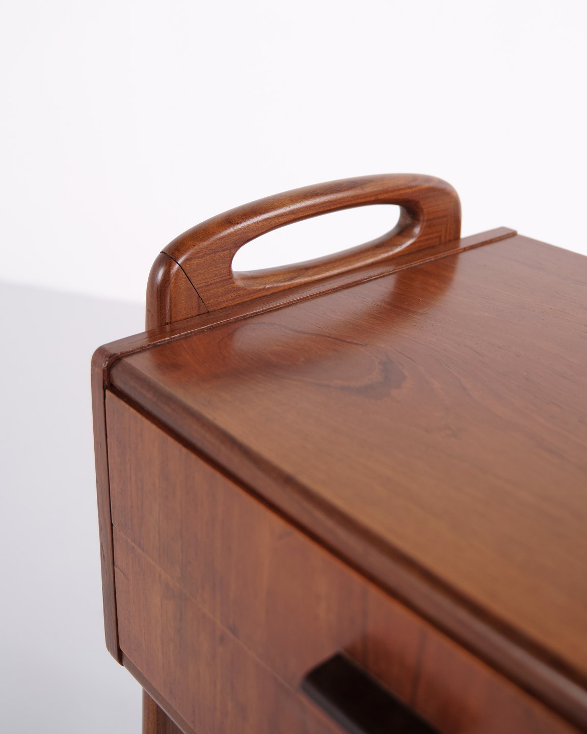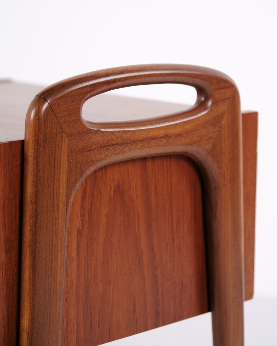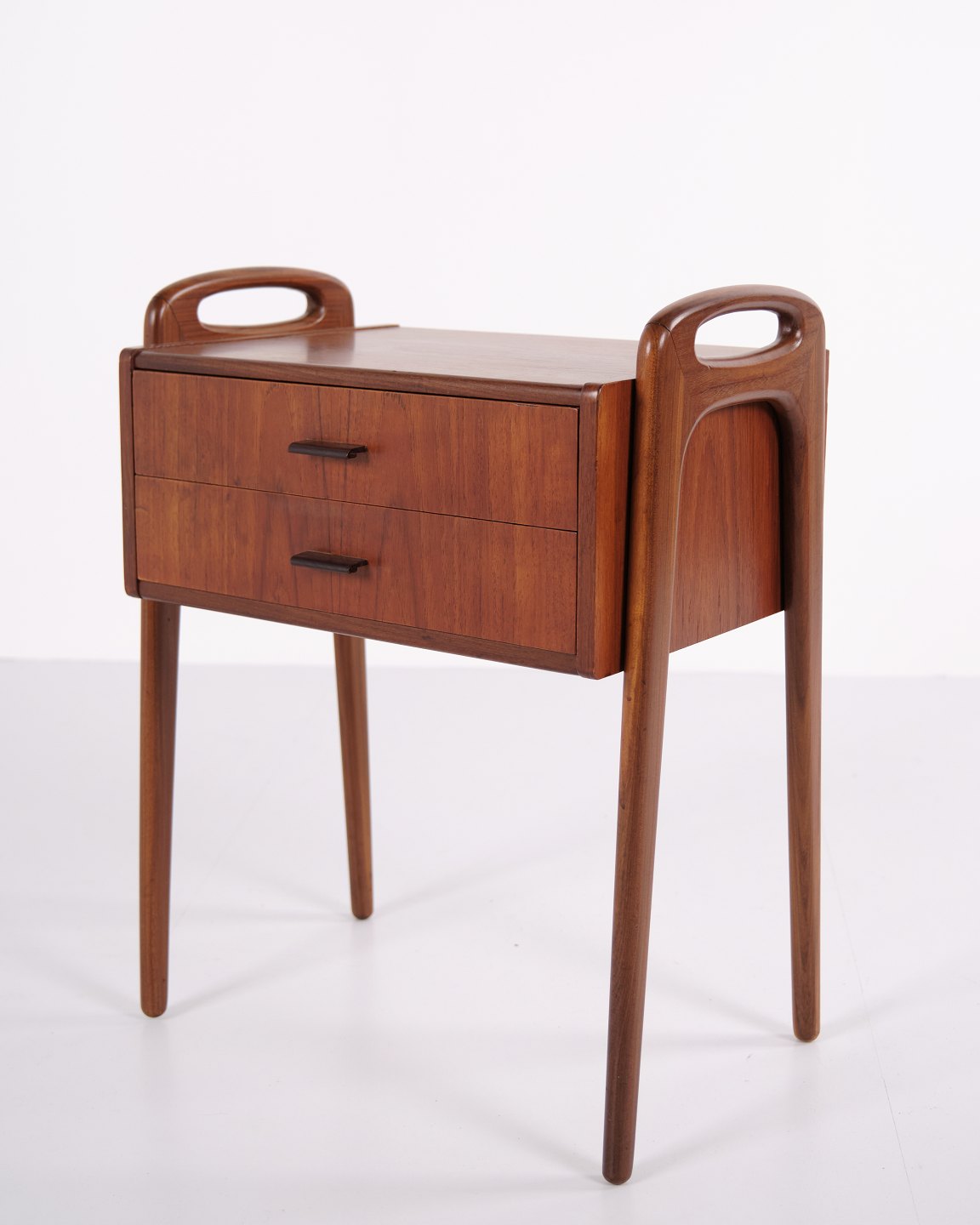 Klassisk side- eller natbord fra 1960’erne, udført i teaktræ med et enkelt og funktionelt formsprog.