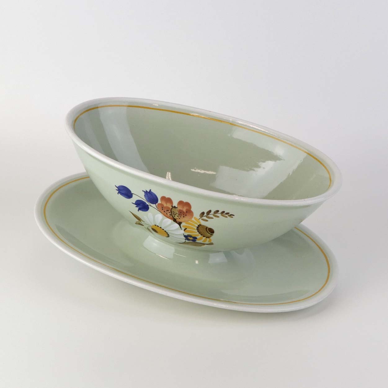 Stellet er fremstillet i perioden 1934-1963 i stelform E. Fajancestel i lys grøn farve dekoreret med forskelligfarvede blomster og gul bort.