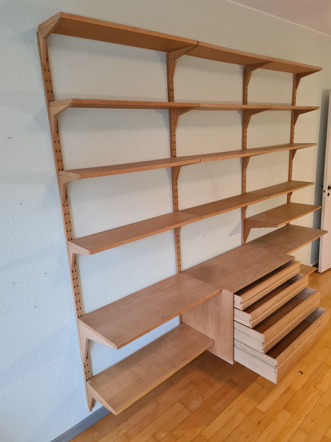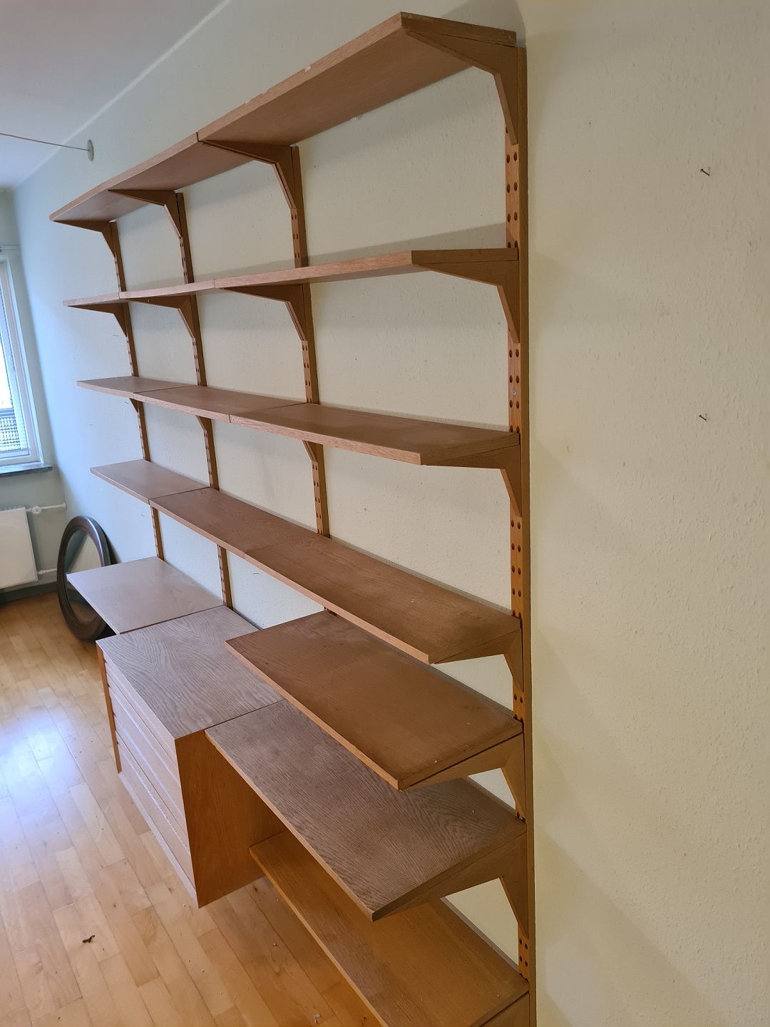 Cado vægreolsystem fra 1960'erne i eg designet af Poul Cadovius. Sættet består af 1 kommode (HxBxD 52x80x38), 2 hylder (HxBxD 2x80x38), 3 hylder (HxBxD 2x80x30), 12 hylder (HxBxD 2x80x33) og 4 vanger til ophængning. Generelt i pæn brugt stand dog svajer et par hylder en anelse. (Billede)
