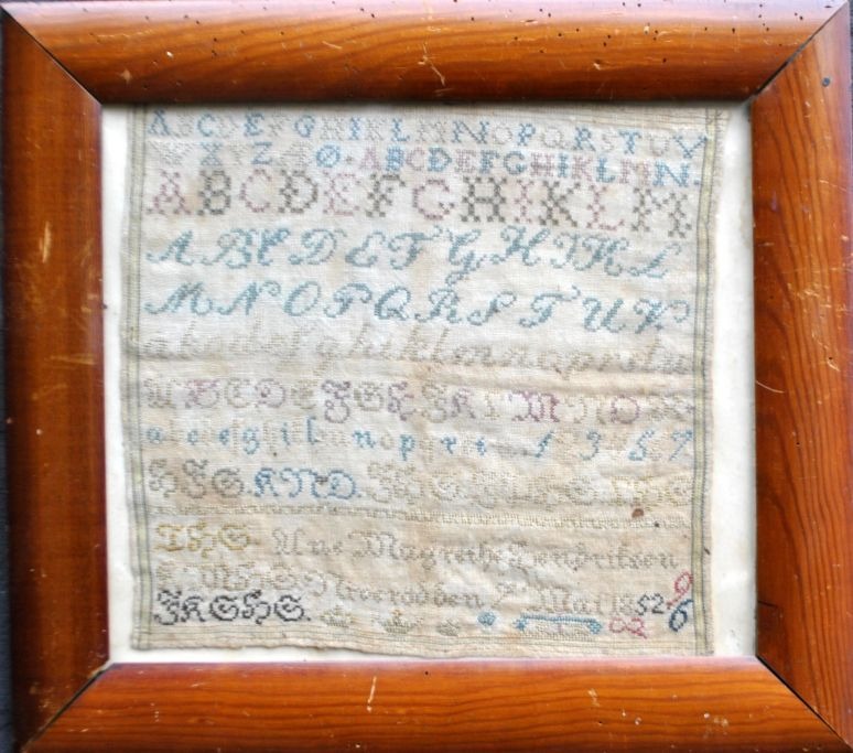 Navneklud, udført af Margrethe Hendriksen, Nivørødden den 6. Mai 1852. Danmark. 28 x 28 cm.