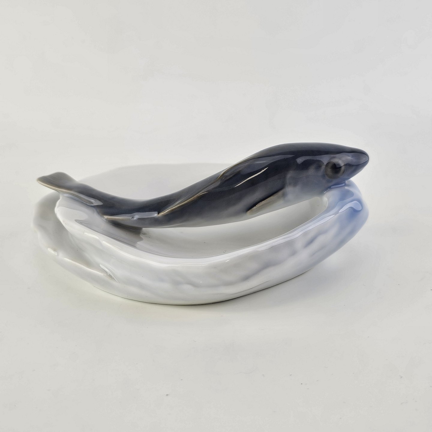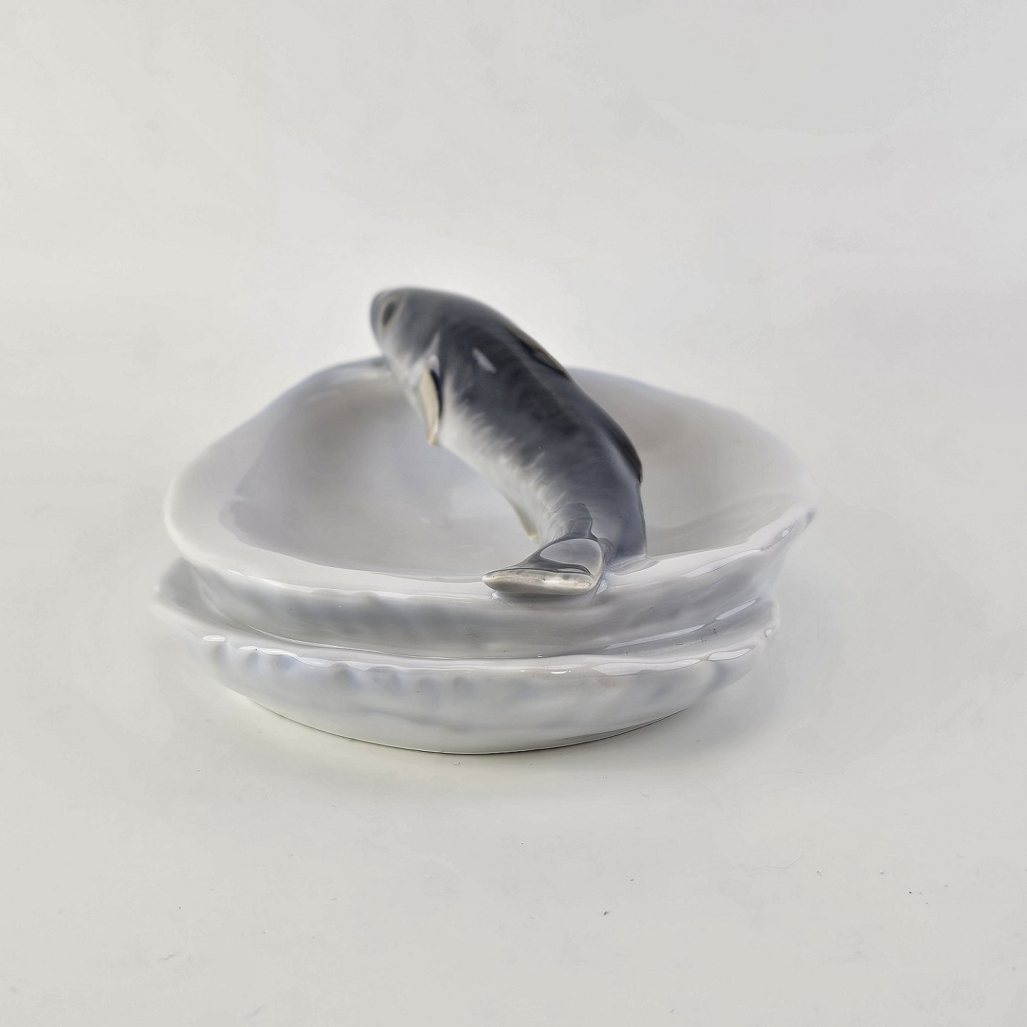 Sjælden skål i kongeligt porcelæn i art nouveau stil med form af to muslingeskaller med en fisk