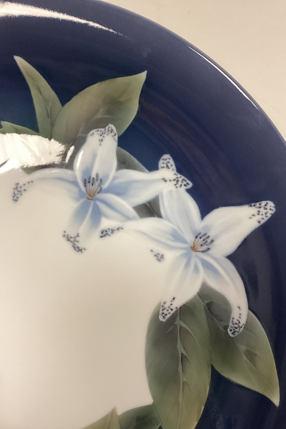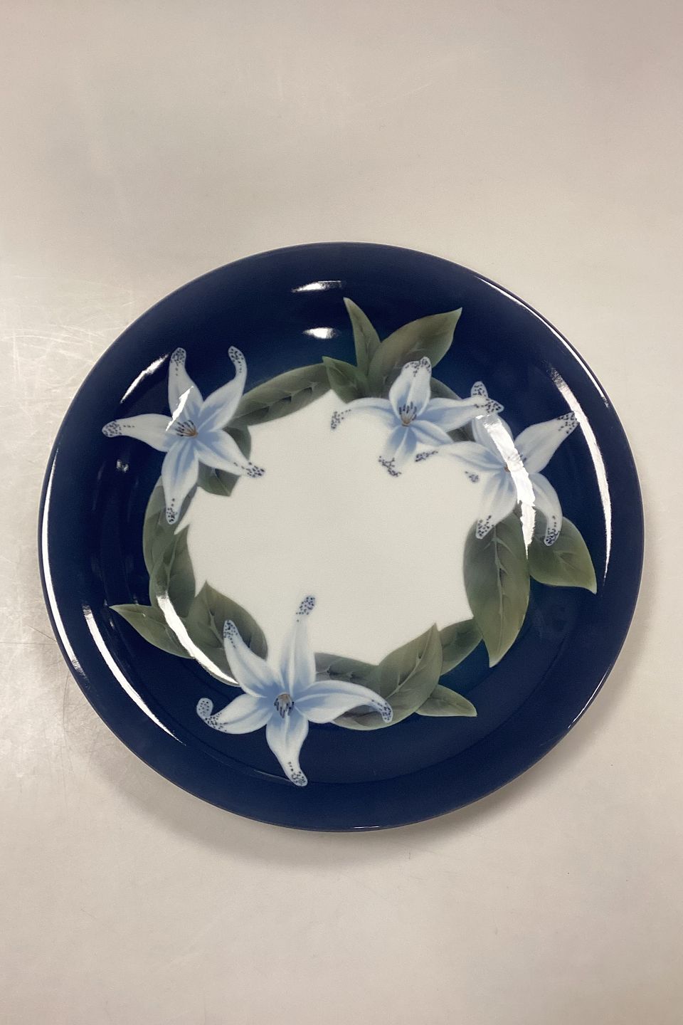 Royal Copenhagen Dish No. 1063/646. Motif with lilies on a dark blue background.