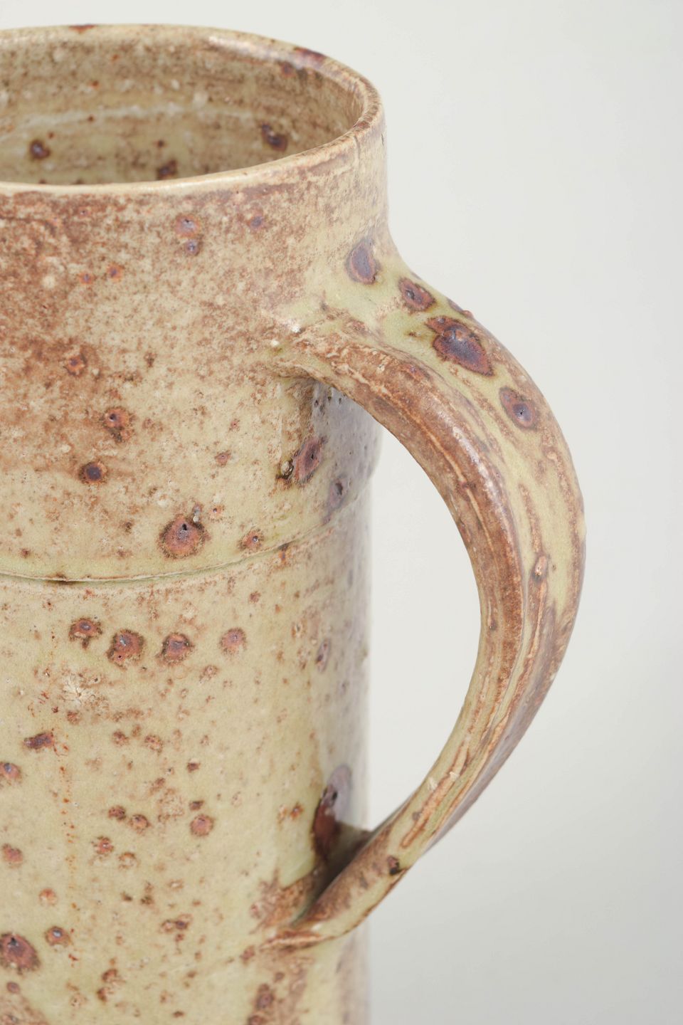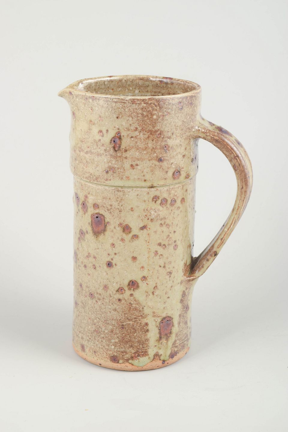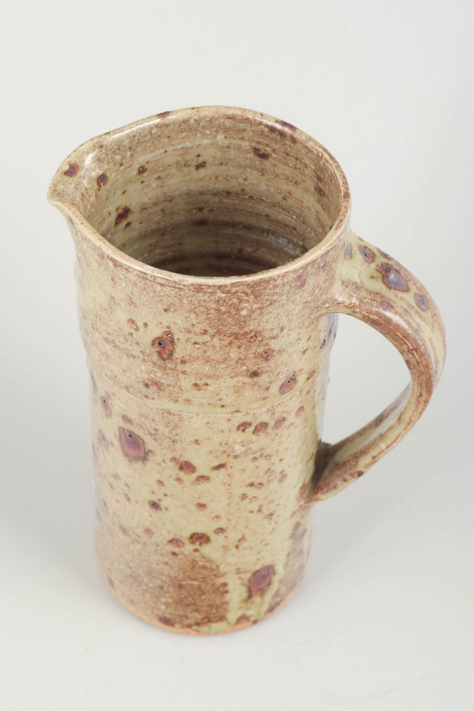 Unik hånddrejet kande i stentøj med rustik glasur i beige og brunlige nuancer, prikket overflade og markant hank. Signeret af kunstneren under bunden.