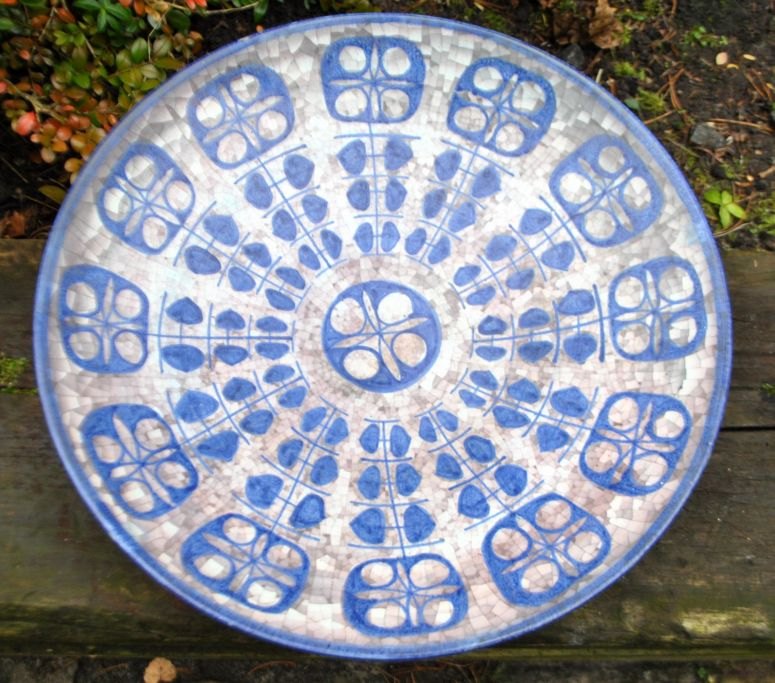Michael Andersen & Søn keramik fad nr. 4106-3, Bornholm, Danmark, efter 1930. Dekoreret i blå/grå nuancer på mosaikbund. Signeret M S og stemplet med tre fisk. Dia: 40 cm.