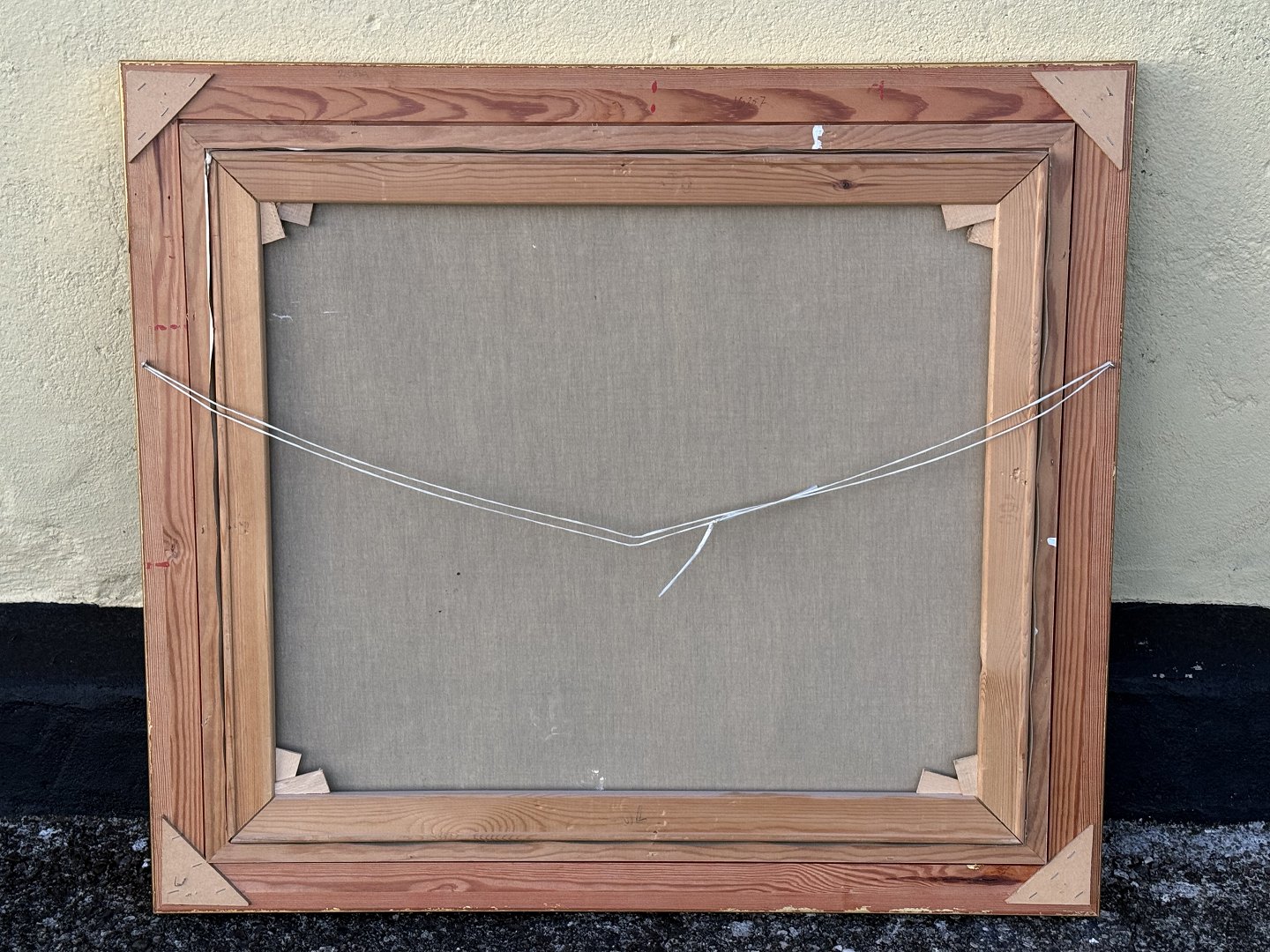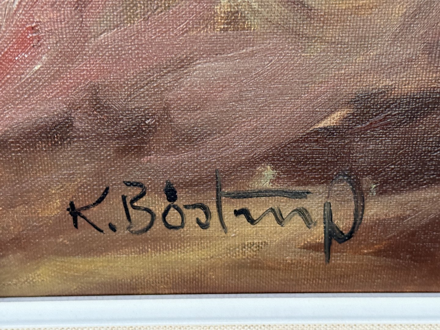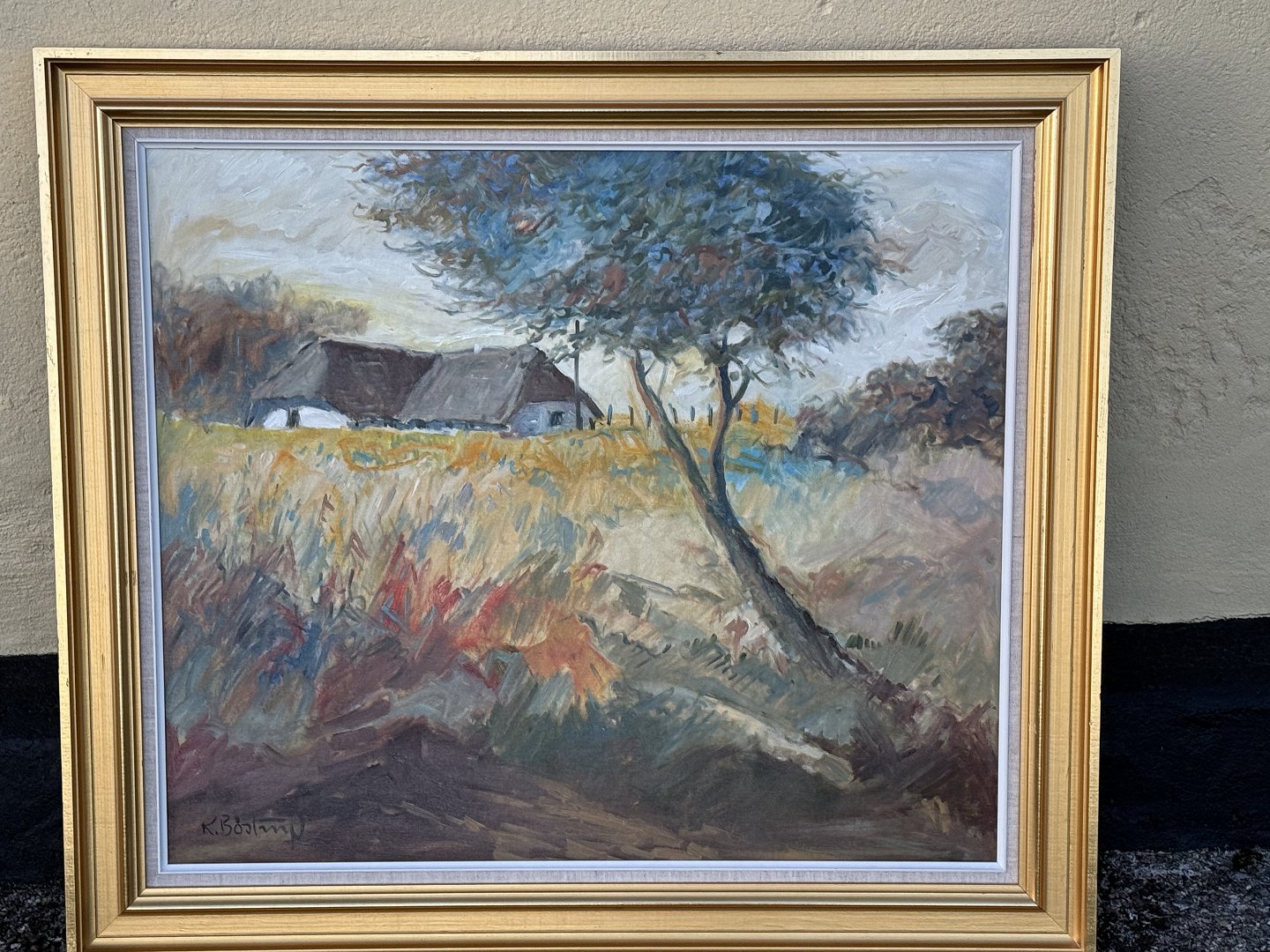 Knud Bøstrup (1927-2011), oliemaleri på lærred, Gård på landet, Mål med ramme: 75x85cm *Fin stand*