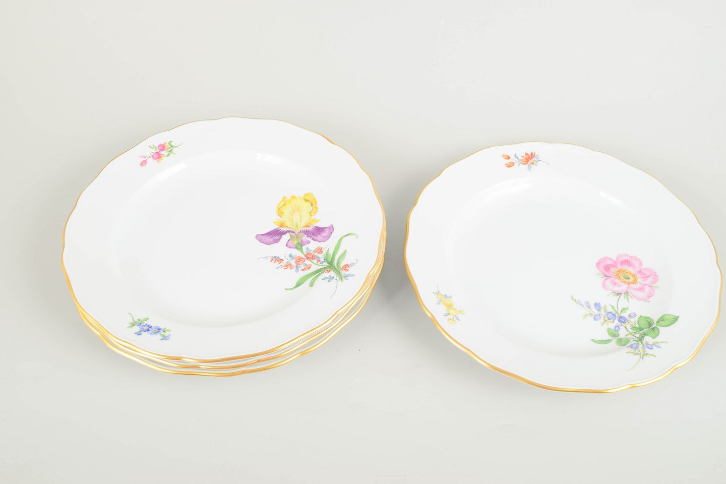 Four antique Meissen porcelain plates with hand-painted floral decorations and gilt rims. Classic scalloped edge with finely executed polychrome bouquets, typical of Meissen’s refined craftsmanship.