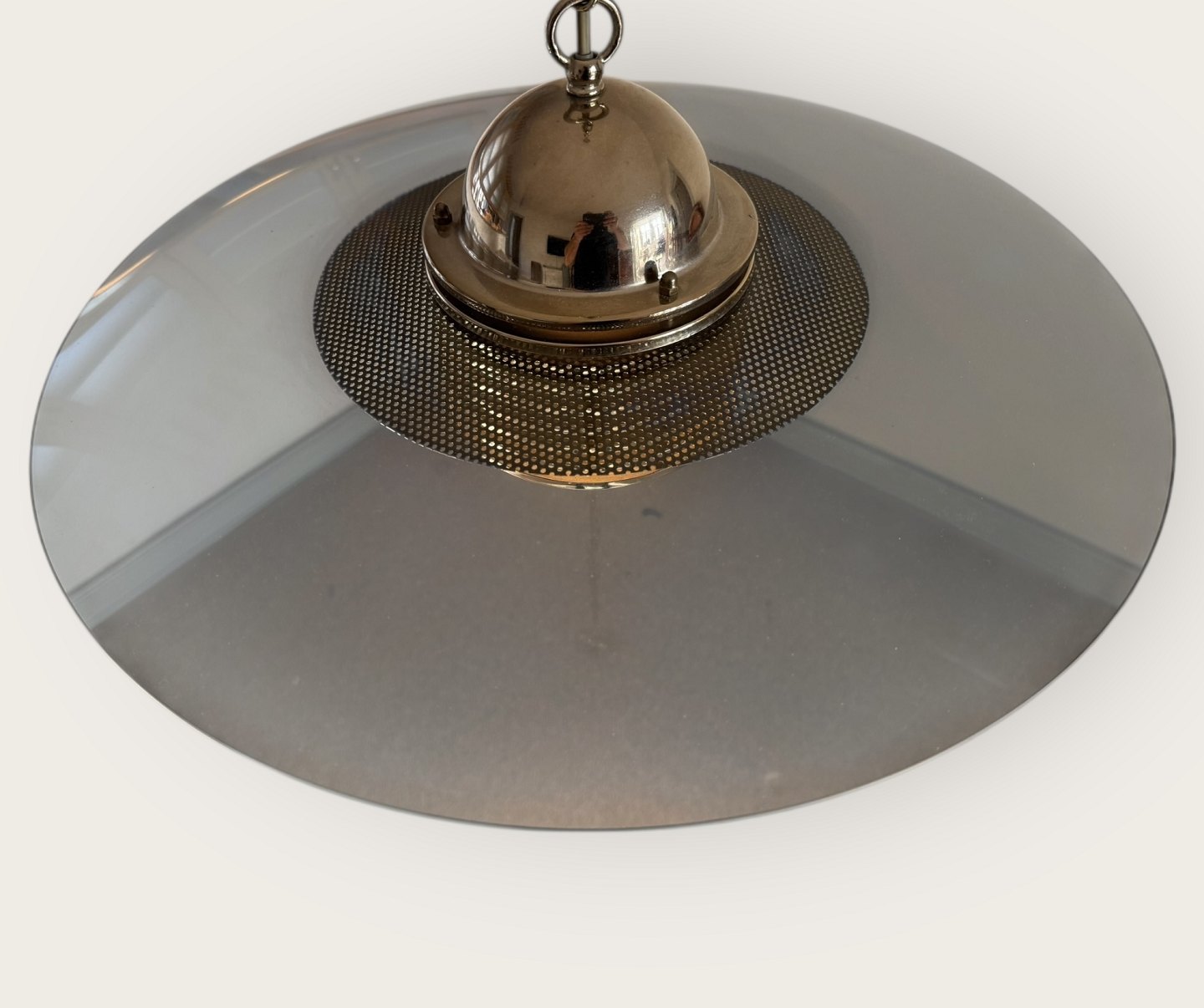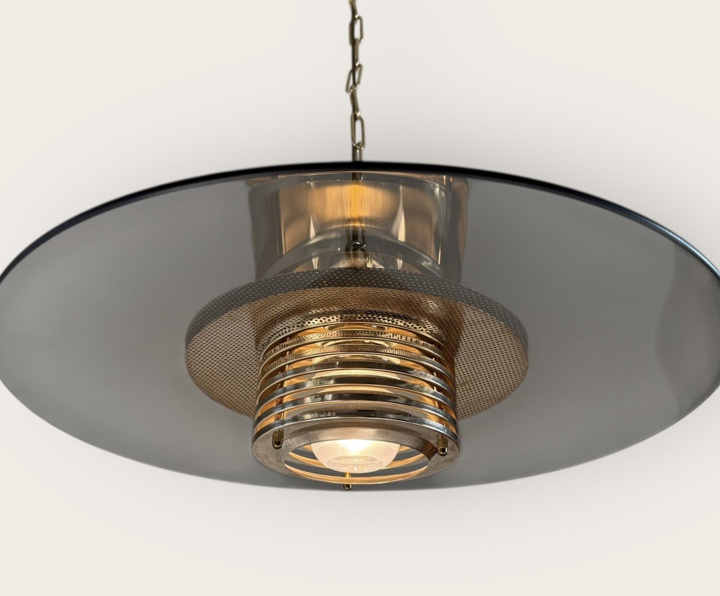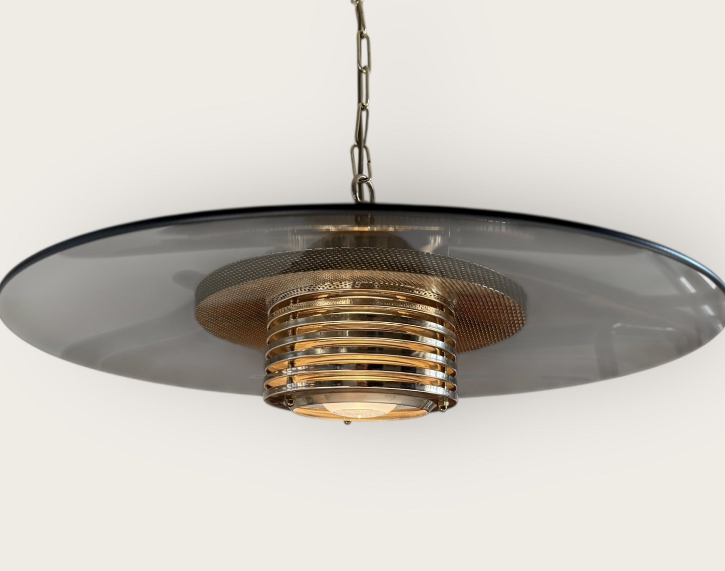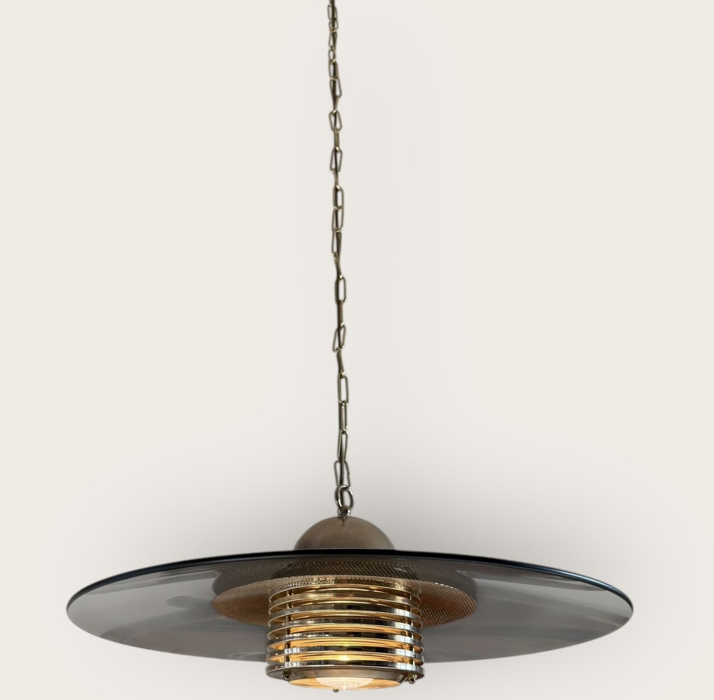 Jan-Eskild Eskildsson, Belid, Sverige, reflektor Loftlampe i røgfarvet glas og messing, Diameter 49cm *pæn stand*