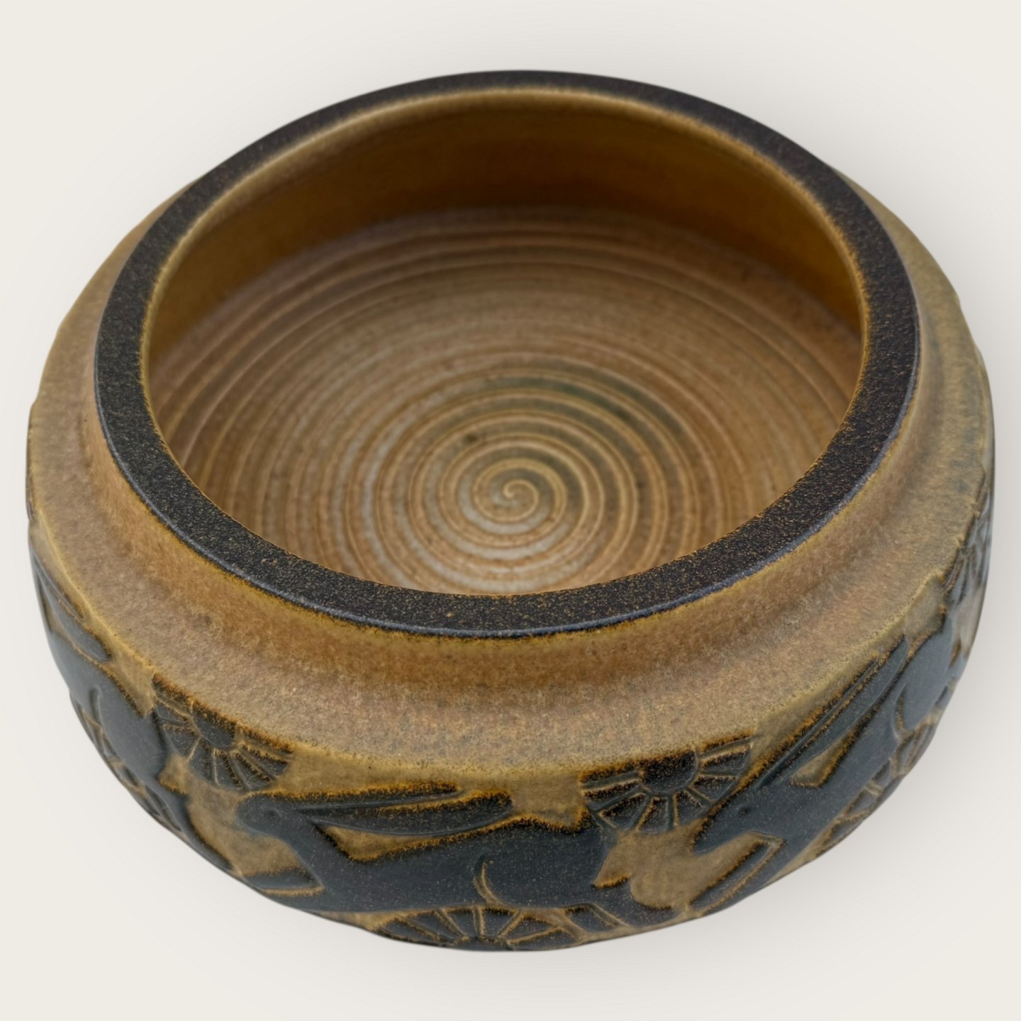Bornholm pottery, Michael Andersen, Large Bowl with jumping hares, diameter 23.5cm, height 8cm, # L429 *Good condition*