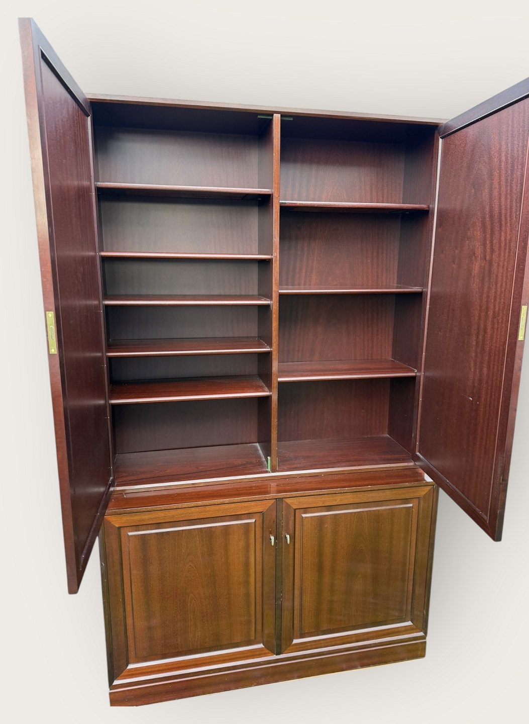Large spacious cabinet with shelves, mahogany veneer, Dimensions: HxWxD 186x110x38cm *Good condition with some signs of wear*