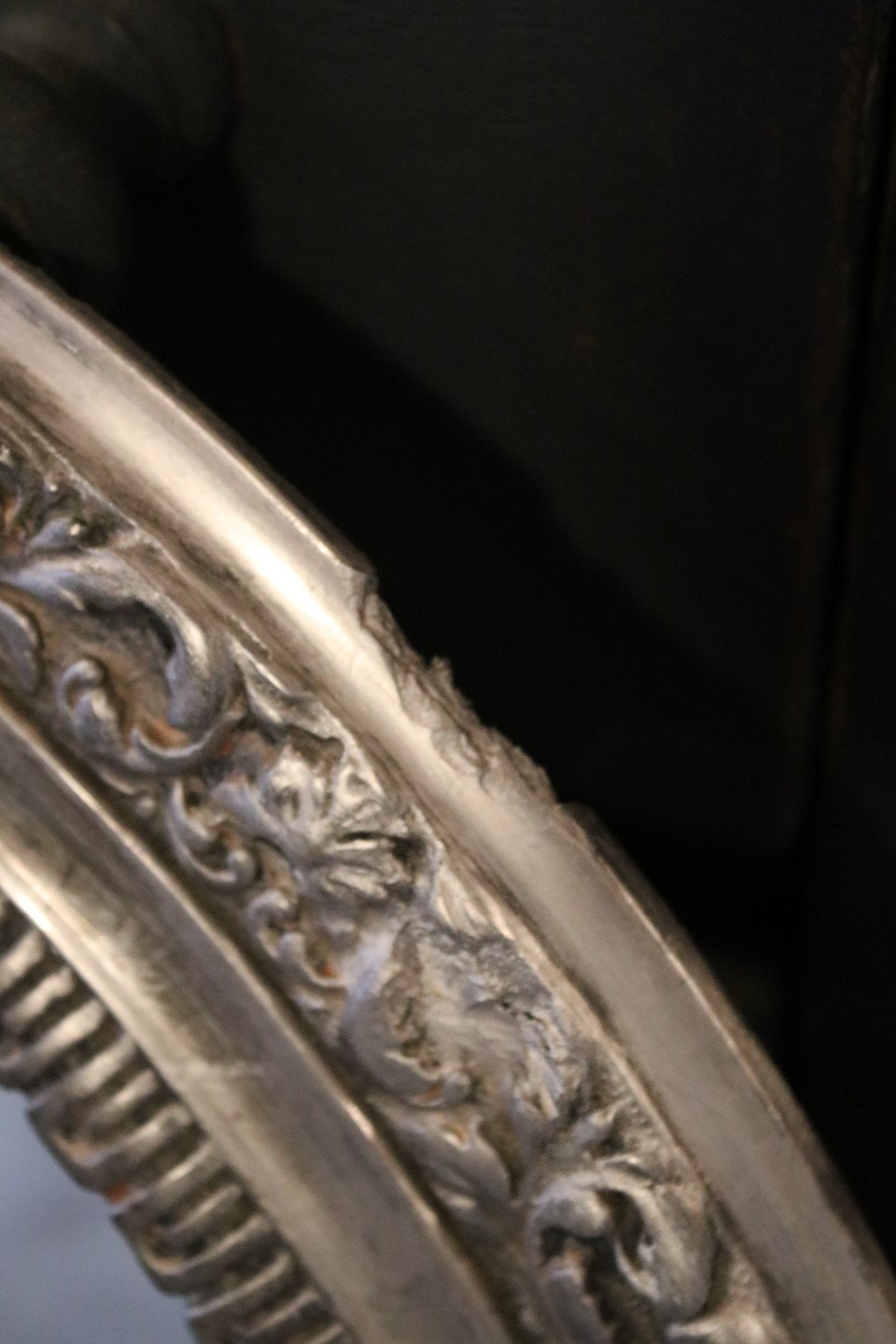 Gammelt fransk ovalt spejl med fin dekoreret bred forsølvet træ ramme...