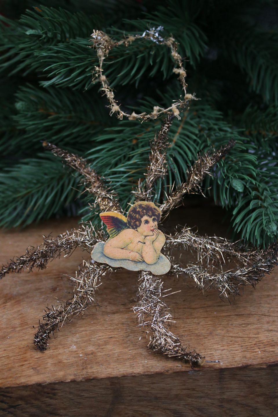 Antikt tinsel juletræspynt , engel i pap med sølv tinsel.