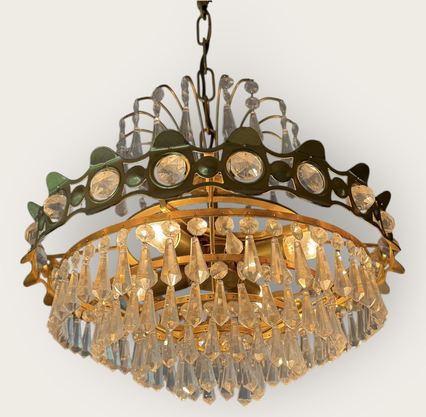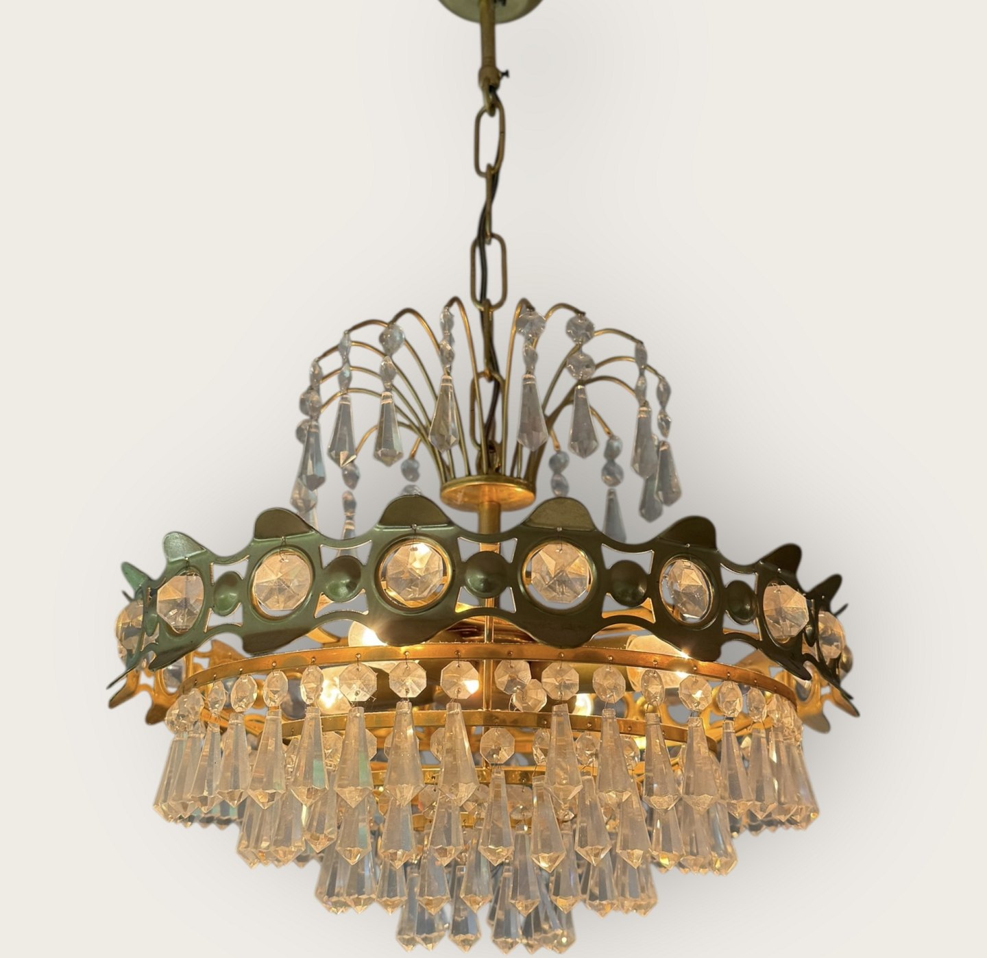 Lysekrone i messing med mange glasprismer, fungere fint og med alle prismer, Diameter ca. 36cm *Pæn brugt stand*