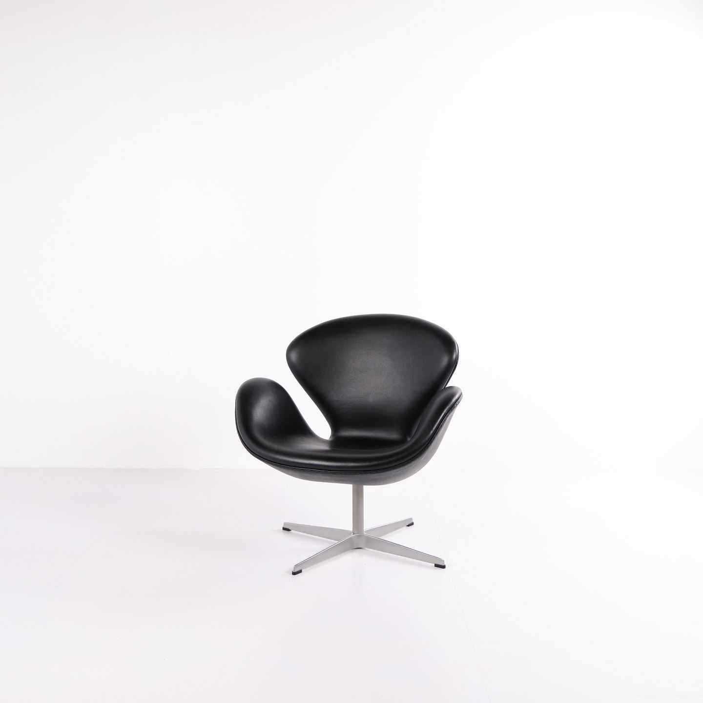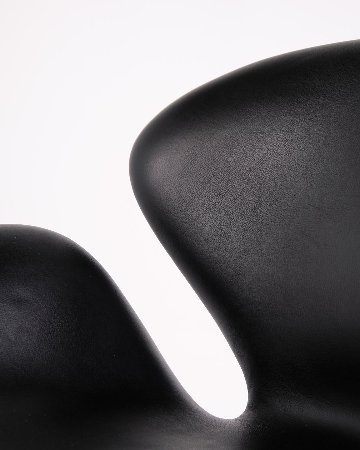 Svane stol designet af Arne Jacobsen og fremstillet af Fritz Hansen i 2002. Udført i sort Elegance læder, som er en højkvalitets anilinlæder med smuk dybde og naturlig struktur. Modellen er en videreførelse af Jacobsens originale design fra 1958 og produceret i Danmark med samme håndværksstandard som de tidlige udgaver.