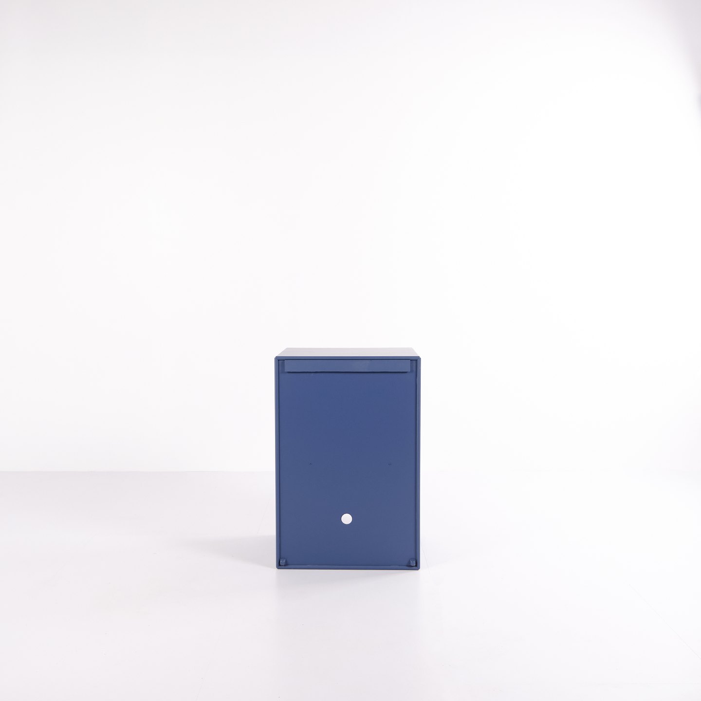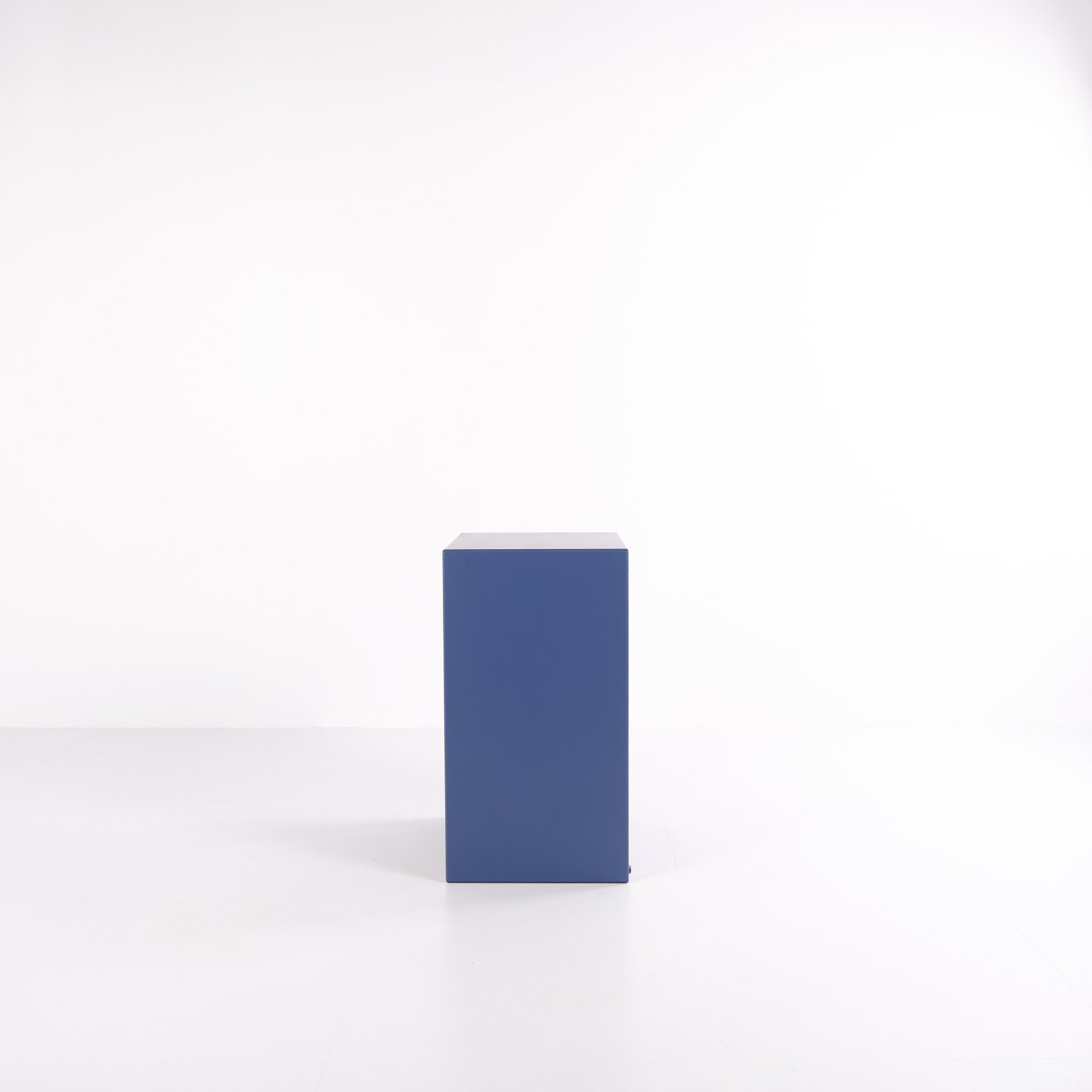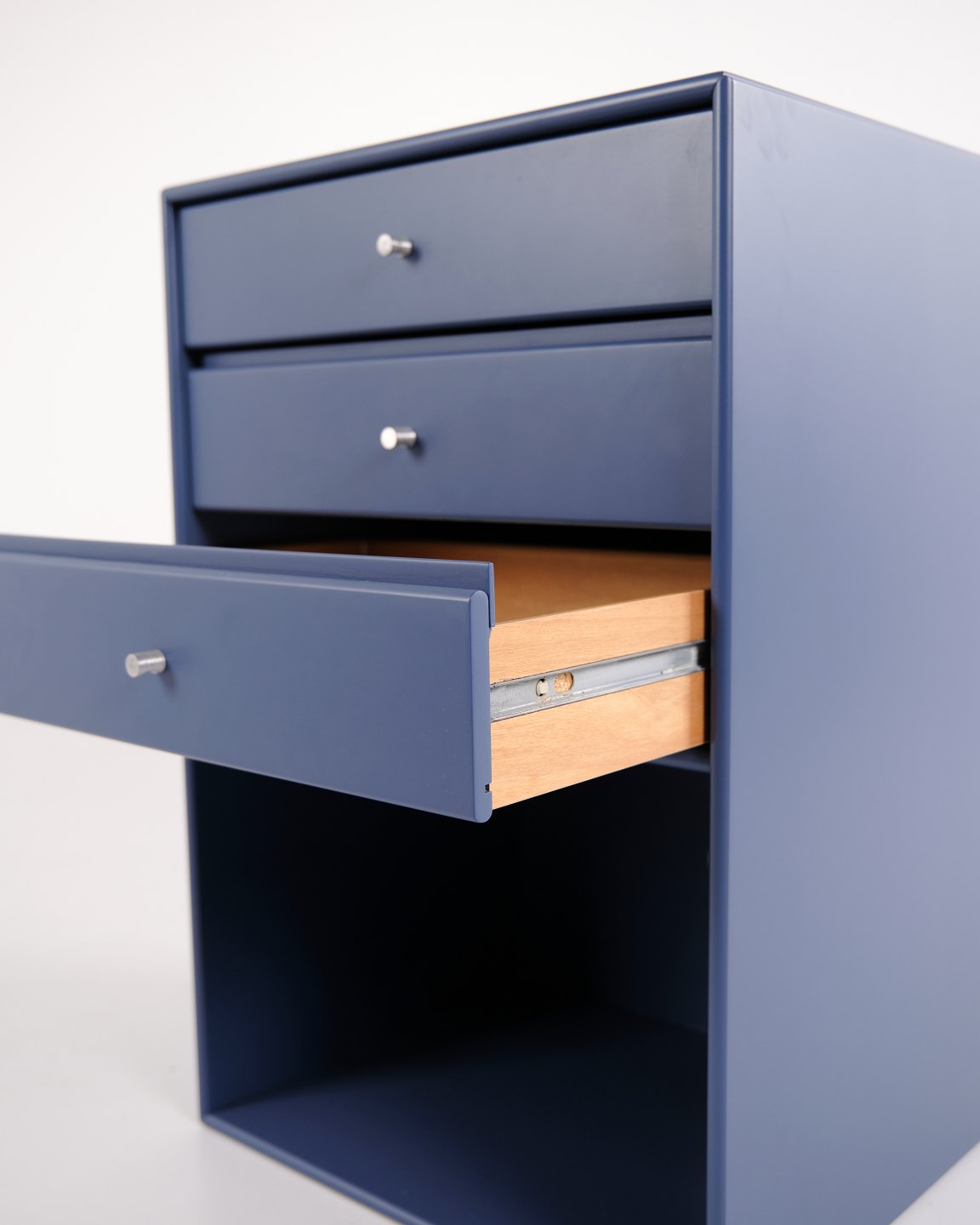 Montana reol i blå. Indrettet med tre skuffer og én åben hylde, velegnet til både opbevaring og display. Et klassisk Montana-modul, der kombinerer funktionalitet og enkelt design.