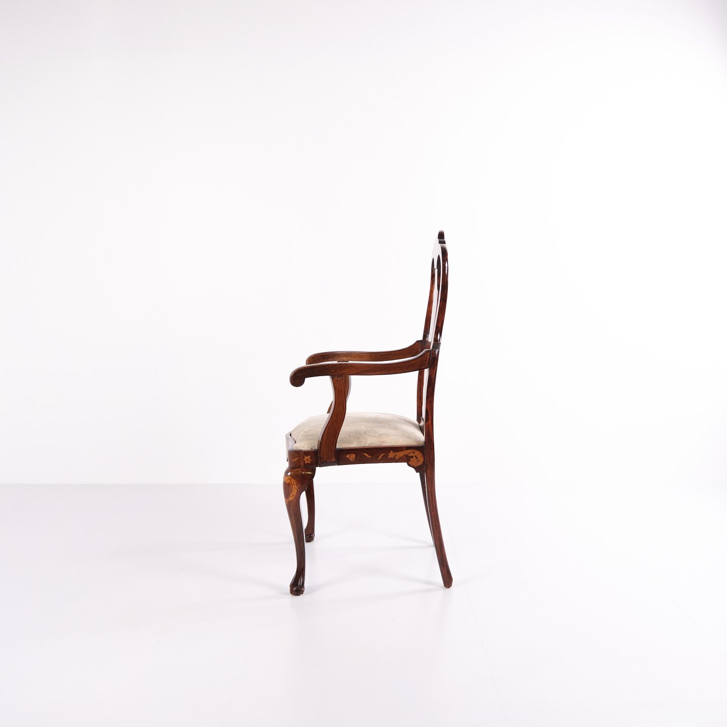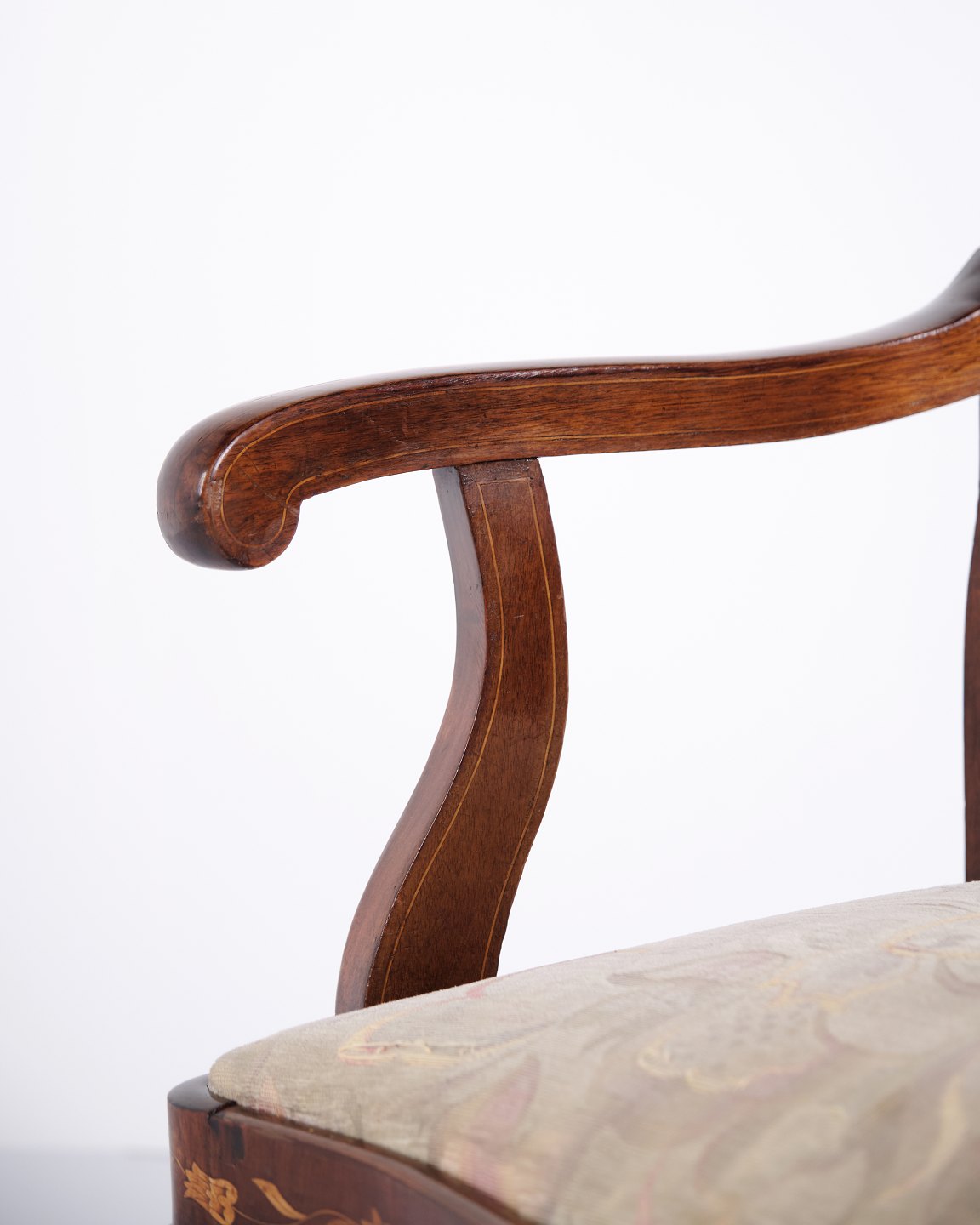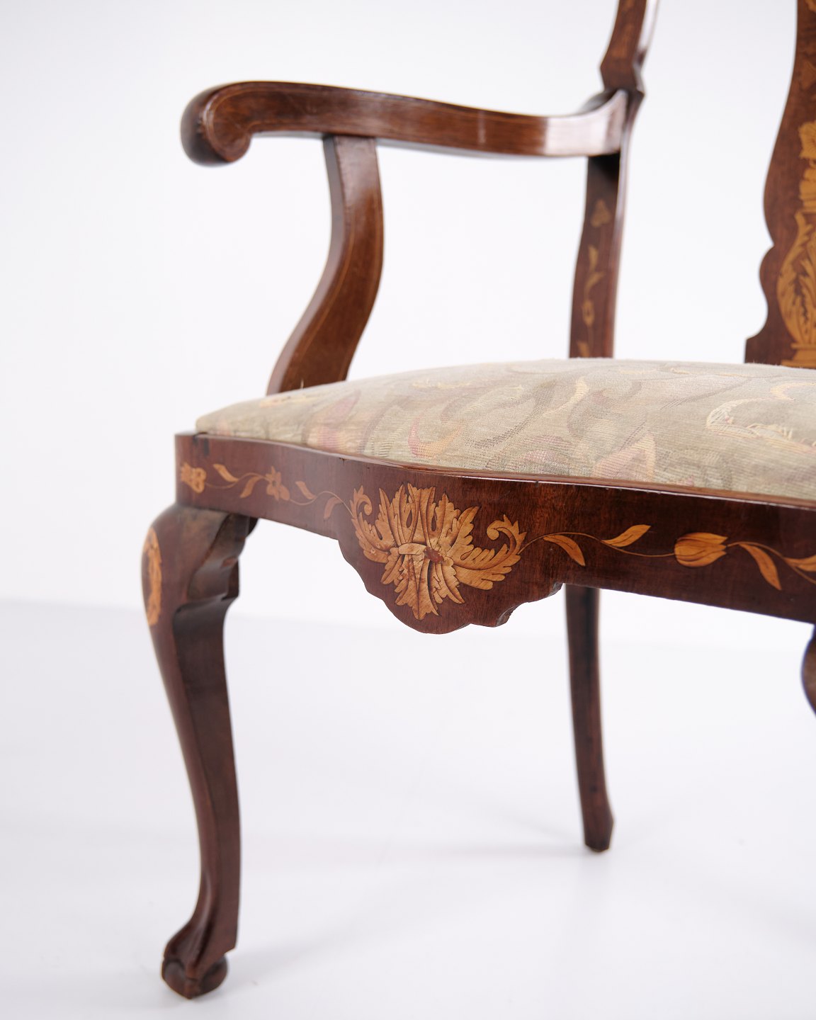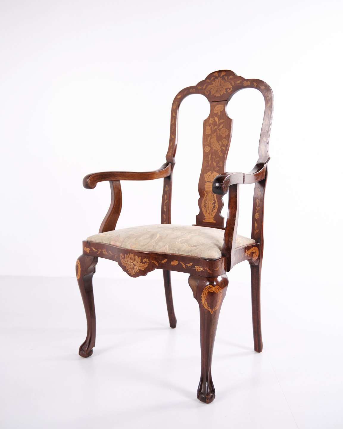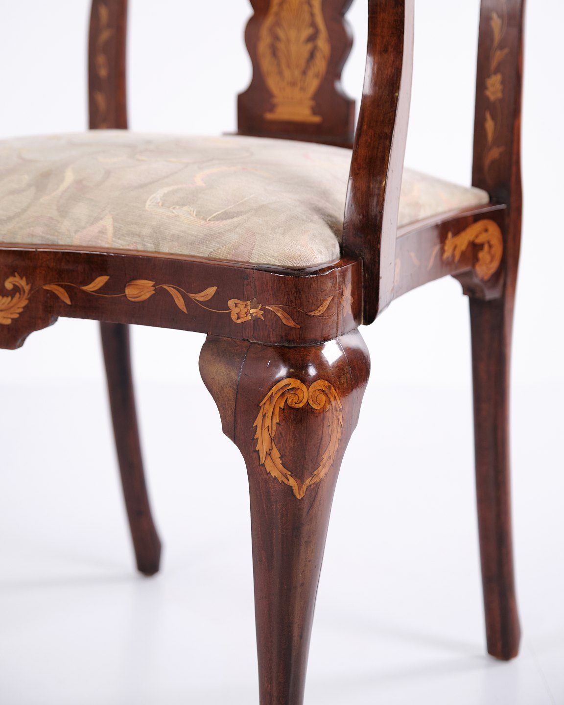Armstol fra midten af 1800-tallet udført i nøddetræ med rigt frugttræ-intarsia i klassisk Queen Anne stil. Dekoreret med detaljerede motiver af blomster, fugle og sommerfugle. Overfladen er håndpoleret med shellak, hvilket fremhæver træets varme glød og det fine håndværk.