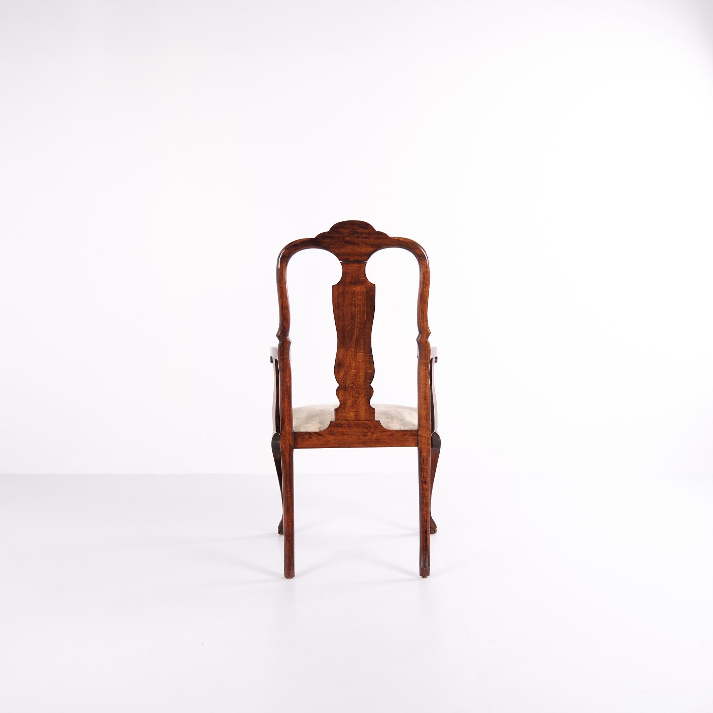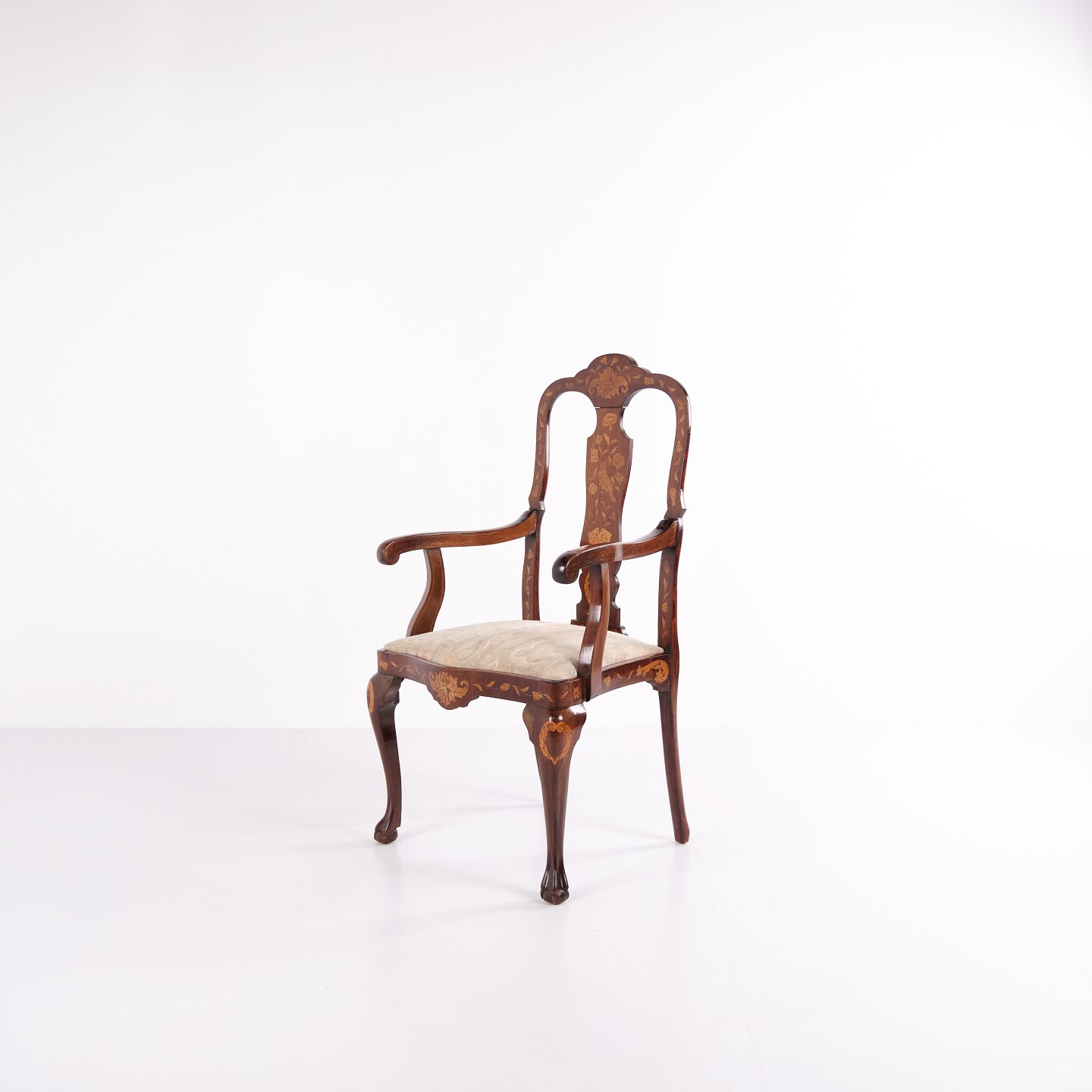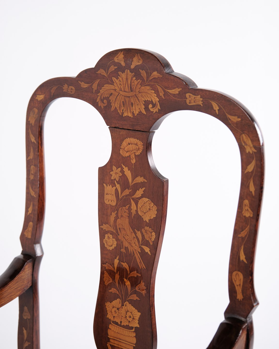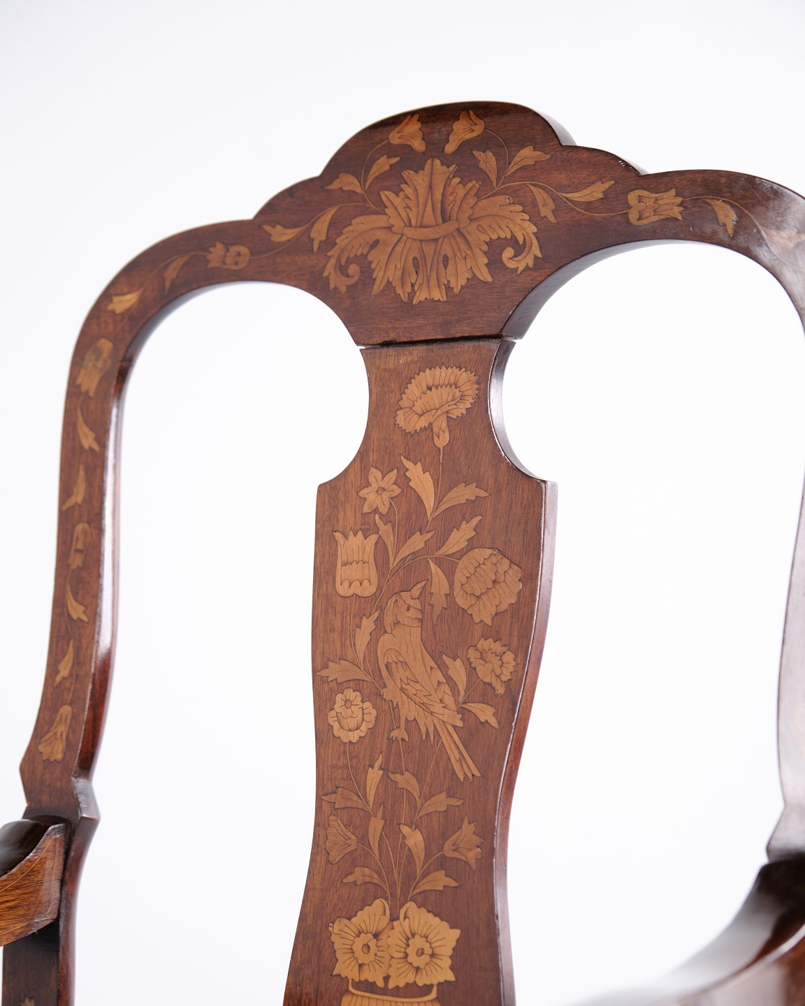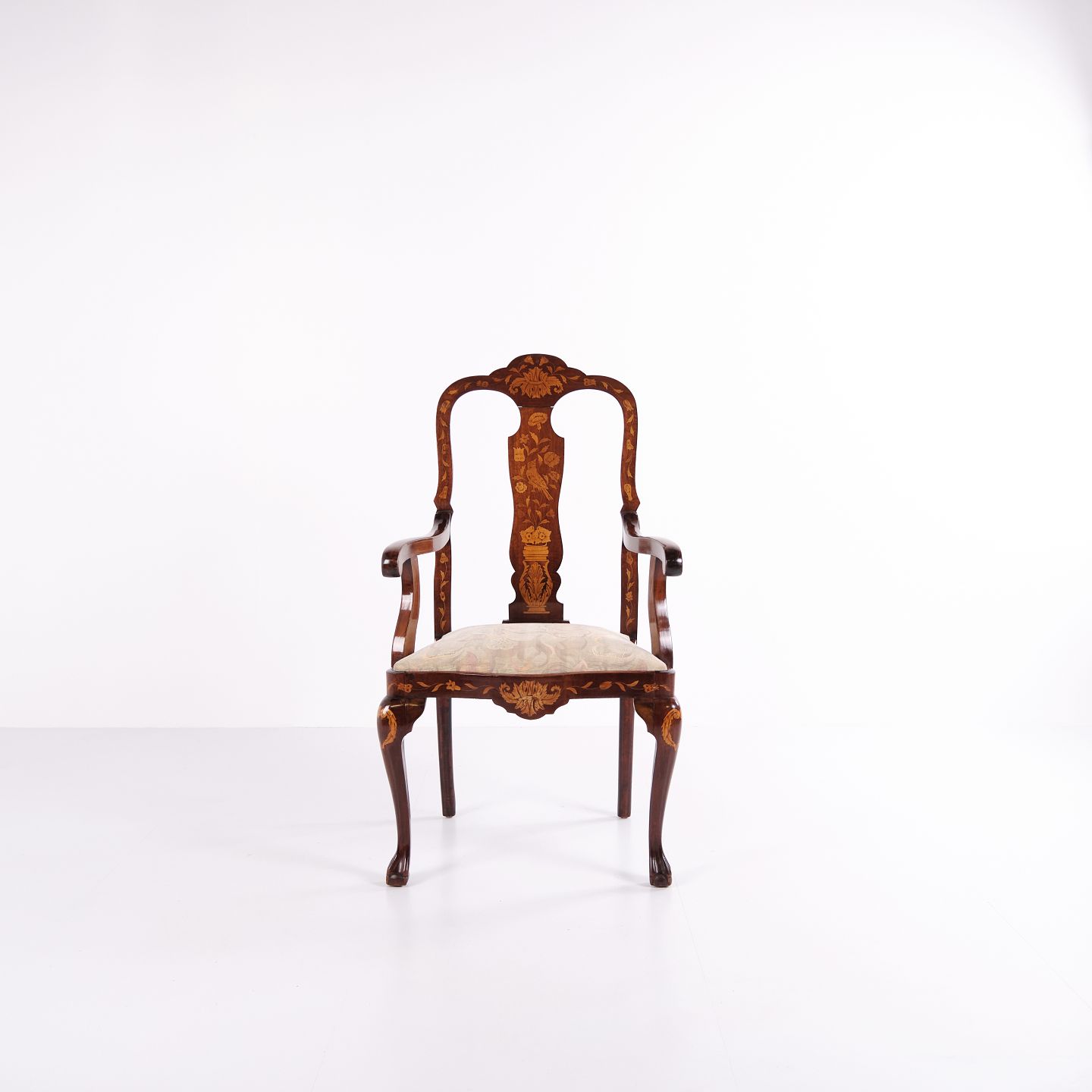 Armstol fra midten af 1800-tallet udført i nøddetræ med rigt frugttræ-intarsia i klassisk Queen Anne stil. Dekoreret med detaljerede motiver af blomster, fugle og sommerfugle. Overfladen er håndpoleret med shellak, hvilket fremhæver træets varme glød og det fine håndværk.
