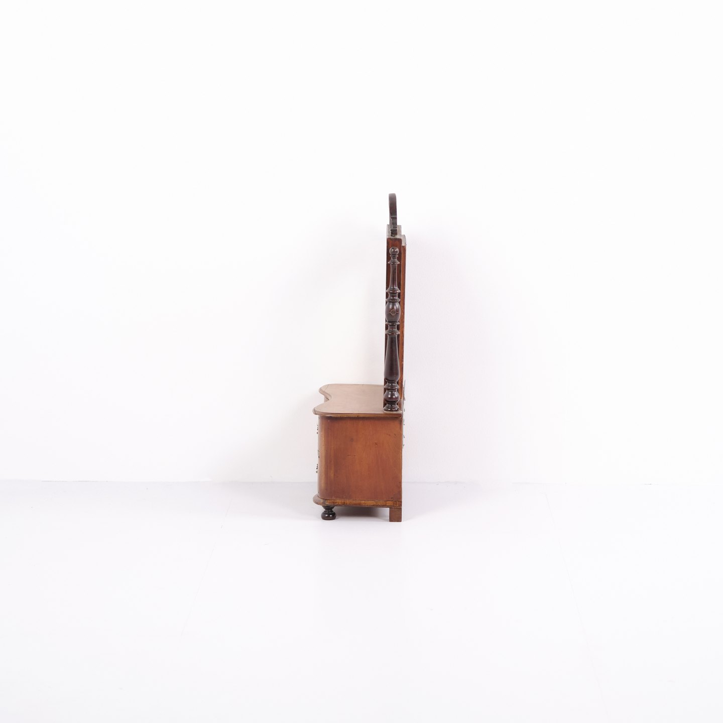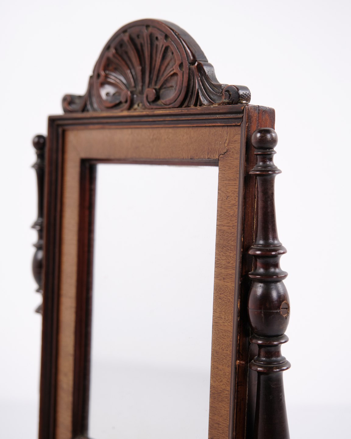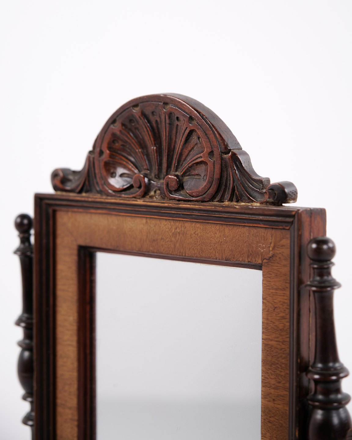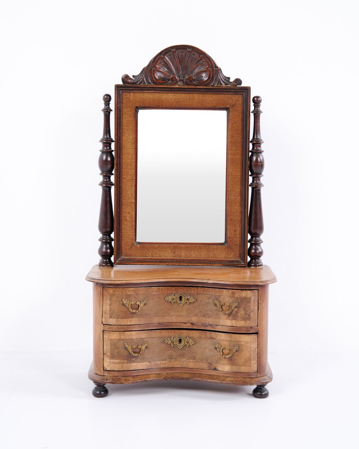 Lille barnemøbel fra ca. 1860, udført i mahogni med spejl og to skuffer. Et dekorativt og sjældent antikt møbel med fine detaljer, velegnet som samlerobjekt eller til klassisk indretning.