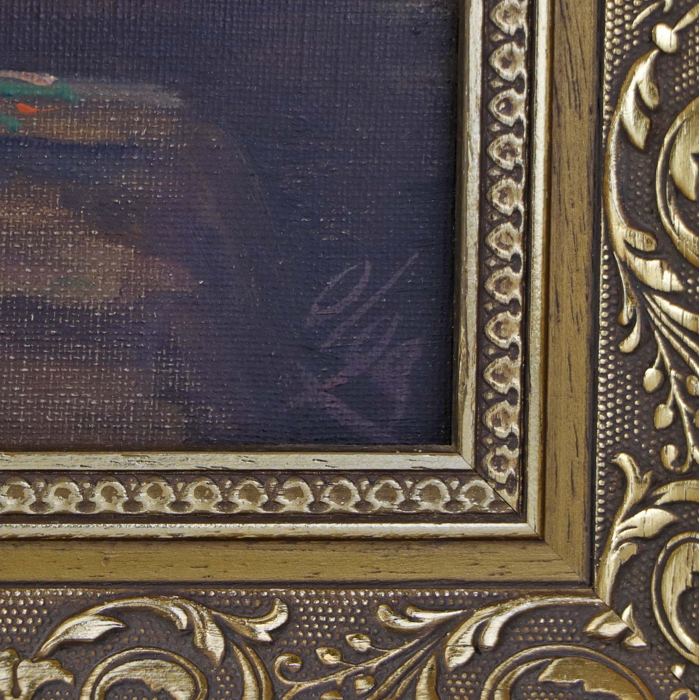 Oliemaleri på lærred i guldmalet træramme med stilleben motiv af blomster i vindueskarm.