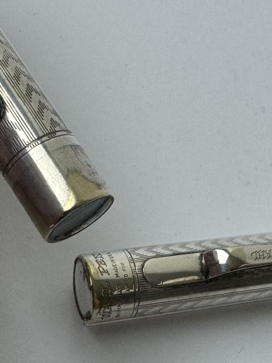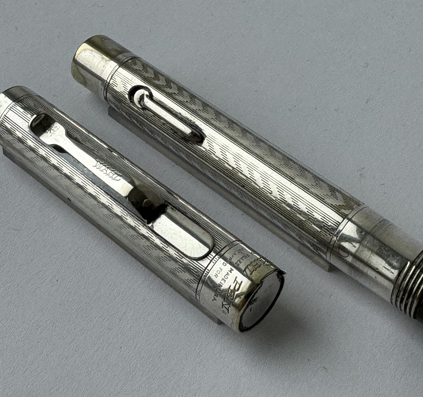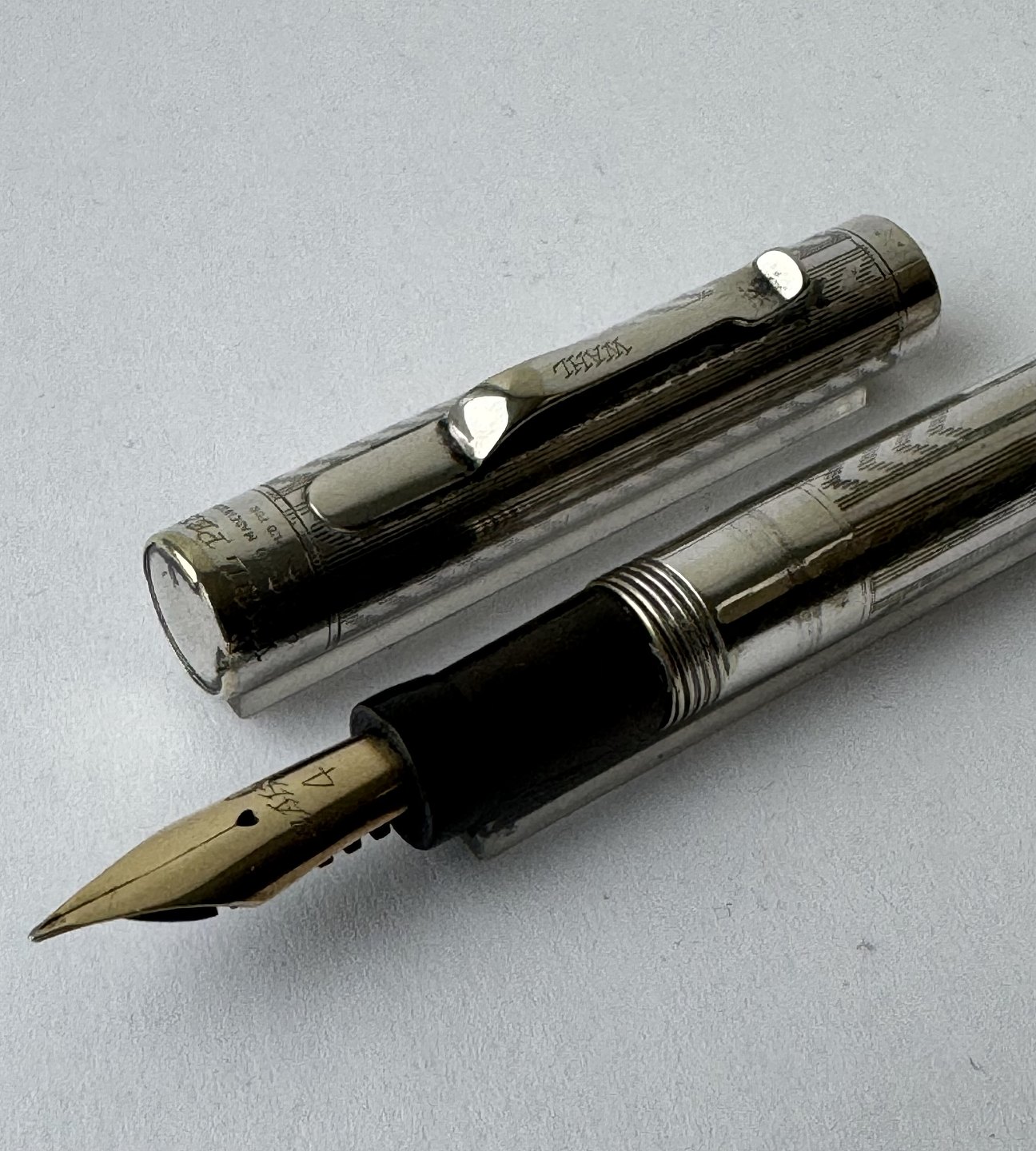 Elegant Wahl no. 4 fountain pen in silver plated. Decorated with a Chevron pattern on the surface. Made in the U.S.A. in the 1920s. In good condition without damage. Lever filler. A new rubber sack must be inserted before the pen can absorb ink and write again. There are some signs of wear on the end of the surface where the silver is worn (see photo).