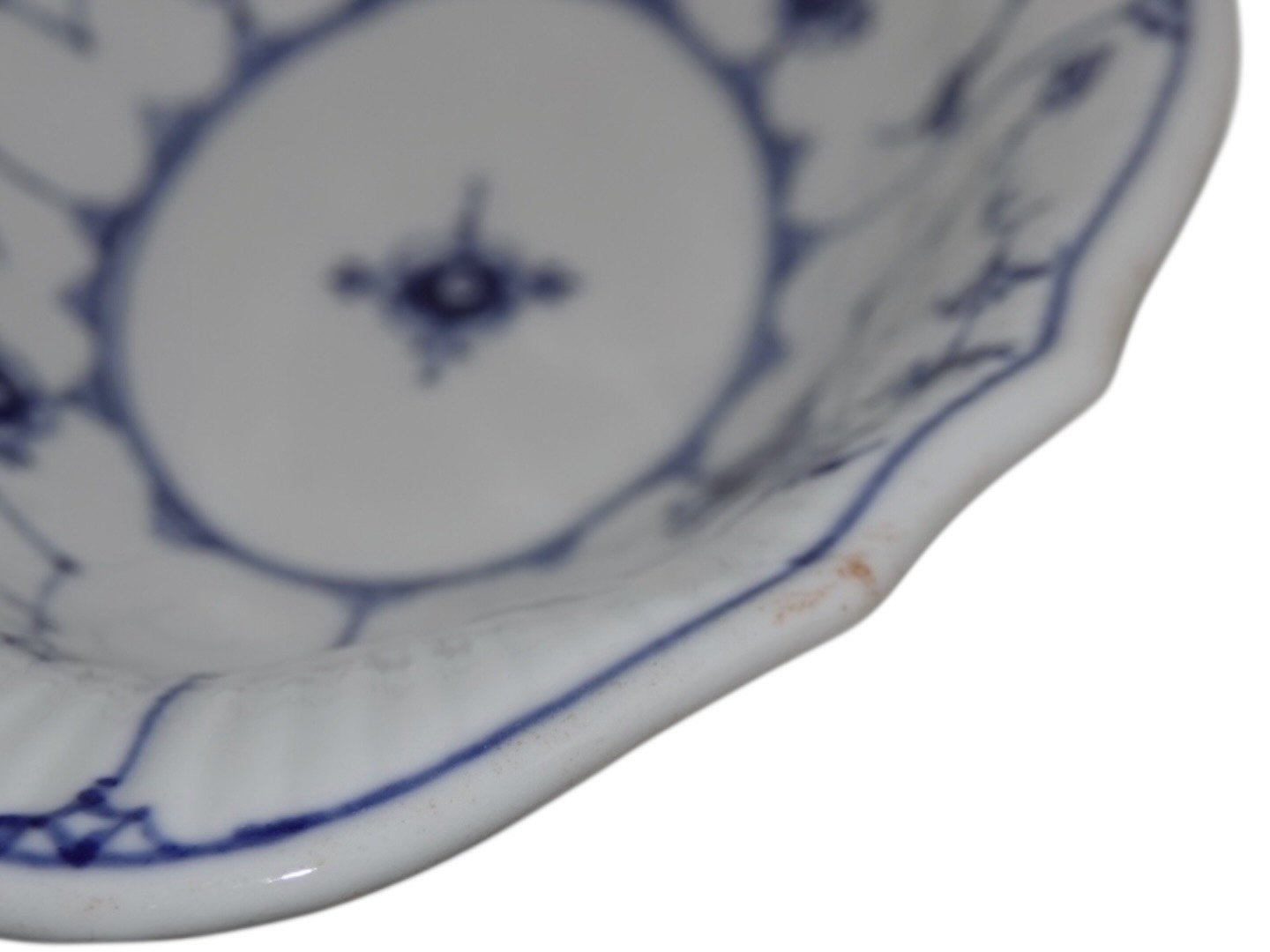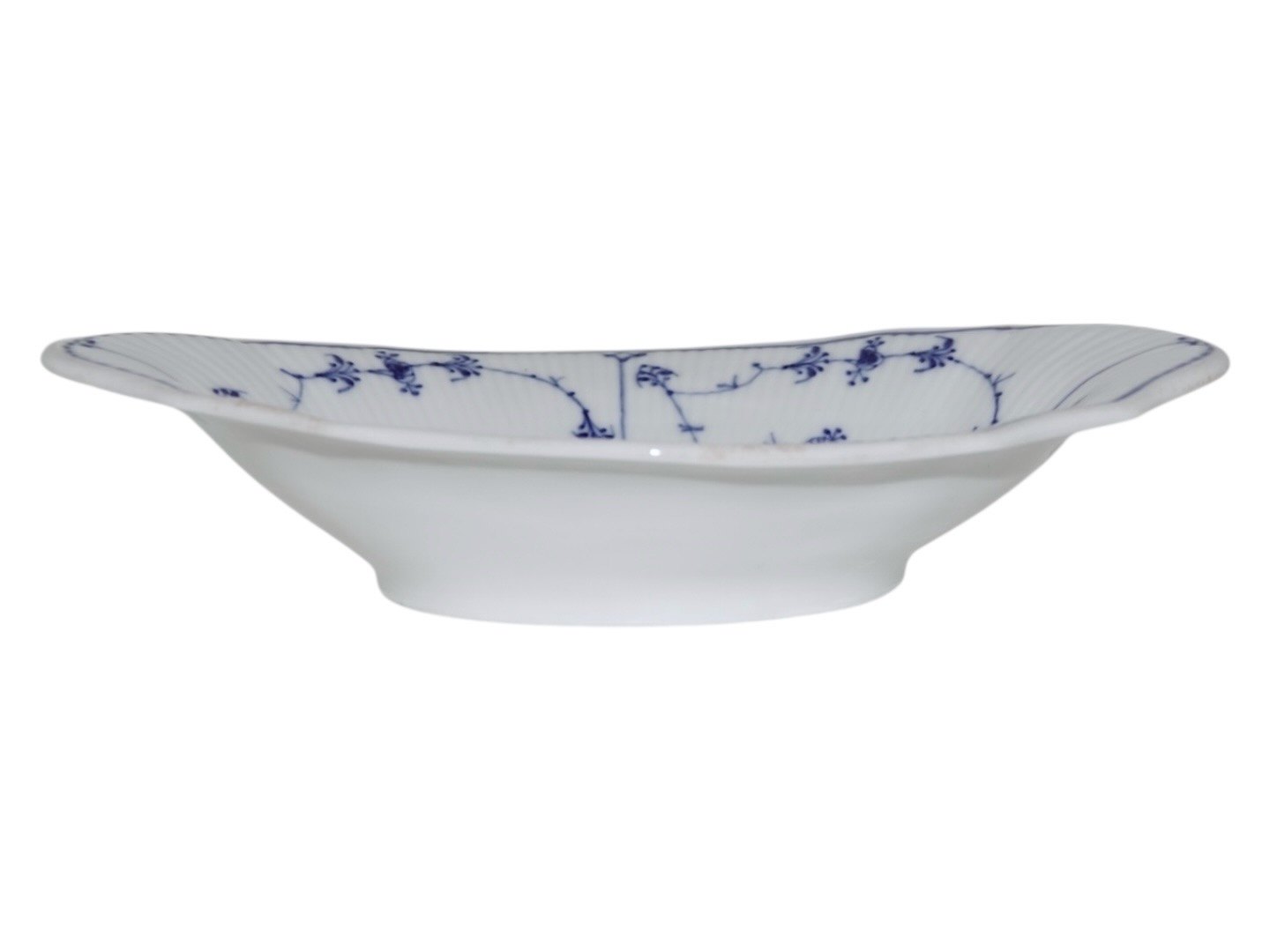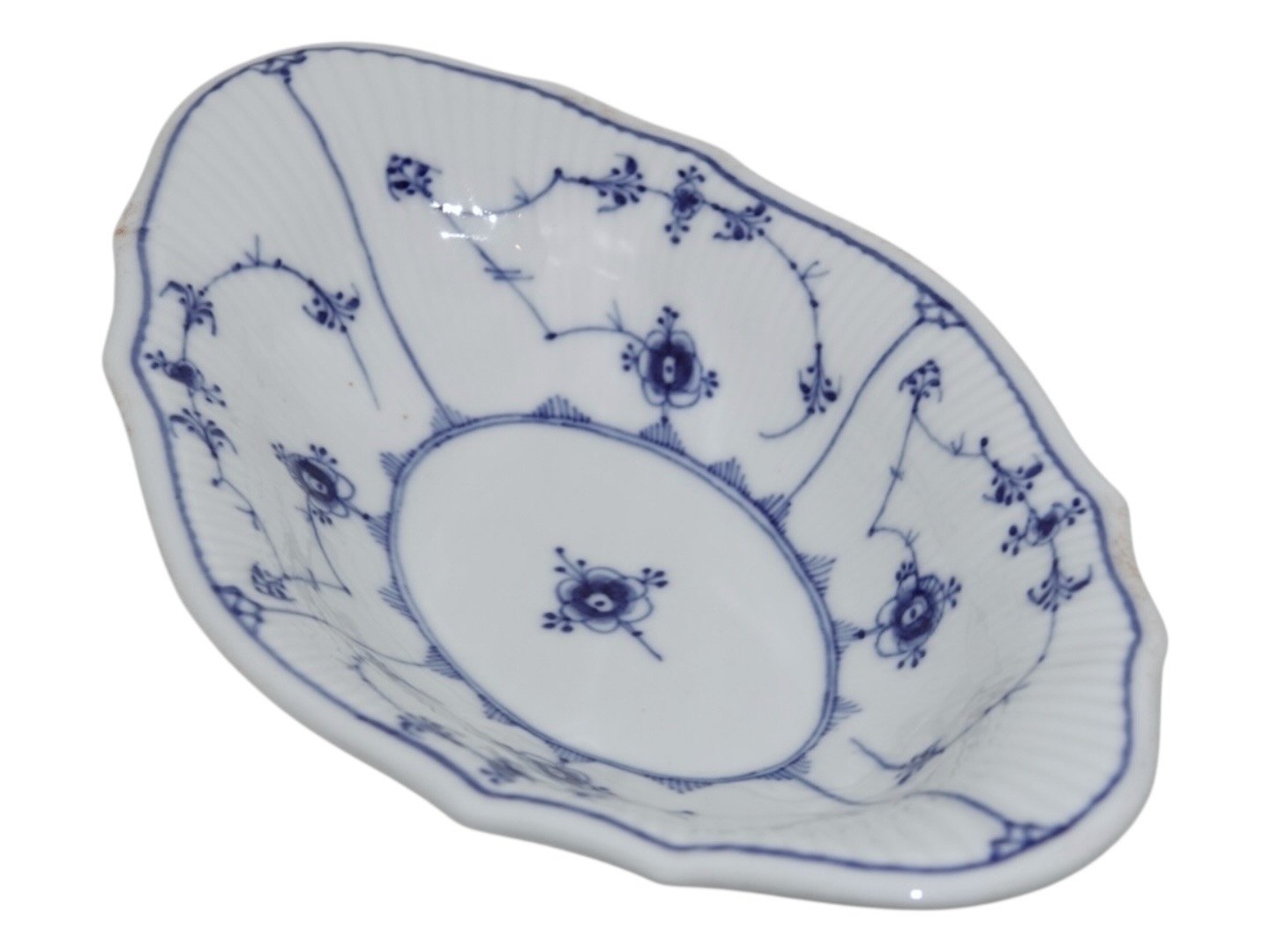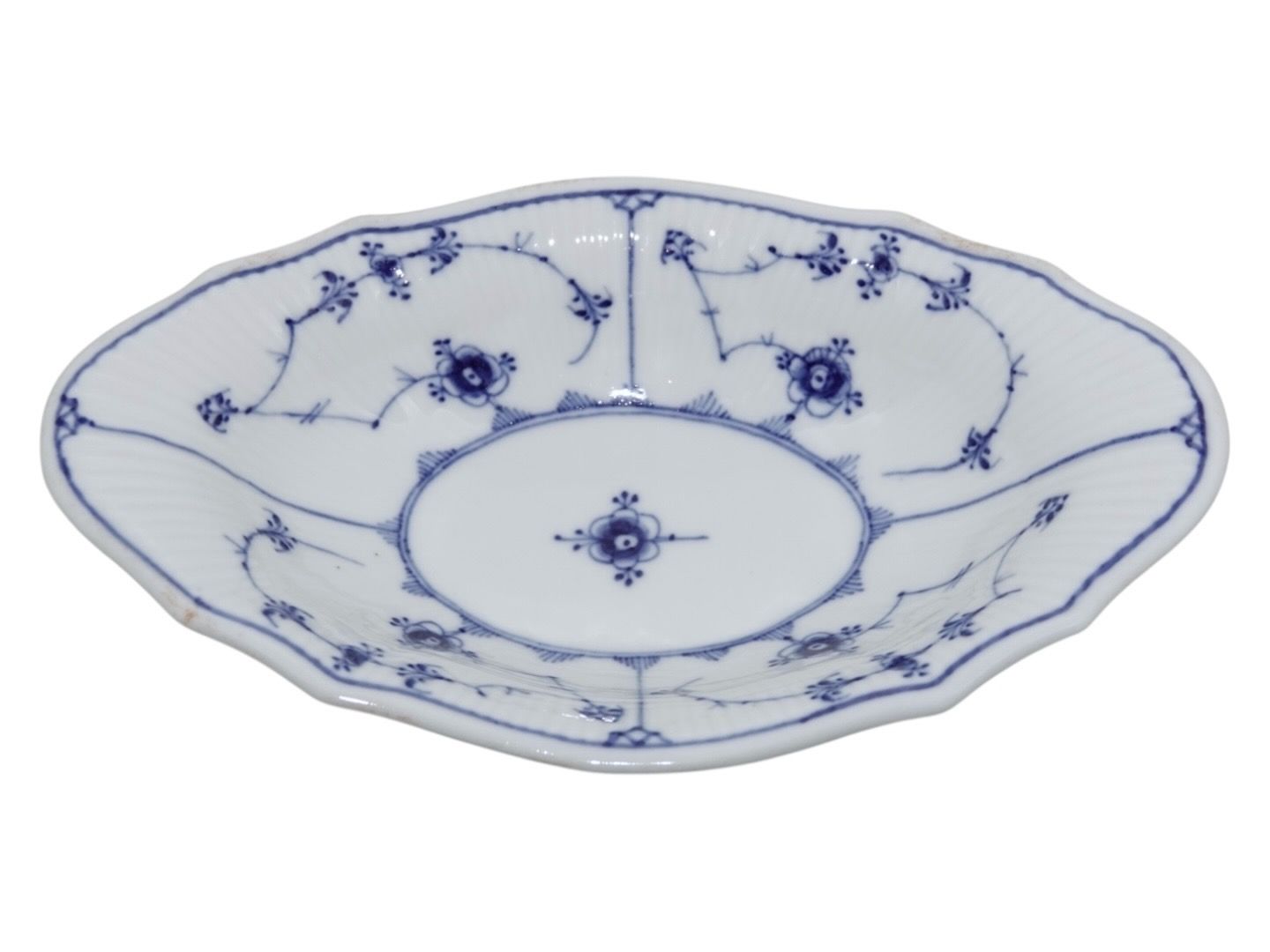 Bing & Grøndahl Blåmalet Riflet / Musselmalet Riflet, sjælden oval skål med bølget kant.