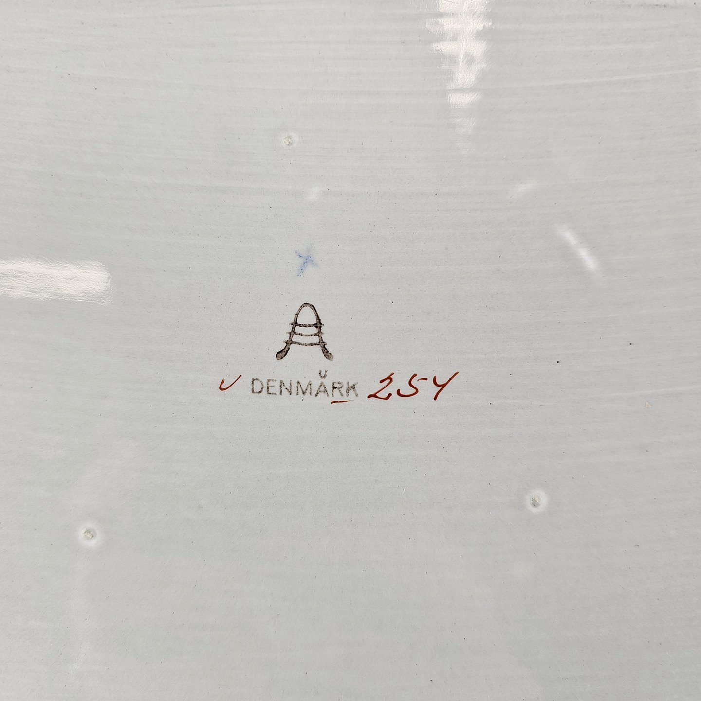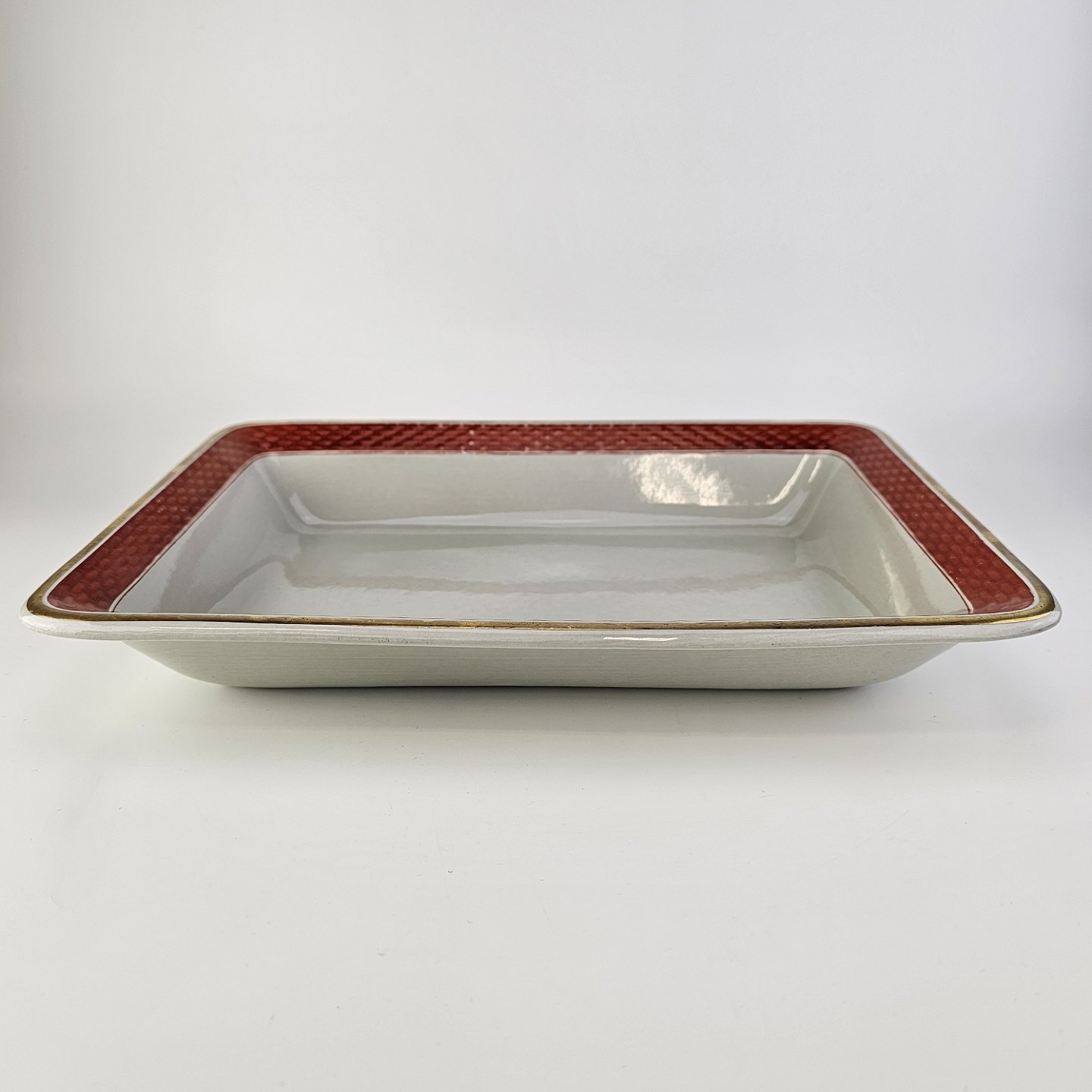 Tureby er stel i fajance dekoreret med rødt bånd og guldkant